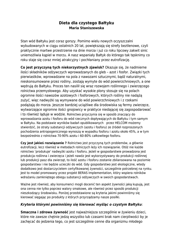 Dieta dla czystego Bałtyku Maria Staniszewska Stan wód Bałtyku jest coraz gorszy. Pomimo wielu nowych oczyszczalni wybudowanych w ciągu ostatnich 20 lat, powiększają się strefy beztlenowe, czyli praktycznie martwe przestrzenie na dnie morza i już co roku lipcowy zakwit sinic uniemożliwia kąpiel w morzu. A nasz wspaniały Bałtyk do którego tak tęsknimy co roku staje się coraz mniej atrakcyjny i pochłaniany przez eutrofizację. Co jest przyczyną tych niekorzystnych zjawisk? Okazuje się, że nadmierne ilości składników odżywczych wprowadzanych do gleb – azot i fosfor. Związki tych pierwiastków, wprowadzane na pola z nawozami sztucznymi, bądź naturalnymi, nieskonsumowane przez rośliny, zostają wymyte do wód powierzchniowych, a one wędrują do Bałtyku. Proces ten nasilił się wraz rozwojem roślinnego i zwierzęcego rolnictwa przemysłowego. Aby uzyskać wysokie plony stosuje się na polach ogromne ilości nawozów azotowych i fosforowych, których rośliny nie nadążą zużyć, więc nadwyżki są wymywane do wód powierzchniowych i z rzekami podążają do morza. Jeszcze bardziej uciążliwe dla środowiska są fermy zwierzęce, wytwarzające ogromne ilości gnojowicy w praktyce niedającej się zagospodarować i to również ląduje w wodzie. Rolnictwo przyczynia się w sposób znaczący do wprowadzania azotu i fosforu do wód rzecznych dopływających do Bałtyku i tym samym w Bałtyku. Na podstawie wyników badań opublikowanych przez HELCOM możemy stwierdzić, że straty substancji odżywczych (azotu i fosforu) ze źródeł rozproszonych pochodzenia antropogenicznego wynoszą w wypadku fosforu i azotu około 45%, a w tym bezpośrednio z rolnictwa 70-90% azotu i 60-80% całkowitego fosforu. Czy jest jakieś rozwiązanie ? Rolnictwo jest przyczyną tych problemów, a głównie eutrofizacji, lecz również w metodach rolniczych leży ich rozwiązanie. Otóż nie każde rolnictwo ‘produkuje’ nadwyżki azotu i fosforu. Jeżeli w gospodarstwie prowadzona jest produkcja roślinna i zwierzęca i jeżeli nawóz jest wykorzystywany do produkcji roślinnej lub produkcji pasz dla zwierząt, to ilość azotu i fosforu zostanie zbilansowana na poziomie gospodarstwa i nie będzie ucieczki do wód. Gdy gospodarstwo jest ekologiczne, wtedy dodatkowo jest dostarczycielem certyfikowanej żywności, szczególnie potrzebnej na rynku. Jest to model promowany przez projekt BERAS Implementation, który wspiera rolników wdrażaniu zamkniętego obiegu substancji odżywczych w swoich gospodarstwach. Ważne jest również, aby konsumenci mogli docenić ten aspekt żywności jaką kupują, jest ona cenna nie tylko poprzez walory smakowe, ale również przez sposób produkcji nieszkodzący środowisku. Poniżej przedstawione są kryteria jakimi powinniśmy się kierować sięgając po produkty z których przyrządzamy nasze posiłki. Kryteria którymi powinniśmy się kierować myśląc o czystym Bałtyku: Smaczna i zdrowa żywność jest najważniejsza szczególnie w żywieniu dzieci, które nie zawsze chętnie jedzą wszystko lub czasami brak nam cierpliwości by je zachęcać do jedzenia tego, co jest szczególnie cenne dla organizmu młodego człowieka. Takie potrawy jak chleb i makaron z mąki pełnego przemiału, ryby charakterystyczne dla naszego morza, warzywa i owoce pochodzenia lokalnego nie cieszą się szczególnym uznaniem dzieci i dorosłych nawykłych do produktów wysoko przetworzonych. I to trzeba zmienić. Żywność ekologiczna powinna być w obecna w naszej diecie w coraz większym procencie. Powinniśmy osiągnąć 100% żywności ekologicznej na naszych stołach w ciągu 10 lat licząc od dziś. Żywność ekologiczna posiada większe wartości odżywcze, jak również jej sposób produkcji ogranicza zanieczyszczenia płynące do środowiska Żywność produkowana lokalnie jest szczególnie ważna dla naszego zdrowia. Żywność z naszej strefy klimatycznej dostarcza nam właściwych składników odżywczych, których potrzebujemy w danym klimacie jakim żyjemy w trakcie zmieniających się pór roku Znakomitą wartość mają tradycyjne lokalne potrawy i przepisy przechowywane od pokoleń i sprawdzone w danych warunkach klimatycznych. Żywność zgodna z porą roku. Nasze organizmy są przyzwyczajone do żywności zgodnych z czteroma porami roku. Inaczej odżywiamy się podczas gorącego lata, wietrznej jesieni, mroźnej zimy i zmiennej pogodowo wiosny. Żywność właściwie zbilansowana. Powinniśmy spożywać więcej warzyw i owoców, produktów z mąk pełnego przemiału, ryby, a zdecydowanie mniej mięsa każdego rodzaju: wołowiny, wieprzowiny i kurczaków. Właściwe proporcje to 80% warzyw, owoców i produktów mącznych i 20% produktów mięsnych. Brak resztek żywności. Produkcja żywności prawdziwie zbilansowanej to również brak resztek. Nie powinniśmy zostawiać żywności na talerzach, należy brać tylko tyle ile możemy zjeść. W kuchni również nie powinniśmy przygotowywać więcej żywności niż jest na nią zapotrzebowanie. Więcej informacji na stronach internetowych: http://www.rolnictwodlabaltyku.pl i http://www.solidarnoscri.pl