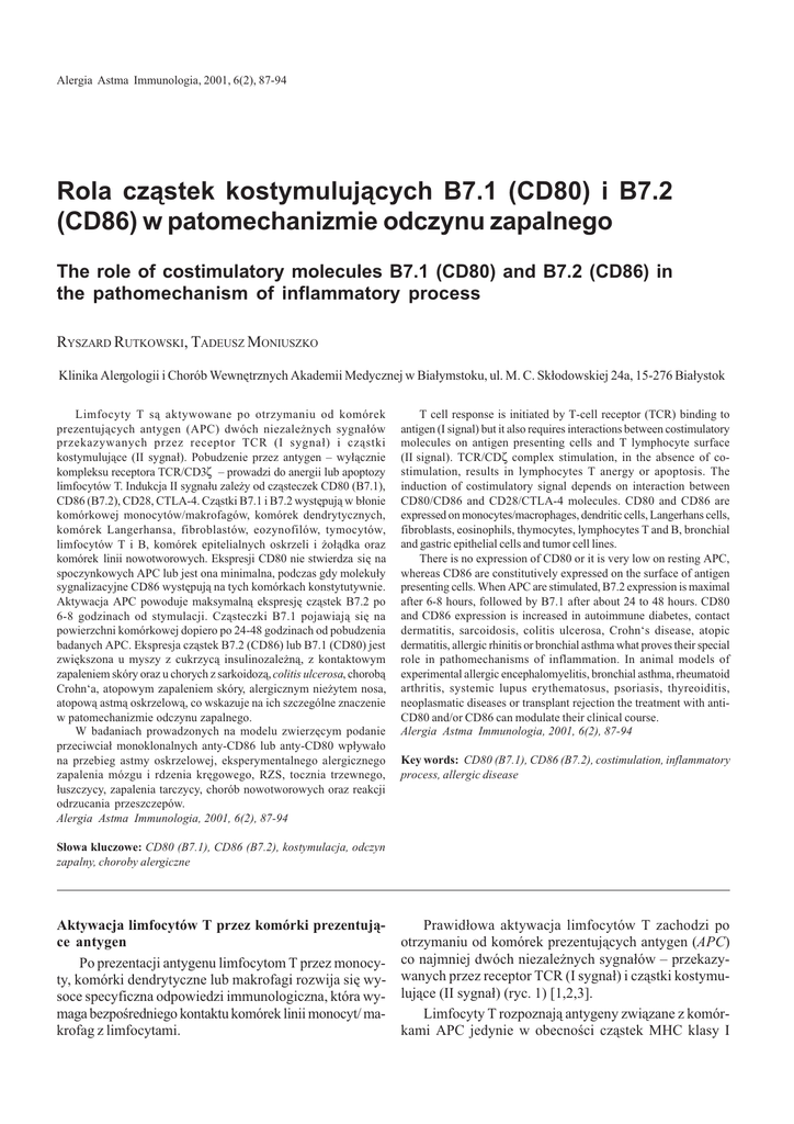Alergia Astma Immunologia, 6(2), 87-94T. Rutkowski 2001, R., Moniuszko Rola cz¹stek kostymuluj¹cych B7.1 (CD80) i B7.2 (CD86) . . . 87 Rola cz¹stek kostymuluj¹cych B7.1 (CD80) i B7.2 (CD86) w patomechanizmie odczynu zapalnego The role of costimulatory molecules B7.1 (CD80) and B7.2 (CD86) in the pathomechanism of inflammatory process RYSZARD RUTKOWSKI, TADEUSZ MONIUSZKO Klinika Alergologii i Chorób Wewnêtrznych Akademii Medycznej w Bia³ymstoku, ul. M. C. Sk³odowskiej 24a, 15-276 Bia³ystok Limfocyty T s¹ aktywowane po otrzymaniu od komórek prezentuj¹cych antygen (APC) dwóch niezale¿nych sygna³ów przekazywanych przez receptor TCR (I sygna³) i cz¹stki kostymuluj¹ce (II sygna³). Pobudzenie przez antygen wy³¹cznie kompleksu receptora TCR/CD3ζ prowadzi do anergii lub apoptozy limfocytów T. Indukcja II sygna³u zale¿y od cz¹steczek CD80 (B7.1), CD86 (B7.2), CD28, CTLA-4. Cz¹stki B7.1 i B7.2 wystêpuj¹ w b³onie komórkowej monocytów/makrofagów, komórek dendrytycznych, komórek Langerhansa, fibroblastów, eozynofilów, tymocytów, limfocytów T i B, komórek epitelialnych oskrzeli i ¿o³¹dka oraz komórek linii nowotworowych. Ekspresji CD80 nie stwierdza siê na spoczynkowych APC lub jest ona minimalna, podczas gdy moleku³y sygnalizacyjne CD86 wystêpuj¹ na tych komórkach konstytutywnie. Aktywacja APC powoduje maksymaln¹ ekspresjê cz¹stek B7.2 po 6-8 godzinach od stymulacji. Cz¹steczki B7.1 pojawiaj¹ siê na powierzchni komórkowej dopiero po 24-48 godzinach od pobudzenia badanych APC. Ekspresja cz¹stek B7.2 (CD86) lub B7.1 (CD80) jest zwiêkszona u myszy z cukrzyc¹ insulinozale¿n¹, z kontaktowym zapaleniem skóry oraz u chorych z sarkoidoz¹, colitis ulcerosa, chorob¹ Crohna, atopowym zapaleniem skóry, alergicznym nie¿ytem nosa, atopow¹ astm¹ oskrzelow¹, co wskazuje na ich szczególne znaczenie w patomechanizmie odczynu zapalnego. W badaniach prowadzonych na modelu zwierzêcym podanie przeciwcia³ monoklonalnych anty-CD86 lub anty-CD80 wp³ywa³o na przebieg astmy oskrzelowej, eksperymentalnego alergicznego zapalenia mózgu i rdzenia krêgowego, RZS, tocznia trzewnego, ³uszczycy, zapalenia tarczycy, chorób nowotworowych oraz reakcji odrzucania przeszczepów. Alergia Astma Immunologia, 2001, 6(2), 87-94 T cell response is initiated by T-cell receptor (TCR) binding to antigen (I signal) but it also requires interactions between costimulatory molecules on antigen presenting cells and T lymphocyte surface (II signal). TCR/CDζ complex stimulation, in the absence of costimulation, results in lymphocytes T anergy or apoptosis. The induction of costimulatory signal depends on interaction between CD80/CD86 and CD28/CTLA-4 molecules. CD80 and CD86 are expressed on monocytes/macrophages, dendritic cells, Langerhans cells, fibroblasts, eosinophils, thymocytes, lymphocytes T and B, bronchial and gastric epithelial cells and tumor cell lines. There is no expression of CD80 or it is very low on resting APC, whereas CD86 are constitutively expressed on the surface of antigen presenting cells. When APC are stimulated, B7.2 expression is maximal after 6-8 hours, followed by B7.1 after about 24 to 48 hours. CD80 and CD86 expression is increased in autoimmune diabetes, contact dermatitis, sarcoidosis, colitis ulcerosa, Crohns disease, atopic dermatitis, allergic rhinitis or bronchial asthma what proves their special role in pathomechanisms of inflammation. In animal models of experimental allergic encephalomyelitis, bronchial asthma, rheumatoid arthritis, systemic lupus erythematosus, psoriasis, thyreoiditis, neoplasmatic diseases or transplant rejection the treatment with antiCD80 and/or CD86 can modulate their clinical course. Alergia Astma Immunologia, 2001, 6(2), 87-94 Key words: CD80 (B7.1), CD86 (B7.2), costimulation, inflammatory process, allergic disease S³owa kluczowe: CD80 (B7.1), CD86 (B7.2), kostymulacja, odczyn zapalny, choroby alergiczne Aktywacja limfocytów T przez komórki prezentuj¹ce antygen Po prezentacji antygenu limfocytom T przez monocyty, komórki dendrytyczne lub makrofagi rozwija siê wysoce specyficzna odpowiedzi immunologiczna, która wymaga bezporedniego kontaktu komórek linii monocyt/ makrofag z limfocytami. Prawid³owa aktywacja limfocytów T zachodzi po otrzymaniu od komórek prezentuj¹cych antygen (APC) co najmniej dwóch niezale¿nych sygna³ów przekazywanych przez receptor TCR (I sygna³) i cz¹stki kostymuluj¹ce (II sygna³) (ryc. 1) [1,2,3]. Limfocyty T rozpoznaj¹ antygeny zwi¹zane z komórkami APC jedynie w obecnoci cz¹stek MHC klasy I Alergia Astma Immunologia, 2001, 6(2), 87-94 88 ANTYGEN CD80 ( B7.1 ) CD86 / B 7.2 MONOCYTY ( APC ) CD86 ( B7.2 ) CD80 / B 7.1 II SYGNA£ II SYGNA£ I SYGNA£ CD28 TCR CTLA - 4 LIMFOCYTY Th1/Th2 AKTYWACJA LIMFOCYTÓW T HAMOWANIE AKTYWACJI LIMFOCYTÓW T Ryc. 1. Wp³yw cz¹stek kostymuluj¹cych na aktywacjê limfocytów T hipoteza dwóch sygna³ów (CD8+) lub klasy II (CD4+) [3,4,5]. Zjawisko rozpoznawania obcych antygenów w po³¹czeniu z w³aciw¹ cz¹steczk¹ MHC okrelane jest jako tzw. restrykcja MHC i stanowi podstawow¹ cechê uk³adu odpornociowego. Antygeny egzogenne (np., bakterie pozakomórkowe, toksyny bakteryjne, antygeny grzybów, alergeny py³ków traw, kurzu domowego), po wnikniêciu do organizmu w procesie fagocytozy lub pinocytozy s¹ poch³aniane przez APC. Nastêpnie, w fagolizosomach komórek prezentuj¹cych antygen ulegaj¹ rozk³adowi na peptydy. Proces degradacji antygenów do cz¹stek peptydowych zachodzi przy udziale licznych proteaz wewn¹trzkomórkowych (cysteinowe, serynowe, karboksylowe i metaloproteazy). W kolejnym etapie peptydy antygenowe, z³o¿one z oko³o 10-20 aminokwasów, ³¹cz¹ siê z cz¹steczkami MHC klasy II i, po powrocie na powierzchniê b³ony komórkowej, s¹ prezentowane limfocytom CD4+ [5,6]. Po³¹czenie antygenu z kompleksem TCR-CD3 aktywuje niereceptorowe kinazy tyrozynowe z rodziny Src (p56lck, p59fyn), co fosforyluje reszty tyrozy