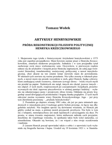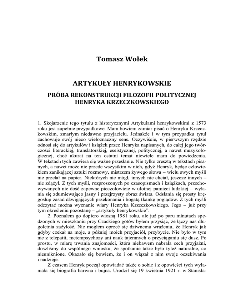 Tomasz Wołek ARTYKUŁY HENRYKOWSKIE PRÓBA REKONSTRUKCJI FILOZOFII POLITYCZNEJ HENRYKA KRZECZKOWSKIEGO 1. Skojarzenie tego tytułu z historycznymi Artykułami henrykowskimi z 1573 roku jest zupełnie przypadkowe. Mam bowiem zamiar pisać o Henryku Krzeczkowskim, zmarłym niedawno przyjacielu. Jednakże i w tym przypadku tytuł zachowuje swój nieco wieloznaczny sens. Oczywiście, w pierwszym rzędzie odnosi się do artykułów i książek przez Henryka napisanych, do całej jego twórczości literackiej, translatorskiej, eseistycznej, politycznej, a nawet muzykologicznej, choć akurat na ten ostatni temat niewiele mam do powiedzenia. W tekstach tych zawiera się ważne przesłanie. Nie tylko zresztą w tekstach pisanych, a nawet może nie przede wszystkim w nich, gdyż Henryk, będąc człowiekiem zanikającej sztuki rozmowy, mistrzem żywego słowa – wielu swych myśli nie przelał na papier. Niektórych nie mógł, innych nie chciał, jeszcze innych – nie zdążył. Z tych myśli, rozproszonych po czasopismach i książkach, przechowywanych nie dość zapewne pieczołowicie w ulotnej pamięci ludzkiej – wyłania się zdumiewająco jasny i przejrzysty obraz świata. Odsłania się prosty kręgosłup zasad dźwigających przekonania i bogatą tkankę poglądów. Z tych myśli odczytać można wyznanie wiary Henryka Krzeczkowskiego. Jego – już przy tym określeniu pozostanę – „artykuły henrykowskie”. 2. Poznałem go dopiero wiosną 1981 roku, ale już po paru minutach spędzonych w mieszkaniu przy Czackiego gotów byłem przysiąc, że łączy nas długoletnia zażyłość. Nie mogłem oprzeć się dziwnemu wrażeniu, że Henryk jak gdyby czekał na moje, a później moich przyjaciół, przybycie. Nie było w tym nic z telepatii, metempsychozy ani nauk tajemnych o przyciąganiu się dusz. Po prostu, w miarę trwania znajomości, która niebawem nabrała cech przyjaźni, doszliśmy do wspólnego wniosku, że spotkanie takie było tyleż naturalne, co nieuniknione. Okazało się bowiem, że i on wiązał z nim swoje oczekiwania i nadzieje. Z czasem Henryk począł opowiadać także o sobie i z opowieści tych wyłaniała się biografia barwna i bujna. Urodził się 19 kwietnia 1921 r. w Stanisła- 372 TOMASZ WOŁEK wowie, gdzie ukończył gimnazjum. Wojna i będący jej następstwem exodus rzucił go na zesłanie do odległego „posiółka” w głębi Rosji. Stamtąd po najróżniejszych perypetiach przedostał się do formowanej w ZSRR polskiej armii, z którą następnie przebył szlak bitewny aż do Berlina. Po wojnie został w wojsku służąc w Oddziale II Sztabu Generalnego. Był m.in. tłumaczem gen. Eisenhowera podczas jego pobytu w Warszawie, odbył misję wojskową we Włoszech i Anglii. Na początku 1950 r. zrzucił mundur, w tym okresie już właściwie nic wspólnego niemający z polskością. Jak twierdził, przy pomocy przyjaciół sprokurował sytuację, która spowodowała usunięcie go z armii. Był to czas intensywnej sowietyzacji wojska, wkrótce wchodzącej w stadium procesów Tatara, Kirchmayera i innych oficerów. Henryk podjął decyzję: dokonany wybór pozostawił go praktycznie na bruku. Na krótko zdołał zatrudnić się w redakcji radiowej, później ratował się korepetycjami z angielskiego, był wreszcie kimś w rodzaju ni to woźnego, ni to bibliotekarza w PAN-ie. Po październiku 1956 roku został sekretarzem redakcji „Europy”, pisma, które w rezultacie nie ujrzało światła dziennego. Przez dwa lata pełnił funkcję recenzenta literackiego „Expressu Wieczornego”, a w 1957 r. przetłumaczył i wydał Eseje wybrane Hazlitta. W połowie lat 60-tych podjął stałą współpracę z „Tygodnikiem Powszechnym”, z czasem zostając członkiem jego redakcji. Swoje teksty publikował także w „Znaku”, „Twórczości”, „Kulturze” paryskiej, „Ruchu Muzycznym”, Przede wszystkim jednak był wybitnym tłumaczem i edytorem. Całość tego bogatego dorobku winien objąć szkic bardziej specjalistyczny. Na użytek niniejszych rozważań warto jednak – w największym skrócie – przypomnieć, że Henryk Krzeczkowski swą pracą translatorską przyswoił kulturze polskiej dzieła tak znamienite, jak Złota gałąź J. G. Frazera, Mity greckie R. Gravesa, Spadkobiercy J. Conrada, Dzienniki G. Byrona, Podróż włoska Goethego, Krucjata w Europie D. Eisenhowera, Dzieje dramatu A. Nicolla, Główne nurty myśli amerykańskiej V. L. Parringtona, Elżbieta I J. E. Neale’a. Tłumaczył również m.in. Stone’a, Wilsona, Simmonsa, Cheevera, Braine’a, Snowa, Rognoniego, Calvino, Narayana. Wydał szereg antologii (np. Poeci języka angielskiego wraz z Jerzym S. Sito i Juliuszem Żuławskim), prowadził i opracował cenną serię edytorską „Wielcy pisarze w oczach krytyki światowej”. Sam był autorem trzech książek Po namyśle (1977, Znak), jako XYZ – O miejsce dla roztropności (1979, Odnowa, Londyn) i jako Mikołaj Sawulak – Polskie zmartwienia (1983, Odnowa). Nie zdążył dokończyć dzieła wielu lat życia – pracy o Marku Twainie, nie doczekał też ukazania się przekładu Mikołaja I, książki, do której przywiązywał wagę szczególną. Nie zdołał niestety również doprowadzić do końca zbioru własnych esejów Egzystencja katylinarna. Zmarł po ciężkiej chorobie 28 grudnia 1985 roku. ARTYKUŁY HENRYKOWSKIE. PRÓBA REKONSTRUKCJI FILOZOFII POLITYCZNEJ… 373 3. Ten intelektualista europejskiego formatu (piszę to z pełnym przekonaniem a jednocześnie z duszą na ramieniu, mając poczucie, że Henryk zżymałby się na takie określenie) w działalności publicznej właściwie nigdy nie tkwił na miejscu wyeksponowanym; nie był człowiekiem „pierwszej linii”. Zawsze pozostawał jakby w półcieniu, nie zabiegając o poklask opinii, o tanią popularność. Jednakże wpływ, jaki wywierał na wielu ludzi, na całe środowiska – był zupełnie wyjątkowy. Ów wpływ dokonywał się także za po