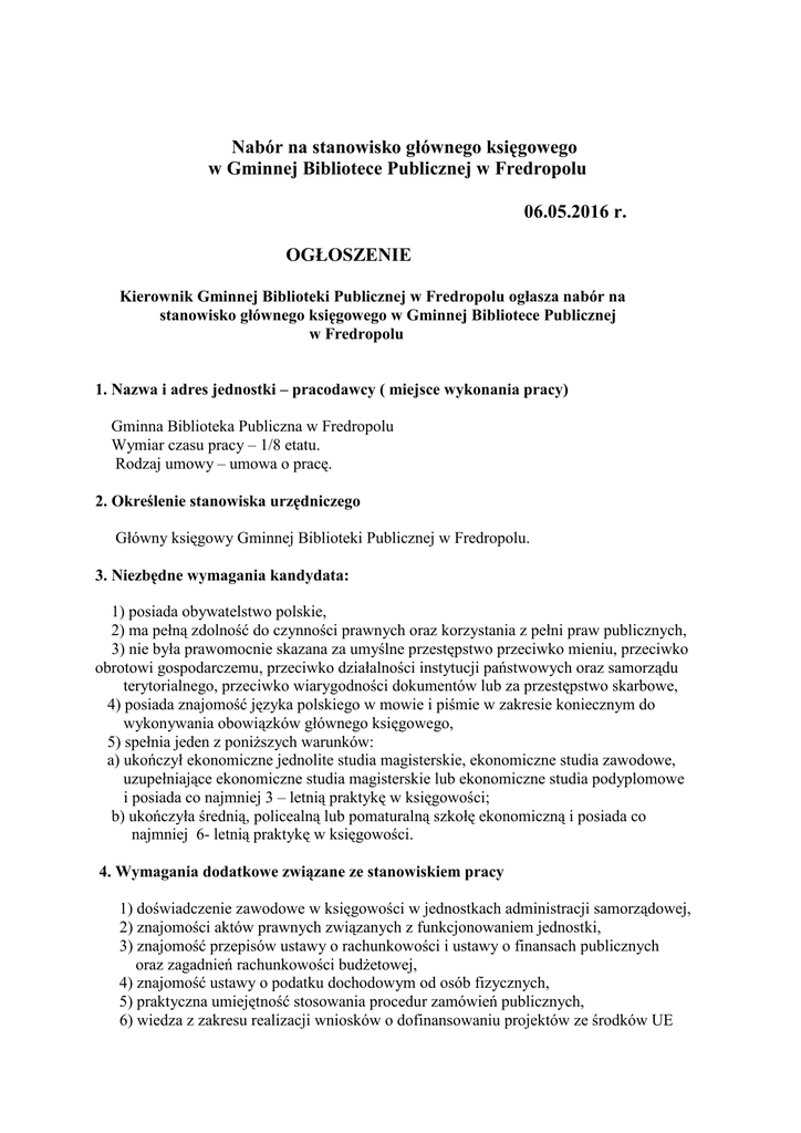 Nabór na stanowisko głównego księgowego w Gminnej Bibliotece Publicznej w Fredropolu 06.05.2016 r. OGŁOSZENIE Kierownik Gminnej Biblioteki Publicznej w Fredropolu ogłasza nabór na stanowisko głównego księgowego w Gminnej Bibliotece Publicznej w Fredropolu 1. Nazwa i adres jednostki – pracodawcy ( miejsce wykonania pracy) Gminna Biblioteka Publiczna w Fredropolu Wymiar czasu pracy – 1/8 etatu. Rodzaj umowy – umowa o pracę. 2. Określenie stanowiska urzędniczego Główny księgowy Gminnej Biblioteki Publicznej w Fredropolu. 3. Niezbędne wymagania kandydata: 1) posiada obywatelstwo polskie, 2) ma pełną zdolność do czynności prawnych oraz korzystania z pełni praw publicznych, 3) nie była prawomocnie skazana za umyślne przestępstwo przeciwko mieniu, przeciwko obrotowi gospodarczemu, przeciwko działalności instytucji państwowych oraz samorządu terytorialnego, przeciwko wiarygodności dokumentów lub za przestępstwo skarbowe, 4) posiada znajomość języka polskiego w mowie i piśmie w zakresie koniecznym do wykonywania obowiązków głównego księgowego, 5) spełnia jeden z poniŜszych warunków: a) ukończył ekonomiczne jednolite studia magisterskie, ekonomiczne studia zawodowe, uzupełniające ekonomiczne studia magisterskie lub ekonomiczne studia podyplomowe i posiada co najmniej 3 – letnią praktykę w księgowości; b) ukończyła średnią, policealną lub pomaturalną szkołę ekonomiczną i posiada co najmniej 6- letnią praktykę w księgowości. 4. Wymagania dodatkowe związane ze stanowiskiem pracy 1) doświadczenie zawodowe w księgowości w jednostkach administracji samorządowej, 2) znajomości aktów prawnych związanych z funkcjonowaniem jednostki, 3) znajomość przepisów ustawy o rachunkowości i ustawy o finansach publicznych oraz zagadnień rachunkowości budŜetowej, 4) znajomość ustawy o podatku dochodowym od osób fizycznych, 5) praktyczna umiejętność stosowania procedur zamówień publicznych, 6) wiedza z zakresu realizacji wniosków o dofinansowaniu projektów ze środków UE 7) umiejętności tworzenia wewnętrznych aktów prawnych i projektów umów, 8) biegła znajomość aplikacji komputerowych takich jak: program księgowy – plany finansowe, kadry i płace 9) kreatywność, umiejętność pracy w zespole, sumienność i rzetelność, dobra organizacja czasu pracy, gotowość do stałego podnoszenia swoich kwalifikacji, umiejętności podejmowania samodzielnych decyzji. 10) co najmniej 2 letni staŜ pracy na stanowisku księgowo – kadrowym 11) umotywowany staŜ pracy na stanowisku kadrowo - płacowym 5. Zakres wykonywanych zadań na stanowisku. 1) prowadzenie rachunkowości jednostki zgodnie z obowiązującymi przepisami; 2) prowadzenie prawidłowej gospodarki finansowo – księgowej Biblioteki; 3) nadzór i realizacja zadań finansowo – księgowych; 4) sporządzanie sprawozdań finansowych; 5) sporządzanie list płac, deklaracji podatkowych i deklaracji ZUS; 6) odpowiedzialność za całokształt prac związanych z działalnością finansowoksięgową jednostki; 7) prowadzenie kontroli finansowej i inne zadania wynikające z ustawy o rachunkowości Głównego Księgowego. 6. Wymagane dokumenty : 1) list motywacyjny 2) Curriculum Vitae; 3) zaświadczenie lekarskie o braku przeciwwskazań zdrowotnych do pracy na stanowisku głównego księgowego, 4) kopie dokumentów potwierdzających posiadanie wymaganego wykształcenia, kopie dokumentów o ukończonych kursach podnoszących kwalifikacje oraz kopie dokumentów potwierdzających wymagany staŜ pracy; 5) kserokopie dokumentów potwierdzających doświadczenie zawodowe kandydata; 6) oświadczenie, Ŝe kandydat nie był karany zakazem pełnienia funkcji związanych z dysponowaniem środkami publicznymi, o których mowa w art.31 ust.1 pkt.4 ustawy z dnia 17 grudnia 2004 r. o odpowiedzialności za naruszenie dyscypliny finansów publicznych ( tj. Dz. U. z 2013 r. poz.168 z późn.zm.); 7) oświadczenie kandydata o korzystaniu z pełni praw publicznych; 8) oświadczenie o niekaralności za przestępstwa określone w pkt.3.3; 9) oświadczenie o następującej treści: „WyraŜam zgodę na przetwarzanie danych osobowych zawartych w ofercie pracy dla potrzeb procesu naboru na stanowisko urzędnicze – główny księgowy w Gminnej Bibliotece Publicznej w Fredrpolu, zgodnie z ustawą z dnia 29 sierpnia 1997 r. o ochronie danych osobowych (tj. Dz. U. z 2002 r. Nr. 101, poz. 926 z późn. zm oraz ustawą z dnia 21 listopada 2008 r. o pracownikach samorządowych (Dz. U. Nr 223, poz. 1458 ze zm)”. 7. Miejsce i termin złoŜenia dokumentów Oferty naleŜy składać w zamkniętych kopertach z podanym adresem zwrotnym i dopiskiem „konkurs na stanowisko głównego księgowego w Gminnej Bibliotece Publicznej Fredropolu” w terminie do dnia 20.05.2016 r. do godz. 1200 na adres : Gminna Biblioteka Publiczna w Fredropolu 37-734 Fredropol woj. podkarpackie Liczy się data wpływu do Gminnej Biblioteki Publicznej w Fredropolu. Aplikacje, które wpłyną do Gminnej Biblioteki Publicznej po wyŜej określonym terminie nie będą rozpatrywane. Po ocenie wstępnej wymaganych dokumentów kandydaci zobowiązani są do poddania się rozmowie kwalifikacyjnej. O terminie rozmowy kwalifikacyjnej kandydaci zostaną powiadomieni telefonicznie. Informacja o wynikach konkursu będzie umieszczona na stronie BIP Gminy Fredropol oraz na tablicy informacyjnej Urzędu Gminy w Fredropolu 15.
