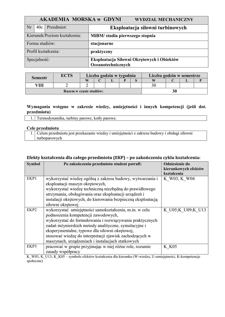 AKADEMIA MORSKA w GDYNI Eksploatacja siłowni turbinowych