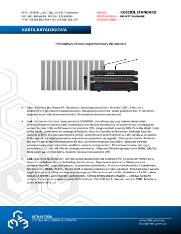 MTB - SYSTEM , Łęki 180C, 32-425 Trzemeśnia NIP : 681-195-68-82 REGON : 121304083 •Tel: +48 667-063-754 •Tel: +48 506-162-274 NAZWA : KOŚCIÓŁ STANDARD PRZEZNACZENIE : OBIEKTY SAKRALNE POWIERZCHNIA : - - - - - - - - KARTA KATALOGOWA Przykładowy zestaw nagłośnieniowy dla kościoła 12szt. Kolumny głośnikowe PA. Obudowa z tłoczonego aluminium, Technika 100V , 2-drożne, z dodatkowymi głośnikami wysokotonowymi. Wbudowana zwrotnica. Liczba głośników 8+4. 5-punktowy regulator mocy. Metalowa maskownica. W komplecie akcesoria montażowe. 1szt. Cyfrowy wzmacniacz nowej generacji 250WRMS , charakteryzujący się dużymi zdolnościami mocowymi przy niskich kosztach użytkowania oraz dłuższą żywotnością. W porównaniu z analogowymi wzmacniaczami 100V o efektywności na poziomie 70%, osiąga wartość powyżej 90%. Ponadto, dzięki małej emisji ciepła, praktycznie nie wymaga chłodzenia. Klasa D o wysokiej efektywności (redukcja kosztów zasilania o 90%). Funkcja oszczędzania energii: automatyczne przechodzenie w tryb standby w przypadku braku sygnału na wejściu (ponowne włączenie po pojawieniu się sygnału) .Cicha praca dzięki chłodzeniu bez wentylatora; idealne rozwiązanie dla biur, sal konferencyjnych, kościołów , Specjalne obwody zabezpieczające przed zwarciem, spadkiem napięcia i przegrzaniem , Rozbudowane menu sterujące, wyświetlacz LCD , Port RS-485 do zdalnego sterowania , Włączany filtr górnoprzepustowy 200Hz, 6dB/okt. Dodatkowe wejście priorytetu. Zasilanie sieciowe lub awaryjne 24V. 1szt. Eliminator sprzężeń DSP. Ochrona przed sprzężeniami dla systemów PA. 12 precyzyjnych filtrów o stromym nachyleniu zbocza dla każdego kanału stereo , Regulowane parametry filtrów (poprzez oprogramowanie) , 4 gotowe presety, 16 presetów użytkownika , Praca w trybie mono lub 2-kanałowym , Rozdzielczość AD/DA: 24 bity , Tłumik 45dB (z łagodną redukcją w trybie regulacji) , Monitorowanie sygnału ciągłe (auto notch) lub ręczna regulacja wymaganych filtrów (manual notch) , Wyświetlacz 2 x 20 znaków , Regulacja poziomu wejściowego i wyjściowego , Funkcja przepuszczania (bypass) , Diodowy wskaźnik szczytu , Symetryczne wejścia i wyjścia (XLR i 6.3mm) , Port USB typ A , Wejście i wyjście MIDI , Montaż w racku 482mm (19"), 1U. MTB-SYSTEM SYSTEMY NAGŁOŚNIEŃ BUDYNKÓW www.mtb-system.pl [email protected] MTB - SYSTEM , Łęki 180C, 32-425 Trzemeśnia NIP : 681-195-68-82 REGON : 121304083 •Tel: +48 667-063-754 •Tel: +48 506-162-274 NAZWA : KOŚCIÓŁ STANDARD PRZEZNACZENIE : OBIEKTY SAKRALNE POWIERZCHNIA : - - - - - - - - 1szt. 10-kanałowy przedwzmacniacz. 5 kanałów wejściowych (XLR) przełączanych mikr./linia ; 4 kanały wejściowe przełączane mikr. (XLR)/linia (RCA) ; 2 wyjścia master (XLR) ; 1 wyjście nagrywania (master 1, master 2) ; Kanały wejściowe z regulacją wzmocnienia oraz selektorem wyjściowym (master 1, master 1+2, master 2) ; 2-punktowy korektor barwy dla każdego wyjścia master ; Przycisk gongu z funkcją priorytetu, możliwość zdalnego sterowania, gong 2 lub 4-tonowy oraz syrena ; 1 złącze RJ45 typu push-to-talk, z funkcją priorytetu ; Filtr górnoprzepustowy z możliwością wyłączenia dla wszystkich wejść mikrofonowych ; Funkcja priorytetu dla kanałów 2-3 ; Zasilanie phantom dla mikrofonów elektretowych, włączane dla każdego wejścia XLR. Zasilanie sieciowe lub awaryjne 24V. 2szt. Mikrofon elektretowy na gęsiej szyi, z włączanym filtrem dolnozaporowym. Zapewnia czystą rejestrację dźwięku. Charakterystyka kardioidalna . Szerokie pasmo przenoszenia. Włączany filtr dolnozaporowy 180Hz (12dB/okt.). Elektrycznie symetryzowane wyjście. Niska podatność na sprzężenia akustyczne . Wskaźnik diodowy na terminalu połączeniowym XLR. Całkowita długość: 600mm. 1szt. Mikrofon dynamiczny. Optymalny do zastosowań wokalowych i scenicznych. Charakterystyka kardioidalna. Metalowa obudowa. W komplecie uchwyt, kabel i futerał. 1kpl. Niezbędne okablowanie sygnałowe. MTB-SYSTEM SYSTEMY NAGŁOŚNIEŃ BUDYNKÓW www.mtb-system.pl [email protected]