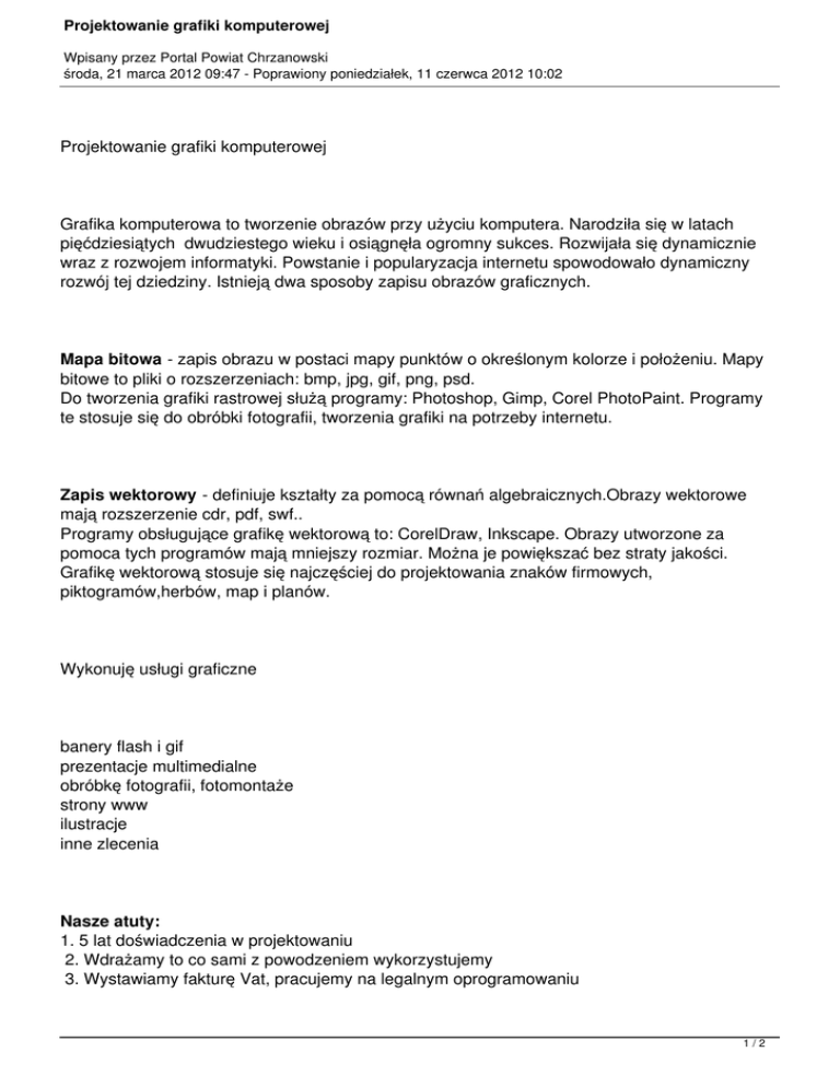 Projektowanie grafiki komputerowej Wpisany przez Portal Powiat Chrzanowski środa, 21 marca 2012 09:47 - Poprawiony poniedziałek, 11 czerwca 2012 10:02 Projektowanie grafiki komputerowej Grafika komputerowa to tworzenie obrazów przy użyciu komputera. Narodziła się w latach pięćdziesiątych dwudziestego wieku i osiągnęła ogromny sukces. Rozwijała się dynamicznie wraz z rozwojem informatyki. Powstanie i popularyzacja internetu spowodowało dynamiczny rozwój tej dziedziny. Istnieją dwa sposoby zapisu obrazów graficznych. Mapa bitowa - zapis obrazu w postaci mapy punktów o określonym kolorze i położeniu. Mapy bitowe to pliki o rozszerzeniach: bmp, jpg, gif, png, psd. Do tworzenia grafiki rastrowej służą programy: Photoshop, Gimp, Corel PhotoPaint. Programy te stosuje się do obróbki fotografii, tworzenia grafiki na potrzeby internetu. Zapis wektorowy - definiuje kształty za pomocą równań algebraicznych.Obrazy wektorowe mają rozszerzenie cdr, pdf, swf.. Programy obsługujące grafikę wektorową to: CorelDraw, Inkscape. Obrazy utworzone za pomoca tych programów mają mniejszy rozmiar. Można je powiększać bez straty jakości. Grafikę wektorową stosuje się najczęściej do projektowania znaków firmowych, piktogramów,herbów, map i planów. Wykonuję usługi graficzne banery flash i gif prezentacje multimedialne obróbkę fotografii, fotomontaże strony www ilustracje inne zlecenia Nasze atuty: 1. 5 lat doświadczenia w projektowaniu 2. Wdrażamy to co sami z powodzeniem wykorzystujemy 3. Wystawiamy fakturę Vat, pracujemy na legalnym oprogramowaniu 1/2 Projektowanie grafiki komputerowej Wpisany przez Portal Powiat Chrzanowski środa, 21 marca 2012 09:47 - Poprawiony poniedziałek, 11 czerwca 2012 10:02 Zobacz przykładowe grafiki Kontakt: tel./fax +48 32 711-05-12 tel.kom. +48 694-211-229 e-mail: [email protected] 2/2