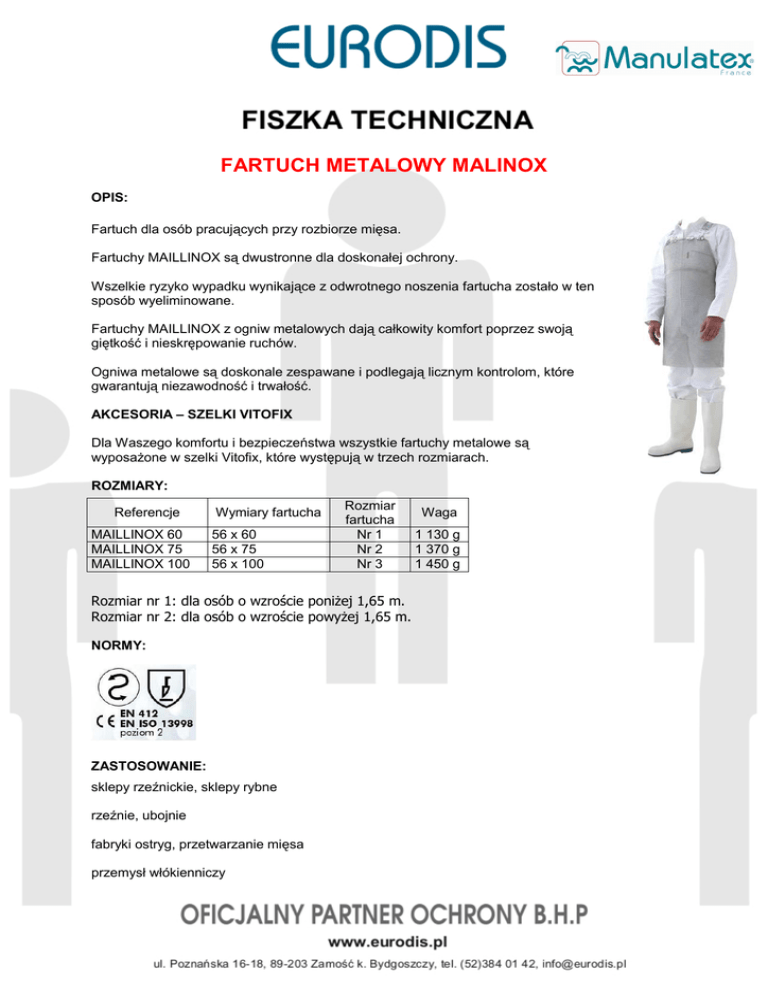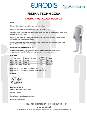 FARTUCH METALOWY MALINOX OPIS: Fartuch dla osób pracujących przy rozbiorze mięsa. Fartuchy MAILLINOX są dwustronne dla doskonałej ochrony. Wszelkie ryzyko wypadku wynikające z odwrotnego noszenia fartucha zostało w ten sposób wyeliminowane. Fartuchy MAILLINOX z ogniw metalowych dają całkowity komfort poprzez swoją giętkość i nieskrępowanie ruchów. Ogniwa metalowe są doskonale zespawane i podlegają licznym kontrolom, które gwarantują niezawodność i trwałość. AKCESORIA – SZELKI VITOFIX Dla Waszego komfortu i bezpieczeństwa wszystkie fartuchy metalowe są wyposażone w szelki Vitofix, które występują w trzech rozmiarach. ROZMIARY: Referencje MAILLINOX 60 MAILLINOX 75 MAILLINOX 100 Wymiary fartucha 56 x 60 56 x 75 56 x 100 Rozmiar fartucha Nr 1 Nr 2 Nr 3 Rozmiar nr 1: dla osób o wzroście poniżej 1,65 m. Rozmiar nr 2: dla osób o wzroście powyżej 1,65 m. NORMY: ZASTOSOWANIE: sklepy rzeźnickie, sklepy rybne rzeźnie, ubojnie fabryki ostryg, przetwarzanie mięsa przemysł włókienniczy Waga 1 130 g 1 370 g 1 450 g