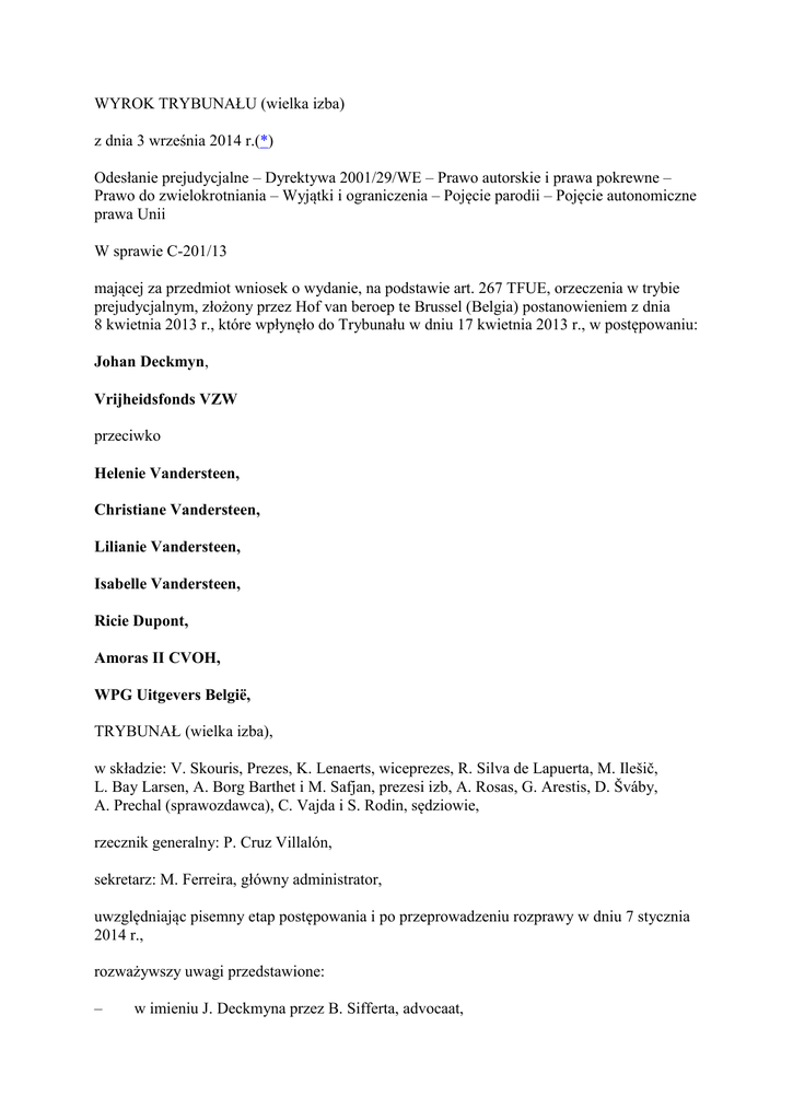 WYROK TRYBUNAŁU (wielka izba) z dnia 3 września 2014 r.(*) Odesłanie prejudycjalne – Dyrektywa 2001/29/WE – Prawo autorskie i prawa pokrewne – Prawo do zwielokrotniania – Wyjątki i ograniczenia – Pojęcie parodii – Pojęcie autonomiczne prawa Unii W sprawie C-201/13 mającej za przedmiot wniosek o wydanie, na podstawie art. 267 TFUE, orzeczenia w trybie prejudycjalnym, złożony przez Hof van beroep te Brussel (Belgia) postanowieniem z dnia 8 kwietnia 2013 r., które wpłynęło do Trybunału w dniu 17 kwietnia 2013 r., w postępowaniu: Johan Deckmyn, Vrijheidsfonds VZW przeciwko Helenie Vandersteen, Christiane Vandersteen, Lilianie Vandersteen, Isabelle Vandersteen, Ricie Dupont, Amoras II CVOH, WPG Uitgevers België, TRYBUNAŁ (wielka izba), w składzie: V. Skouris, Prezes, K. Lenaerts, wiceprezes, R. Silva de Lapuerta, M. Ilešič, L. Bay Larsen, A. Borg Barthet i M. Safjan, prezesi izb, A. Rosas, G. Arestis, D. Šváby, A. Prechal (sprawozdawca), C. Vajda i S. Rodin, sędziowie, rzecznik generalny: P. Cruz Villalón, sekretarz: M. Ferreira, główny administrator, uwzględniając pisemny etap postępowania i po przeprowadzeniu rozprawy w dniu 7 stycznia 2014 r., rozważywszy uwagi przedstawione: – w imieniu J. Deckmyna przez B. Sifferta, advocaat, – w imieniu rządu belgijskiego przez J.C. Halleux oraz C. Pochet, działających w charakterze pełnomocników, – w imieniu Komisji Europejskiej przez J. Samnaddę, F. Wilmana oraz T. van Rijna, działających w charakterze pełnomocników, po zapoznaniu się z opinią rzecznika generalnego na posiedzeniu w dniu 22 maja 2014 r., wydaje następujący Wyrok 1 Wniosek o wydanie orzeczenia w trybie prejudycjalnym dotyczy wykładni art. 5 ust. 3 lit. k) dyrektywy 2001/29/WE Parlamentu Europejskiego i Rady z dnia 22 maja 2001 r. w sprawie harmonizacji niektórych aspektów praw autorskich i pokrewnych w społeczeństwie informacyjnym (Dz.U. L 167, s. 10). 2 Wniosek ten został przedstawiony w ramach sporu między J. Deckmynem i Vrijheidsfonds VZW (zwanym dalej „Vrijheidsfonds”), stowarzyszeniem o celach niezarobkowych, a różnymi spadkobiercami W. Vandersteena, autora komiksów „Suske en Wiske” (w języku francuskim „Bob et Bobette”) oraz podmiotami praw autorskich związanych z tymi utworami (zwanymi dalej „Vandersteenami i in.”) w przedmiocie rozpowszechniania przez J. Deckmyna kalendarza, w którym reprodukowano rysunek (zwany dalej „rysunkiem spornym w postępowaniu głównym”) przypominający rysunek znajdujący się na okładce jednego z albumów serii „Suske en Wiske”. Ramy prawne Prawo Unii 3 Motyw 3 dyrektywy 2001/29 stanowi: „Planowana harmonizacja przyczyni się do wprowadzenia w życie czterech wolności rynku wewnętrznego i dotyczy zgodności z podstawowymi zasadami prawa, a w szczególności prawa własności, włączając własność intelektualną oraz wolność słowa i interes publiczny”. 4 Zgodnie z motywem 31 tej dyrektywy: „Należy zabezpieczyć właściwą równowagę praw i interesów między różnymi kategoriami podmiotów praw autorskich, jak również między nimi a użytkownikami przedmiotów objętych ochroną […]”. 5 Artykuł 5 wskazanej dyrektywy, zatytułowany „Wyjątki i ograniczenia”, stanowi w ust. 3: „Państwa członkowskie mogą przewidzieć wyjątki lub ograniczenia w odniesieniu do praw określonych w art. 2 i 3 [zatytułowanych, odpowiednio, »Prawo do zwielokrotniania utworu« i »Prawo do publicznego udostępniania utworów i prawo podawania do publicznej wiadomości innych przedmiotów objętych ochroną«] w następujących przypadkach: […] k) korzystania do celów karykatury, parodii lub pastiszu; […]”. Prawo belgijskie 6 Paragraf 22 ust. 1 wet betreffende het auteursrecht en de naburige rechten (ustawy o prawie autorskim i prawach pokrewnych) z dnia 30 czerwca 1994 r. (Belgisch Staatsblad z dnia 27 lipca 1994 r., s. 19297) stanowi: „Jeżeli utwór został legalnie opublikowany, autor nie może się sprzeciwić: […] 6. karykaturze, parodii lub pastiszowi, z uwzględnieniem przyjętych zwyczajów: […]”. Postępowanie główne i pytania prejudycjalne 7 Johan Deckmyn jest członkiem partii politycznej Vlaams Belang, a celem statutowym Vrijheidsfonds jest wspieranie tej partii finansowo i materialnie, z wyłączeniem wszelkich celów zarobkowych. 8 Na przyjęciu noworocznym zorganizowanym przez miasto Gandawa (Belgia) w dniu 9 stycznia 2011 r. J. Deckmyn rozdawał kalendarze na 2011 r. zawierające adnotację o nim jako o odpowiedzialnym wydawcy. Na przedniej stronie tych kalendarzy znajdował się rysunek sporny w postępowaniu głównym. 9 Rysunek ten przypominał ten umieszczony na okładce albumu komiksu „Suske en Wiske” zatytułowanego „De Wilde Weldoener” („Dziki dobroczyńca”), wykonanego w 1961 r. przez W. Vandersteena, którego francuska wersja językowa nosi tytuł „La tombe hindoue”. Ten ostatni rysunek przedstawiał jednego z głównych bohaterów tego albumu, ubranego w białą tunikę i rzucającego monety osobom próbującym je zbierać. Na rysunku spornym w postępowaniu głównym postać ta została zastąpiona przez burmistrza Gandawy, a zbierający monety – przez postacie noszące zasłonę i nienależące do rasy białej. 10 Oceniając, że sporny w postępowaniu głównym rysunek i jego publiczne udostępnienie naruszyło ich prawa autorskie, Vandersteeni i in. wytoczyli powództwo przeciw J. Deckmynowi i Vrijheidsfonds przed rechtbank van eerste aanleg te Brussel (sąd pierwszej instancji w Brukseli), który nakazał tym ostatnim zaniechanie wszelkiego wykorzystywania tego rysunku pod rygorem grzywny. 11 Przed sądem odsyłającym, do którego wniesiono apelację od orzeczenia wydanego w pierwszej instancji, J. Deckmyn i Vrijheidsfonds podnosili w szczególności, że sporny w postępowaniu głównym rysunek stanowi karykaturę polityczną, która mieści się w pojęciu parodii dopuszczon