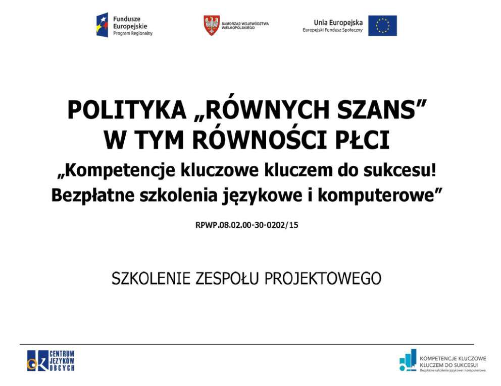 CZYM JEST POLITYKA RÓWNYCH SZANS Polityka równych szans jest polityką mającą na celu eliminowanie wszelkich form i przejawów dyskryminacji, a także propagowanie pełnego i równego uczestnictwa i dostępu we wszystkich dziedzinach społecznych bez względu na: narodowość płeć wiek niepełnosprawność orientację seksualną religię rasę przekonania polityczne Formę zatrudnienia: czas określony/nieokreślony oraz wymiar czasu pracy pełny/niepełny CZYM JEST DYSKRYMINACJA + emocje + władza STEREOTYP UPRZEDZENIE DYSKRYMINACJA Uproszczony sąd dotyczący określonej grupy ludzi wyrażony na podstawie jakiejś cechy np. kobiety/mężczyźni. Stereotyp jest trwały, utrwalony w społeczności i powielany bez negacji. Jest stereotypem w połączeniu z osobistymi emocjami nt. danej grupy np. strachem, złością. Nierówne, gorsze traktowanie jakiejś osoby/osób tylko na podstawie przynależności ich do jakiejś grupy wynikające ze stereotypów i uprzedzeń. RODZAJE DYSKRYMINACJI Dyskryminacja może przyjmować : POZIOM FORMA osobisty – dyskryminacja jednej osoby przez drugą; bezpośrednia – występuje wtedy gdy pracownik z powodu jakiegoś uprzedzenia jest traktowany mniej korzystnie niż inni pracownicy; instytucjonalny – dotyczy przyjętych w danej instytucji praktyk niekoniecznie oficjalnych, np. preferowanie mężczyzn na stanowiskach kierowniczych. pośrednia – występuje wtedy gdy na skutek pozornie neutralnego postanowienia/ kryterium/regulaminu/ działania występują dysproporcje w zakresie warunków zatrudnienia na niekorzyść danej grupy. RODZAJE DYSKRYMINACJI Dyskryminacja wiąże się bezpośrednio z zależnością władzy Przejawem dyskryminacji jest także działanie polegające na zachęcaniu innej osoby do naruszania zasady równego traktowania w zatrudnieniu oraz zachowanie, którego skutkiem jest naruszenie godności, poniżenie lub upokorzenie pracownika (molestowanie) RÓWNOŚĆ PŁCI Jednym z bardzo ważnych aspektów „równości szans” i przeciwdziałania dyskryminacji jest „równość płci” (gender mainstreaming). Polityka ta ma na celu systematyczne i świadome oceniania przyjętej polityki i działań z perspektywy wpływu na warunki życia kobiet i mężczyzn. Równość płci jest stanem, w którym kobietom i mężczyznom przypisuje się taką samą wartość społeczną, równe prawa, obowiązki oraz dostęp do zasobów z których mogliby korzystać np. środki finansowe, szanse rozwoju. Polityka równości płci przeciwdziała, zatem różnicowaniu kobiet i mężczyzn ze względu na stereotypowo przyjęte w społeczeństwie role, tym samym umożliwiając wybór drogi zawodowej bez ograniczeń. POJĘCIE PŁCI Płeć biologiczna (sex) - odnosi się do biologicznych różnic między mężczyznami a kobietami, które są uniwersalne i naturalnie niezmienne (narządy rozrodcze, cechy płciowe, funkcje reprodukcyjne, gospodarka hormonalna). Płeć społeczno-kulturowa (gender) – wszystko to, co w danej kulturze i społeczeństwie jest uważane za odpowiednie dla kobiet lub mężczyzn – stereotypy wyglądu, cech charakteru, zachowań, zainteresowań, wyborów życiowych i zawodowych - ról społecznych; uogólnione przekonania dotyczące tego, jakie są (wszystkie) kobiety i jacy są (wszyscy) mężczyźni gender zmienia się w czasie i przestrzeni; jest konstruowana i podzielana społecznie. OBSZARY DYSKRYMINACJI W OBSZARZE RYNKU PRACY segregacja pozioma – podział sektorów gospodarki i zawodów na tzw. „męskie” i „kobiece”, związany z niskim prestiż sektorów sfeminizowanych. Podział będący konsekwencją stereotypów płci. segregacja pionowa – utrudniony dostęp kobiet dostęp do awansu, zajmowania stanowisk kierowniczych i decyzyjnych (im wyższy szczebel, tym mniej kobiet). OBSZARY DYSKRYMINACJI W OBSZARZE RYNKU PRACY stereotypy płci – postrzeganie kobiet jako mniej dyspozycyjnych/ gorszych pracowników. różnice w wynagrodzeniach – ok. 20% na tym samym stanowisku. nieodpłatna praca kobiet – małe zaangażowanie mężczyzn w obowiązki domowe. „Dyskryminacja ze względu na płeć oznacza wszelkie zróżnicowanie, wyłączenie lub ograniczenie stosowane ze względu na płeć, które powoduje lub ma na celu uszczuplenie albo uniemożliwienie jednej z płci przyznania bądź korzystania na równi z drugą płcią z praw człowieka oraz podstawowych wolności w dziedzinach życia politycznego, gospodarczego, społecznego, kulturalnego, obywatelskiego i innych. Dyskryminacją ze względu na płeć jest również molestowanie seksualne” BARIERY RÓWNOŚCI PŁCI • • • • • • • • • • segregacja pozioma i pionowa rynku pracy różnice w płacach kobiet i mężczyzn mała dostępność elastycznych rozwiązań czasu pracy niski udział mężczyzn w wypełnianiu obowiązków rodzinnych niski udział kobiet w podejmowaniu decyzji przemoc ze względu na płeć niewidoczność kwestii płci w ochronie zdrowia niewystarczający system opieki przedszkolnej stereotypy płci we wszystkich obszarach dyskryminacja wielokrotna, szczególnie w odniesieniu do kobiet starszych, imigrujących, niepełnosprawnych oraz należących do mniejszości etnicznych PRZYKŁADY DYSKRYMINACJI ZE WZGLĘDU NA PŁEĆ W MIEJSCU PRACY ! odmowa zatrudnienia kobiety ze względu możliwości zajścia w ciążę w okresie zatrudnienia; przyznanie kobiecie niższego niż mężczyźnie wynagrodzenia za wykonywanie pracy tej samej wartości; odmowa awansowania kobiet na stanowiska kierownicze; molestowanie seksualne w miejscu pracy przez przełożonego lub współpracowników. Traktat Amsterdamski Strategia Lizbońska Europejska Strategia Zatrudnienia Kwestie horyzontalne Narodowe Strategiczne Ramy Odniesienia Program Operacyjny Kapitał Ludzki Projekt Beneficjenci i Beneficjentki Fundusze Strukturalne RAMY PRAWNE – A RÓWNOŚĆ PŁCI „Zgodnie z Traktatem Amsterdamskim, podejście do równości płci opiera się na dw