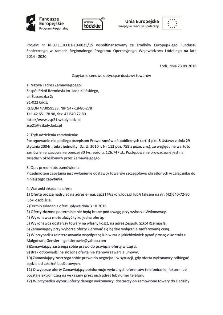 Projekt nr RPLD.11.03.01-10-0025/15 współfinansowany ze środków Europejskiego Funduszu Społecznego w ramach Regionalnego Programu Operacyjnego Województwa Łódzkiego na lata 2014 - 2020 Łódź, dnia 23.09.2016 Zapytanie cenowe dotyczące dostawy towarów 1. Nazwa i adres Zamawiającego: Zespół Szkół Rzemiosła im. Jana Kilińskiego, ul. Żubardzka 2; 91-022 Łódź; REGON 473059538, NIP 947-18-86-278 Tel: 42 651 78 98, fax: 42 640 72 80 http://www.zsp21.szkoly.lodz.pl [email protected] 2. Tryb udzielenia zamówienia: Postępowanie nie podlega przepisom Prawa zamówień publicznych (art. 4 pkt. 8 Ustawy z dnia 29 stycznia 2004r., tekst jednolity: Dz. U. 2010 r. Nr 113 poz. 759 z późn. zm.), ze względu na wartość zamówienia szacowania poniżej 30 tys. euro tj. 126.747 zł.. Postępowanie prowadzone jest na zasadach określonych przez Zamawiającego. 3. Opis przedmiotu zamówienia: Przedmiotem zapytania jest wyłonienie dostawcy towarów szczegółowo określonych w załączniku do niniejszego zapytania. 4. Warunki składania ofert: 1) Ofertę proszę nadsyłać na adres e-mai: [email protected] lub/i faksem na nr: (42)640-72-80 lub/i osobiście. 2)Termin składania ofert upływa dnia 3.10.2016 3) Oferty złożone po terminie nie będą brane pod uwagę przy wyborze Wykonawcy. 4) Wykonawca może złożyć tylko jedna ofertę. 5) Wykonawca dostarczy towary na własny koszt, na adres Zespołu Szkół Rzemiosła. 6) Zamawiający przy wyborze oferty kierować się będzie wyłącznie zaoferowaną ceną. 7) W przypadku zainteresowania współpracą lub w razie jakichkolwiek pytań proszę o kontakt z Małgorzatą Gensler - [email protected] 8)Zamawiający zastrzega sobie prawo do przyjęcia oferty w części. 9) Brak odpowiedzi na złożoną ofertę nie stanowi zawarcia umowy. 10) Zamawiający zastrzega sobie prawo do negocjacji w sytuacji, gdy oferta wykonawcy odbiegać będzie od założeń budżetowych. 11) O wyborze oferty Zamawiający poinformuje wybranych oferentów telefonicznie, faksem lub pocztą elektroniczną na wskazany przez nich adres lub numer telefonu. 12) W przypadku wyboru oferty danego wykonawcy, dostarczy on zamówione towary do siedziby Zamawiającego w terminach ustalonych przez strony. Zamawiający zastrzega, że terminy dostaw mogą ulec zmianie. 13) Płatność za towary nastąpi do 30 dni po wystawieniu faktury, na rachunek wskazany przez sprzedającego Jednocześnie informujemy, że: - nie zwracamy kosztów przygotowania oferty dla celów niniejszego zapytania; - niniejsze pismo NIE jest ofertą w rozumieniu przepisów kodeksu cywilnego; - odpowiemy jedynie na wybrane oferty i jednocześnie zastrzegamy sobie prawo do odstąpienia od dokonania wyboru oferty najkorzystniejszej bez podania przyczyny; - nie odsyłamy nadesłanych ofert. Załącznik: -wykaz towarów - teodolit elektroniczny ze statywem w komplecie - 1 sztuka - niwelator optyczny w komplecie ze statywem i łatą - 2 sztuki - dalmierz laserowy ( 70m ) - 2 sztuki - węgielnica pryzmatyczna - 2 sztuki - tyczki geodezyjne skręcane 4x2m + stojaki do tyczek -2 sztuki - szpilki geodezyjne 30mm - 2 sztuki - łata miernicza teleskopowa 5m - 2 sztuki - taśmy pomiarowe 10m i 20m - po 1 sztuce - stalowa taśma pomiarowa 50m - 1 sztuka - busola - stanowisko pomiarów terenowych - 2 sztuki -stół kreślarski 70x100cm z przykładnicą -15 sztuk - zestaw przyborów kreślarskich - 15 sztuk FORMULARZ OFERTOWY ..................................... (miejscowość i data) ....................................................... ....................................................... ....................................................... (Nazwa i adres oferenta) OFERTA Zespół Szkół Rzemiosła im. Jana Kilińskiego, ul. Żubardzka 2 91-022 Łódź; REGON 470359538, NIP 947-18-86-278 Tel: 42 651 78 98, fax: 42 640 72 80 http://www.zsp21.szkoly.lodz.pl [email protected] (nazwa i adres zamawiającego) Odpowiadając na zapytanie o cenę oferujemy wykonanie niniejszego zamówienia: Lp. 1 2 3 4 5 6 7 Razem Przedmiot Jednostka Zamówienia miary n/d n/d Ilość Cena jednostkowa netto n/d n/d Wartość netto Stawka VAT (%) n/d Wartość VAT Wartość brutto