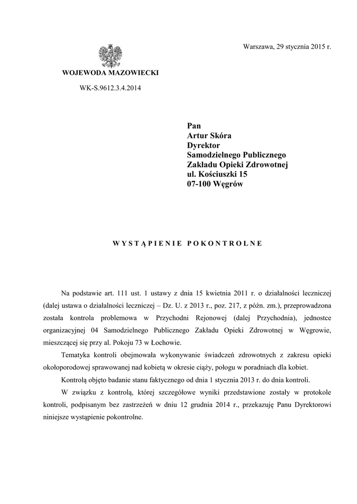 Warszawa, 29 stycznia 2015 r. WOJEWODA MAZOWIECKI WK-S.9612.3.4.2014 Pan Artur Skóra Dyrektor Samodzielnego Publicznego Zakładu Opieki Zdrowotnej ul. Kościuszki 15 07-100 Węgrów WYSTĄPIENIE POKONTROLNE Na podstawie art. 111 ust. 1 ustawy z dnia 15 kwietnia 2011 r. o działalności leczniczej (dalej ustawa o działalności leczniczej – Dz. U. z 2013 r., poz. 217, z późn. zm.), przeprowadzona została kontrola problemowa w Przychodni Rejonowej (dalej Przychodnia), jednostce organizacyjnej 04 Samodzielnego Publicznego Zakładu Opieki Zdrowotnej w Węgrowie, mieszczącej się przy al. Pokoju 73 w Łochowie. Tematyka kontroli obejmowała wykonywanie świadczeń zdrowotnych z zakresu opieki okołoporodowej sprawowanej nad kobietą w okresie ciąży, połogu w poradniach dla kobiet. Kontrolą objęto badanie stanu faktycznego od dnia 1 stycznia 2013 r. do dnia kontroli. W związku z kontrolą, której szczegółowe wyniki przedstawione zostały w protokole kontroli, podpisanym bez zastrzeżeń w dniu 12 grudnia 2014 r., przekazuję Panu Dyrektorowi niniejsze wystąpienie pokontrolne. W trakcie kontroli ustalono, że Poradnia ginekologiczno-położnicza zapewniała realizację świadczeń opieki medycznej kobietom w okresie ciąży oraz połogu, poprzez: systematyczną ocenę stanu zdrowia ciężarnych kobiet oraz płodu, kierowanie na specjalistyczne konsultacje lekarskie, identyfikację czynników ryzyka okołoporodowego, propagowanie zdrowego stylu życia, praktyczne i teoretyczne przygotowanie do porodu, połogu, karmienia piersią oraz rodzicielstwa, a także wykonywanie badań kontrolnych w okresie połogu, zgodnie z wymogami określonymi w rozporządzeniu Ministra Zdrowia z dnia 20 września 2012 r. w sprawie standardów postępowania medycznego przy udzielaniu świadczeń zdrowotnych z zakresu opieki okołoporodowej sprawowanej nad kobietą w okresie fizjologicznej ciąży, fizjologicznego porodu, połogu oraz opieki nad noworodkiem (dalej rozporządzenie w sprawie standardów opieki okołoporodowej – Dz. U. z 2012 r., poz. 1100). Świadczenia zdrowotne z zakresu opieki okołoporodowej sprawowanej nad kobietą w ciąży realizowane były przez 3 lekarzy. Dwóch lekarzy było specjalistami w dziedzinie położnictwa i ginekologii, w tym 1 lekarz jednocześnie posiadał specjalizację I° w zakresie anestezjologii i intensywnej terapii. Trzeci lekarz posiadał specjalizację I° w zakresie położnictwa i ginekologii. Opiekę medyczną sprawowały 2 położne, które odbyły kurs kwalifikacyjny dla położnych środowiskowo-rodzinnych. Jedna położna ukończyła kurs dokształcający dla pielęgniarek i położnych w zakresie profilaktyki raka piersi, a druga – kurs doskonalący z zakresu krwiodawstwa. W dokumentacji podmiotu leczniczego zgromadzono dokumenty potwierdzające prawo wykonywania zawodu aktualnie zatrudnionej kadry lekarskiej i położnych. Przychodnia, w strukturach której funkcjonuje kontrolowana Poradnia, zabezpieczała odpowiednie warunki lokalowe, kadrowe oraz sprzętowe umożliwiające właściwą organizację świadczeń z zakresu opieki okołoporodowej, zgodnie z wymogami ustalonymi w rozporządzeniu w sprawie standardów opieki okołoporodowej. Podmiot zapewniał możliwość wykonania badań laboratoryjnych, cytologicznych, bakteriologicznych, ultrasonograficznych i kardiotokograficznych. Podmiot prowadził szkołę rodzenia funkcjonującą w Przychodni Rejonowo-Specjalistycznej przy ulicy Przemysłowej 7 w Węgrowie, w której odbywały się zajęcia przygotowujące do porodu, połogu, pielęgnacji noworodka oraz do roli rodziców. Poradnia ginekologiczno-położnicza realizowała także świadczenia promujące zdrowy styl życia, ze szczególnym uwzględnieniem tematyki związanej z okresem ciąży i połogu oraz karmieniem naturalnym. Placówka realizowała świadczenia zdrowotne w miejscu zamieszkania lub pobytu położnicy. Opiekę poporodową sprawowała położna środowiskowo-rodzinna podstawowej opieki zdrowotnej, 2 która opieką patronażową objęła 239 położnice i 239 noworodków. Położna środowiskoworodzinna wykonywała od 4 do 6 wizyt patronażowych, w czasie których oceniała stan zdrowia położnicy, relacje w rodzinie, warunki socjalno-bytowe oraz udzielała instruktażu na temat opieki nad noworodkiem, technik kąpieli, pielęgnacji skóry i kikuta pępowiny, a także motywowała do karmienia naturalnego i pomagała w rozwiązywaniu problemów związanych z laktacją. Położna informowała położnicę o potrzebie odbycia wizyty kontrolnej u lekarza ginekologa w 6. tygodniu połogu oraz o konieczności zgłaszania się z dzieckiem na szczepienia ochronne i badania profilaktyczne. W podmiocie umieszczono informację o prawach pacjenta, zgodnie z wymogiem określonym w art. 11 ust. 1 ustawy z dnia 6 listopada 2008 r. o prawach pacjenta i Rzeczniku Praw Pacjenta (Dz. U. z 2012 r., poz. 159, z późn. zm.). Podmiot posiadał opracowane minimalne normy zatrudnienia pielęgniarek i położnych, które uwzględniały kontrolowane komórki organizacyjne, zgodnie z wytycznymi określonymi w rozporządzeniu Ministra Zdrowia z dnia 28 grudnia 2012 r. w sprawie sposobu ustalania minimalnych norm zatrudnienia pielęgniarek i położnych w podmiotach leczniczych niebędących przedsiębiorcami (Dz. U. z 2012 r., poz. 1545). Przychodnia dysponowała dokumentacją potwierdzającą sprawność techniczną aparatury i sprzętu medycznego wykorzystywanego przy udzielaniu świadczeń medycznych, do której posiadania i okazania organowi kontroli podmiot jest zobowiązany na podstawie art. 90 ust. 6, 7 i 9 ustawy z dnia 20 maja 2010 r. o wyrobach medycznych (Dz. U. Nr 107, poz. 679, z późn. zm.). Indywidualna dokumentacja medyczna pacjentów prowadzona i przechowywana była zgodnie z normami ustalonymi w rozporządzeniu Ministra Zdrowia z dnia 21 grudnia 2010 r. w sprawie rodzajów i zakresu dokumentacji medycznej oraz sposobu jej przetwarzani