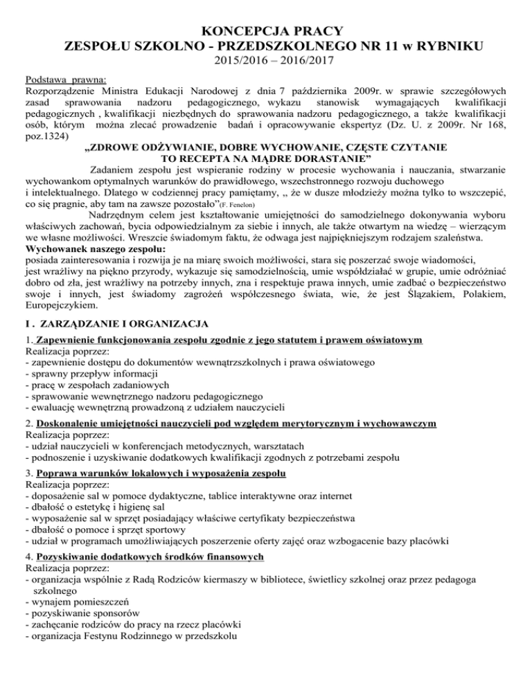 KONCEPCJA PRACY ZESPOŁU SZKOLNO - PRZEDSZKOLNEGO NR 11 w RYBNIKU 2015/2016 – 2016/2017 Podstawa prawna: Rozporządzenie Ministra Edukacji Narodowej z dnia 7 października 2009r. w sprawie szczegółowych zasad sprawowania nadzoru pedagogicznego, wykazu stanowisk wymagających kwalifikacji pedagogicznych , kwalifikacji niezbędnych do sprawowania nadzoru pedagogicznego, a także kwalifikacji osób, którym można zlecać prowadzenie badań i opracowywanie ekspertyz (Dz. U. z 2009r. Nr 168, poz.1324) „ZDROWE ODŻYWIANIE, DOBRE WYCHOWANIE, CZĘSTE CZYTANIE TO RECEPTA NA MĄDRE DORASTANIE” Zadaniem zespołu jest wspieranie rodziny w procesie wychowania i nauczania, stwarzanie wychowankom optymalnych warunków do prawidłowego, wszechstronnego rozwoju duchowego i intelektualnego. Dlatego w codziennej pracy pamiętamy, „ że w dusze młodzieży można tylko to wszczepić, co się pragnie, aby tam na zawsze pozostało”(F. Fenelon) Nadrzędnym celem jest kształtowanie umiejętności do samodzielnego dokonywania wyboru właściwych zachowań, bycia odpowiedzialnym za siebie i innych, ale także otwartym na wiedzę – wierzącym we własne możliwości. Wreszcie świadomym faktu, że odwaga jest najpiękniejszym rodzajem szaleństwa. Wychowanek naszego zespołu: posiada zainteresowania i rozwija je na miarę swoich możliwości, stara się poszerzać swoje wiadomości, jest wrażliwy na piękno przyrody, wykazuje się samodzielnością, umie współdziałać w grupie, umie odróżniać dobro od zła, jest wrażliwy na potrzeby innych, zna i respektuje prawa innych, umie zadbać o bezpieczeństwo swoje i innych, jest świadomy zagrożeń współczesnego świata, wie, że jest Ślązakiem, Polakiem, Europejczykiem. I . ZARZĄDZANIE I ORGANIZACJA 1. Zapewnienie funkcjonowania zespołu zgodnie z jego statutem i prawem oświatowym Realizacja poprzez: - zapewnienie dostępu do dokumentów wewnątrzszkolnych i prawa oświatowego - sprawny przepływ informacji - pracę w zespołach zadaniowych - sprawowanie wewnętrznego nadzoru pedagogicznego - ewaluację wewnętrzną prowadzoną z udziałem nauczycieli 2. Doskonalenie umiejętności nauczycieli pod względem merytorycznym i wychowawczym Realizacja poprzez: - udział nauczycieli w konferencjach metodycznych, warsztatach - podnoszenie i uzyskiwanie dodatkowych kwalifikacji zgodnych z potrzebami zespołu 3. Poprawa warunków lokalowych i wyposażenia zespołu Realizacja poprzez: - doposażenie sal w pomoce dydaktyczne, tablice interaktywne oraz internet - dbałość o estetykę i higienę sal - wyposażenie sal w sprzęt posiadający właściwe certyfikaty bezpieczeństwa - dbałość o pomoce i sprzęt sportowy - udział w programach umożliwiających poszerzenie oferty zajęć oraz wzbogacenie bazy placówki 4. Pozyskiwanie dodatkowych środków finansowych Realizacja poprzez: - organizacja wspólnie z Radą Rodziców kiermaszy w bibliotece, świetlicy szkolnej oraz przez pedagoga szkolnego - wynajem pomieszczeń - pozyskiwanie sponsorów - zachęcanie rodziców do pracy na rzecz placówki - organizacja Festynu Rodzinnego w przedszkolu II. DZIAŁALNOŚĆ WYCHOWAWCZA 1. Budowanie pozytywnego klimatu zespołu Realizacja poprzez: - przyjazne nastawienie do wychowanków - organizację wycieczek - współpracę z rodzicami - organizację imprezy szkolnych, przedszkolnych oraz międzyszkolnych - organizacja imprez dla najbliższego środowiska - dbałość o wystrój korytarzy, sal szkolnych i przedszkolnych 2. Kształtowanie odpowiedzialnych postaw zgodnych z normami społecznymi Realizacja poprzez: - promowanie pozytywnych zachowań – apele szkolne, pogadanki - przestrzeganie zasad kodeksu „ 10 kroków ucznia Jedenastki” - przestrzeganie zasad „Kodeksu przedszkolaka” - organizowanie spotkań z przedstawicielami służb mundurowych - osobisty przykład pracowników zespołu szkolno-przedszkolnego - budowanie pozytywnych relacji w społeczności szkolnej i przedszkolnej - prowadzenie zajęć profilaktyczno – wychowawczych z pedagogami szkolnymi - organizację spektakli profilaktycznych 3. Kształtowanie postaw prozdrowotnych i promowanie zdrowego trybu życia Realizacja poprzez: - udział szkoły w programach: Szkoła Promująca Zdrowie, „Bezpieczny Pierwszak”, „Owoce w szkole”, „Szklanka mleka”, Trzymaj formę”, „Zachowaj Trzeźwy Umysł”, „Nie pal przy mnie proszę”, „Znajdź właściwe rozwiązanie” - udział przedszkola w projektach prozdrowotnych - organizację konkursu dla klas VI – „Stop uzależnieniom” - organizację nauki pływania dla klas III - organizację zajęć rekreacyjno-sportowych - organizację wyjazdów na „zieloną szkołę” dla klas III - działalność koła Polskiego Czerwonego Krzyża - przeprowadzanie zajęć dotyczących zdrowego trybu życia oraz sposobom przeciwdziałania otyłości wśród dzieci - organizację apeli szkolnych - przeprowadzanie pogadanek z lekarzem, higienistką, dietetykiem - organizację konkursów dla rodziców i dzieci 4. Wyrabianie postawy odpowiedzialnej za środowisko Realizacja poprzez: - zbieranie surowców wtórnych, segregację - działalność koła LOP - udział wychowanków w konkursach ekologicznych - organizację obchodów Dnia Ziemi - przeprowadzanie zajęć o tematyce ekologicznej - organizację spotkania z leśniczym - sprzątanie terenów wokół placówki - współpracę ze schroniskiem dla zwierząt 5. Integracja oddziałów przedszkolnych i zespołów klasowych Realizacja poprzez: - organizację dni otwartych - organizację wycieczek, zielonych szkół - udział wychowanków w wydarzeniach kulturalnych - udział przedszkolaków w programie „6 na start” - organizację dyskotek klasowych, bali karnawałowych, klasowych wigilii - organizację gier i zabaw grupowych - realizację przedstawień dla innych placówek - organizację zawodów sportowych - stosowanie aktywizujących metod na zajęciach, lekcjach przedmiotowych i wychowaw