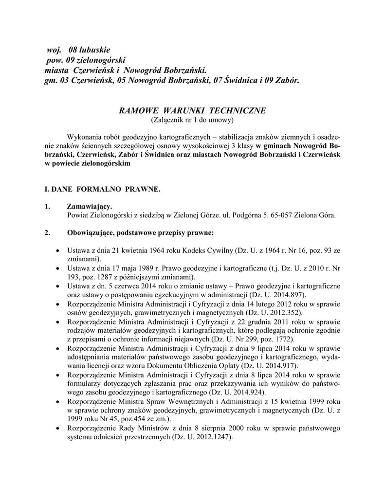 woj. 08 lubuskie pow. 09 zielonogórski miasta Czerwieńsk i Nowogród Bobrzański. gm. 03 Czerwieńsk, 05 Nowogród Bobrzański, 07 Świdnica i 09 Zabór. RAMOWE WARUNKI TECHNICZNE (Załącznik nr 1 do umowy) Wykonania robót geodezyjno kartograficznych – stabilizacja znaków ziemnych i osadzenie znaków ściennych szczegółowej osnowy wysokościowej 3 klasy w gminach Nowogród Bobrzański, Czerwieńsk, Zabór i Świdnica oraz miastach Nowogród Bobrzański i Czerwieńsk w powiecie zielonogórskim I. DANE FORMALNO PRAWNE. 1. Zamawiający. Powiat Zielonogórski z siedzibą w Zielonej Górze. ul. Podgórna 5. 65-057 Zielona Góra. 2. Obowiązujące, podstawowe przepisy prawne: Ustawa z dnia 21 kwietnia 1964 roku Kodeks Cywilny (Dz. U. z 1964 r. Nr 16, poz. 93 ze zmianami). Ustawa z dnia 17 maja 1989 r. Prawo geodezyjne i kartograficzne (t.j. Dz. U. z 2010 r. Nr 193, poz. 1287 z późniejszymi zmianami). Ustawa z dn. 5 czerwca 2014 roku o zmianie ustawy – Prawo geodezyjne i kartograficzne oraz ustawy o postępowaniu egzekucyjnym w administracji (Dz. U. 2014.897). Rozporządzenie Ministra Administracji i Cyfryzacji z dnia 14 lutego 2012 roku w sprawie osnów geodezyjnych, grawimetrycznych i magnetycznych (Dz. U. 2012.352). Rozporządzenie Ministra Administracji i Cyfryzacji z 22 grudnia 2011 roku w sprawie rodzajów materiałów geodezyjnych i kartograficznych, które podlegają ochronie zgodnie z przepisami o ochronie informacji niejawnych (Dz. U. Nr 299, poz. 1772). Rozporządzenie Ministra Administracji i Cyfryzacji z dnia 9 lipca 2014 roku w sprawie udostępniania materiałów państwowego zasobu geodezyjnego i kartograficznego, wydawania licencji oraz wzoru Dokumentu Obliczenia Opłaty (Dz. U. 2014.917). Rozporządzenie Ministra Administracji i Cyfryzacji z dnia 8 lipca 2014 roku w sprawie formularzy dotyczących zgłaszania prac oraz przekazywania ich wyników do państwowego zasobu geodezyjnego i kartograficznego (Dz. U. 2014.924). Rozporządzenie Ministra Spraw Wewnętrznych i Administracji z 15 kwietnia 1999 roku w sprawie ochrony znaków geodezyjnych, grawimetrycznych i magnetycznych (Dz. U. z 1999 roku Nr 45, poz.454 ze zm.). Rozporządzenie Rady Ministrów z dnia 8 sierpnia 2000 roku w sprawie państwowego systemu odniesień przestrzennych (Dz. U. 2012.1247). Pomocniczo, jeśli nie są sprzeczne z wyżej wymienionymi przepisami, należy stosować następujące wytyczne techniczne: G-2.5 – szczegółowa pozioma i wysokościowa osnowa geodezyjna. Projektowanie, pomiar i opracowanie wyników – GUGiK 2002 rok. II. CHARAKTERYSTYKA OBIEKTU. 2.1. Ogólne dane o obszarze opracowania. Obszar opracowania to część powiatu zielonogórskiego składający się z czterech gmin – Nowogród Bobrzański, Czerwieńsk, Zabór, Świdnica i dwóch miast – Nowogród Bobrzański i Czerwieńsk, położonych po lewej stronie rzeki Odry o łącznej powierzchni 75 694 ha. Miasta oraz gminy, które stanowią zakres obszarowy będący przedmiotem opracowania, położone są w południowo zachodniej części powiatu zielonogórskiego, od pozostałej części powiatu są oddzielone rzeką Odrą. Sąsiadują z powiatami Nowa Sól, Żagań, Żary i Krosno Odrzańskie, od północnego wschodu opierają się na rzece Odrze. Na powyższym terenie istnieją dwa miasta – Czerwieńsk – 1 obręb ewidencyjny i Nowogród Bobrzański – 2 obręby ewidencyjne, oraz 53 obrębów wiejskich o łącznej powierzchni 75 694 ha. W większości powierzchni obrębów wiejskich zabudowa głównie zagrodowa, skupiona, tylko fragmenty zabudowy kolonijnej i rozproszonej. Znaczne powierzchnie gruntów rolnych i leśnych. Teren w większości płaski, niewielkie powierzchnie terenów o deniwelacjach w granicach 30 m.. Średnia wysokość zawiera się w granicach od 45 do 159 m. n.p.m.. Pod względem komunikacyjnym opisany teren położony jest korzystnie zarówno w układzie dróg krajowych, wojewódzkich jak i lokalnych. Gminę Zielona Góra przecina droga krajowa E3 relacji północ – południe, Gminy Świdnica i Nowogród Bobrzański przecina droga wojewódzka nr 284 prowadząca z Zielonej Góry w kierunku Żagania. Z tej drogi istnieją zjazdy na drogi wojewódzkie nr 279 i 290 prowadzące w kierunku obrębów, które są przedmiotem opracowania. W kierunku gminy Czerwieńsk prowadzi z Zielonej Góry droga wojewódzka nr 280. Ponadto na terenie opracowania istnieje sieć dróg powiatowych i gminnych, które zapewniają prawidłowe warunki komunikacji. III. ISTNIEJĄCE MATERIAŁY GEODEZYJNE I KARTOGRAFICZNE. Dokumenty państwowego zasobu geodezyjnego i kartograficznego gromadzone są w Powiatowym Ośrodku Dokumentacji Geodezyjnej i Kartograficznej w Zielonej Górze, z siedzibą w Zielonej Górze przy ul. Podgórnej 5, kod 65-057 Zielona Góra. Ewidencję gruntów, w mikrokomputerowym systemie GEOINFO - INTEGRA, prowadzi Starostwo Powiatowe w Zielonej Górze. Ostatecznie ewidencję gruntów założono w początkach lat 1960 na podstawie materiałów z regulacji gruntów, bez ogłoszenia stanu władania i rozgraniczenia granic zewnętrznych obrębów. W systemie mikrokomputerowym ewidencja jest prowadzona od początku lat 90-tych. Wszystkie obręby mają mapę ewidencji gruntów i budynków wykonaną w wersji cyfrowej, która była wykonana z inicjatywy ARiMR w latach 2004-2005 na potrzeby programu IACS. Mapy są aktualizowane wynikami bieżących pomiarów. Powierzchnie działek w obrębach wiejskich są obliczone metodami tradycyjnymi i w większości wykazane z dokładnością zapisu do 1 ara. Od ostatniej zmiany przepisów w tym zakresie są obliczane ze współrzędnych i wykazywane z dokładnością do 1 m2. Wykaz współ- rzędnych punktów granicznych w układzie „2000” w postaci pliku tekstowego, który powstał w trakcie wykonania mapy ewidencyjnej w wersji cyfrowej, jednak tylko niewielka część tych współrzędnych pochodzi z pomiaru bezpośredniego. Mapa numeryczna wykonana jest w systemie GEOI