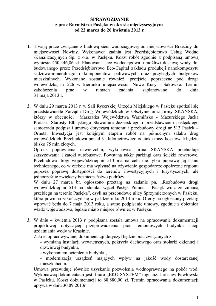 SPRAWOZDANIE z prac Burmistrza Pasłęka w okresie międzysesyjnym od 22 marca do 26 kwietnia 2013 r. 1. Trwają prace związane z budową sieci wodociągowej od miejscowości Brzeziny do miejscowości Nowiny. Wykonawcą zadnia jest Przedsiębiorstwo Usług Wodno -Kanalizacyjnych Sp. z o.o. w Pasłęku. Koszt robót zgodnie z podpisaną umową wyniesie 450.446,86 zł. Planowana sieć wodociągowa umożliwi dostawę wody do budowanego przez Przedsiębiorstwo Eco-Capital zakładu produkcji nanokompozytu sadzowo-mineralnego i komponentów paliwowych oraz przyległych budynków mieszkalnych. Wykonane zostanie również przejście poprzeczne pod drogą wojewódzką nr 526 w kierunku miejscowości Nowe Kusy i Sakówko. Termin zakończenia prac w ramach zadania zaplanowano do dnia 31 maja 2013 r. 2. W dniu 29 marca 2013 r. w Sali Rycerskiej Urzędu Miejskiego w Pasłęku spotkali się przedstawiciele Zarządu Dróg Wojewódzkich w Olsztynie oraz firmy SKANSKA, którzy w obecności Marszałka Województwa Warmińsko - Mazurskiego Jacka Protasa, Starosty Elbląskiego Sławomira Jezierskiego i przedstawicieli pasłęckiego samorządu podpisali umowę dotyczącą remontu i przebudowy drogi nr 513 Pasłęk – Orneta. Inwestycja jest kolejnym etapem robót na północnym szlaku dróg wojewódzkich. Przebudowa ponad 31-kilometrowego odcinka trasy kosztować będzie blisko 75 mln złotych. Oprócz poprawienia nawierzchni, wykonawca firma SKANSKA przebuduje skrzyżowania i zatoki autobusowe. Powstaną także parkingi oraz ścieżki rowerowe. Przebudowa drogi wojewódzkiej nr 513 ma na celu nie tylko poprawę jej stanu technicznego, co w efekcie ma wpłynąć na ożywienie gospodarczo-społeczne regionu poprzez poprawę dostępności do terenów inwestycyjnych i turystycznych, ale jednocześnie zwiększy bezpieczeństwo podróży. W dniu 27 marca br. ogłoszono przetarg na zadanie pn. „Rozbudowa drogi wojewódzkiej nr 513 na odcinku węzeł Pasłęk Północ – Pasłęk wraz ze zmianą przebiegu na terenie Pasłęka”, czyli na przebudowę ulicy Sprzymierzonych w Pasłęku, która powinna zakończyć się w październiku 2014 roku. Oferty na ogłoszony przetarg wpływać będą do 7 maja 2013 roku, a samo podpisanie umowy, zgodnie z obietnicą władz województwa, będzie miało miejsce również w Pasłęku. 3. W dniu 4 kwietnia 2013 r. podpisana została umowa na opracowanie dokumentacji projektowej dotyczącej przeprowadzenia prac remontowych budynku stacji uzdatniania wody w Krasinie. Zakres opracowywanej dokumentacji dotyczył będzie prac związanych z: - wymianą instalacji wewnętrznych, pokrycia dachowego oraz stolarki okiennej i drzwiowej budynku, - wykonaniem ocieplenia budynku, - modernizacją urządzeń mających wpływ na jakość wody dostarczanej mieszkańcom. Umowa przewiduje również uzyskanie pozwolenia wodnoprawnego na pobór wód. Wykonawcą dokumentacji jest biuro „EKO-SYSTEM” mgr inż. Jarosław Pawłowski w Pasłęku. Koszt dokumentacji to 68.880,00 zł. Termin opracowania dokumentacji upływa w dniu 30.09.2013r. 1 4. W dniu 4 kwietnia została podpisana umowa pomiędzy Gminą Pasłęk a Stowarzyszeniem Niepoprawnych Optymistów Krasina - organizacją wyłonioną w II edycji konkursu ofert na zlecenie zadań organizacjom pozarządowym działającym na terenie Gminy Pasłęk. Stowarzyszenie Niepoprawnych Optymistów Krasina otrzyma 2 tys. zł na realizację zadania „Aktywizacja, integracja mieszkańców i promocja Gminy i Kanału Elbląskiego”. W ramach tego zadania zostanie zorganizowana „Familiada ze ślimakiem” - Krasin 2013. 5. Na ogłoszony w dniu 8 kwietnia 2013 r. przetarg na realizację zadania pn. „Usuwanie wyrobów zawierających azbest z terenu miasta i gminy Pasłęk” wpłynęło 6 ofert. Wartość najwyższej oferty wyniosła 61.502,37 zł, zaś najniższej 40.451,56 zł. Obecnie trwają prace zmierzające do wyłonienia najkorzystniejszej oferty. Zadanie polega na demontażu, zabezpieczeniu, transporcie i unieszkodliwieniu pokryć dachowych wykonanych z płyt azbestowo-cementowych zlokalizowanych na 32 posesjach położonych na terenie gminy. Łączna ilość tego wyrobu to 5528,8 m², co szacunkowo stanowi 69,663 ton. W ramach realizacji tego zadania gmina Pasłęk ubiega się o udzielenie dotacji ze środków Wojewódzkiego Funduszu Ochrony Środowiska i Gospodarki Wodnej w Olsztynie, która może wynieść do 85% kosztów kwalifikowalnych. Pozostałe 15% środków zostanie zabezpieczone w budżecie gminy. Właściciele nieruchomości, którzy do 28 lutego 2013 r. złożyli w Urzędzie Miejskim w Pasłęku wniosek o udzielenie dotacji na usunięcie tego niebezpiecznego odpadu, będą mogli liczyć na dotację stanowiącą 100 % kosztów związanych z demontażem, transportem i utylizacją wyrobów zawierających azbest. Miasto i Gmina Pasłęk po raz trzeci przystąpiła do realizacji tego typu przedsięwzięcia. W 2012 r. w ramach I i II edycji przedsięwzięcia usunięto z 56 nieruchomości znajdujących się na terenie Miasta i Gminy Pasłęk wyroby zawierające azbest o łącznej ilości 148,192 ton. 6. Na ogłoszony w dniu 9 kwietnia 2013r. przetarg nieograniczony na realizację zadania pn.”Rozbudowa sieci wodociągowej w miejscowości Kol. Zielonka Pasłęcka” wpłynęło 5 ofert. Wartość najwyższej oferty wyniosła 234.684,00 zł, zaś najniższej 134.097,15 zł. Obecnie trwają prace zmierzające do wyłonienia najkorzystniejszej oferty. Zadanie dotyczy rozbudowy sieci wodociągowej w kierunku zabudowań Kol. Zielonki Pasłęckiej. W wyniku przedsięwzięcia powstanie odcinek sieci o długości 1 470,0 m. 7. W dniu 11 kwietnia 2013r. odbyło się otwarcie ofert złożonych w ramach przetargu nieograniczonego na budowę sieci wodno-kanalizacyjnej Krosno - Zielony Grąd – Kol. Marianka – Rzędy – Kupin. Do Urzędu Miejskiego w Pasłęku w ramach ogłoszonego przetargu wpłynęło 7 ofert. Wartość najwyższej oferty wyniosł