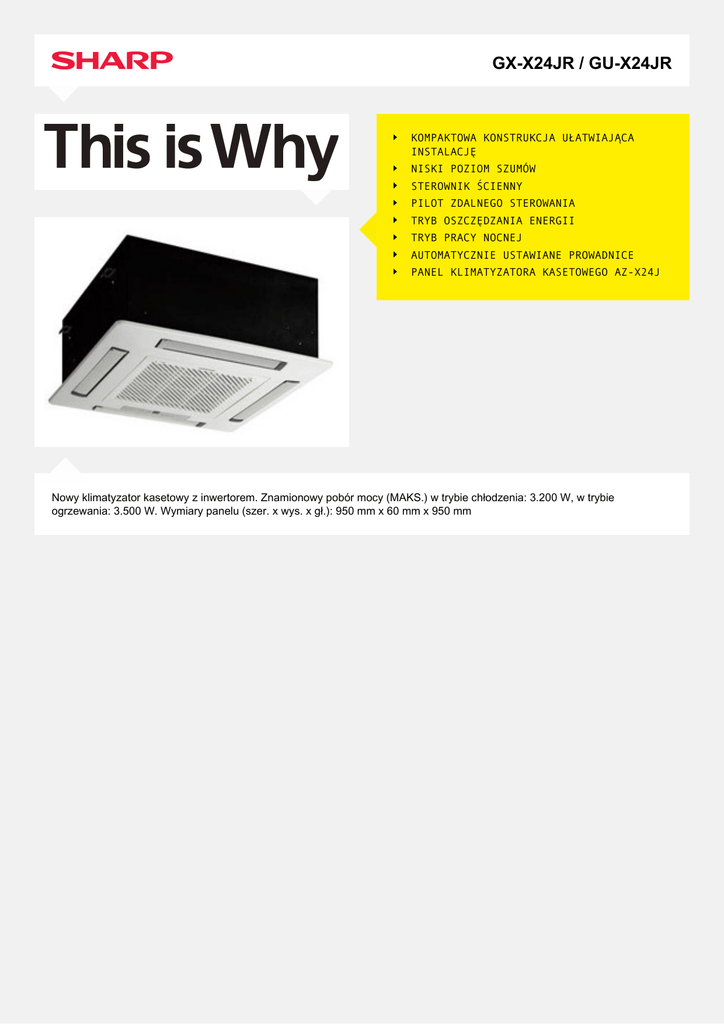 GX-X24JR / GU-X24JR KOMPAKTOWA KONSTRUKCJA UŁATWIAJĄCA INSTALACJĘ NISKI POZIOM SZUMÓW STEROWNIK ŚCIENNY PILOT ZDALNEGO STEROWANIA TRYB OSZCZĘDZANIA ENERGII TRYB PRACY NOCNEJ AUTOMATYCZNIE USTAWIANE PROWADNICE PANEL KLIMATYZATORA KASETOWEGO AZ-X24J Nowy klimatyzator kasetowy z inwertorem. Znamionowy pobór mocy (MAKS.) w trybie chłodzenia: 3.200 W, w trybie ogrzewania: 3.500 W. Wymiary panelu (szer. x wys. x gł.): 950 mm x 60 mm x 950 mm OGÓLNE Wydajność chłodzenia (kW): 7,0 Wydajność chłodzenia min.-maks. (kW): 1,73-7,0 Wydajność ogrzewania (kW): 8,0 Wydajność ogrzewania min.-maks. (kW): 1,24-8,0 Zasilanie (V / Hz): 230-240 - 50 Natężenie prądu podczas chłodzenia (A): 13,60 Natężenie prądu podczas ogrzewania (A): 11,20 Pobór mocy w trybie chłodzenia (W): 2,49 Pobór mocy w trybie chłodzenia min-maks (W): 0,75-2,49 Pobór mocy w trybie ogrzewania (W): 2,31 Pobór mocy w trybie ogrzewania min-maks (W): 0,70-2,31 Norma EER Cool: 2,81 Wydajność cieplna (COP): 3,46 Klasa sprawności energetycznej: w trybie chłodzenia: C Roczne zużycie energii (kWh): 1245 Klasa sprawności energetycznej: Ogrzewanie (umiarkowana strefa klimatyczna): B Natężenie szumów (jednostka zewnętrzna) (tr. Hi/Lo Chłodzenie) w dB(A): 47/42 Ciśnienie szumów (jednostka zewnętrzna) w dB (A): 59 Wydajność wentylatora - jednostka wewnętrzna (tryby Hi, Cool) w m³/min: 19,7 Wymiary jednostki wewnętrznej (szer. x gł. x wys.) w mm: 913 x 680 x 378 Waga netto jednostki wewnętrznej (kg): 30 Waga netto jednostki zewnętrznej (kg): 51 Średnica rurki gazowej (w calach): 5/8 Czynnik chłodzący: R410A Maksymalna długość rurki (m): 5-30 Maksymalna długość bez ładowania (m): 5 Maksymalna różnica wysokości (m): 15 www.sharp.pl Powered by TCPDF (www.tcpdf.org) SHARP ELECTRONICS (EUROPE) GMBH SPółKA Z O. O. ODDZIAł W POLSCE UL. POLECZKI 33 BUDYNEK A2 02-822 WARSZAWA TEL.: +48 22 545 81 00 FAKS: +48 22 545 81 00 FAKS: +48 22 545 81 05 WWW.SHARP.PL