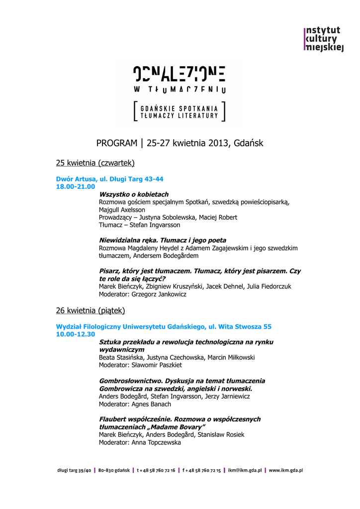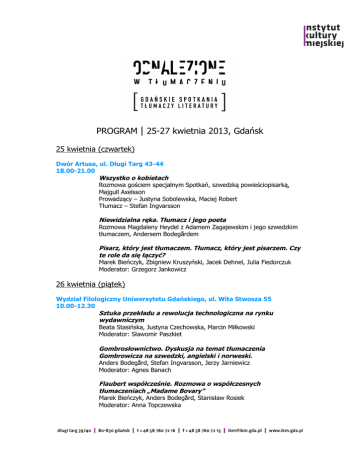 PROGRAM | 25-27 kwietnia 2013, Gdańsk 25 kwietnia (czwartek) Dwór Artusa, ul. Długi Targ 43-44 18.00-21.00 Wszystko o kobietach Rozmowa gościem specjalnym Spotkań, szwedzką powieściopisarką, Majgull Axelsson Prowadzący – Justyna Sobolewska, Maciej Robert Tłumacz – Stefan Ingvarsson Niewidzialna ręka. Tłumacz i jego poeta Rozmowa Magdaleny Heydel z Adamem Zagajewskim i jego szwedzkim tłumaczem, Andersem Bodegårdem Pisarz, który jest tłumaczem. Tłumacz, który jest pisarzem. Czy te role da się łączyć? Marek Bieńczyk, Zbigniew Kruszyński, Jacek Dehnel, Julia Fiedorczuk Moderator: Grzegorz Jankowicz 26 kwietnia (piątek) Wydział Filologiczny Uniwersytetu Gdańskiego, ul. Wita Stwosza 55 10.00-12.30 Sztuka przekładu a rewolucja technologiczna na rynku wydawniczym Beata Stasińska, Justyna Czechowska, Marcin Miłkowski Moderator: Sławomir Paszkiet Gombrosłownictwo. Dyskusja na temat tłumaczenia Gombrowicza na szwedzki, angielski i norweski. Anders Bodegård, Stefan Ingvarsson, Jerzy Jarniewicz Moderator: Agnes Banach Flaubert współcześnie. Rozmowa o współczesnych tłumaczeniach „Madame Bovary” Marek Bieńczyk, Anders Bodegård, Stanisław Rosiek Moderator: Anna Topczewska 13.00-14.00 Stefan Ingvarsson – Co zrobić, żeby pikietowe cioty były odpowiednio przegięte po szwedzku w "Lubiewie" Witkowskiego? Refleksje tłumacza nad przekładem Anders Bodegård – Okiem i ręką: kilka słów o pracy poetyckiej Wisławy Szymborskiej i jej tłumaczy 13.00-15.00 14.15-15.15 Warsztat Magdaleny Heydel: Co mogła, to zrobiła. Przekład prozy Virginii Woolf „Śmierć ćmy” jako doświadczenie.* Jerzy Jarniewicz – Tłumacz w roli autora. Sukcesja czy przewrót pałacowy? Adam Pomorski – Czy przekład literacki jest dzisiaj możliwy? Instytut Kultury Miejskiej, ul. Długi Targ 39/40 godz. 17.30 Nie wolno kłamać. Tłumacz dzieciom. O literaturze dla dzieci w przekładzie* Katarzyna Skalska, Bogusława Sochańska, Barbara Gawryluk, Tomasz Kuźmicki Moderator: Magdalena Heydel Na spotkanie zapraszamy rodziców z dziećmi – równocześnie z panelem odbędą się również warsztaty dla najmłodszych przygotowane przez Wydawnictwo EneDueRabe. Gdańska Galeria Güntera Grassa, ul. Szeroka 34/35, 36, 37 godz. 19.00 „Spojrzenia” - wernisaż wystawy fotograficznej Cato Leina Podczas wystawy zaprezentujemy portrety polskich i zagranicznych pisarzy i tłumaczy autorstwa szwedzkiego fotografika, Cato Leina. Wystawa otwarta będzie do 12 maja. 27 kwietnia (sobota) Instytut Kultury Miejskiej, ul. Długi Targ 39/40 11.00-12.30 To samo nie tak samo. Zakamarkowe zabawy w słowa.* prowadzenie: Agnieszka Stróżyk, tłumaczka; warsztat dla dzieci (5-10 lat) Nadbałtyckie Centrum Kultury, ul. Korzenna 33/35 11.00-12.45 Pisarze podróżujący i osiadli - tłumacze rzeczywistości Joanna Bator, Grażyna Plebanek, Szczepan Twardoch Moderator: Anna Dziewit-Meller Koszmar złych tłumaczeń. Krytyka przekładu w Polsce. Jacek Dehnel, Anna Topczewska, Justyna Sobolewska, Michał Chaciński Moderator: Anna Dziewit–Meller 13.00-14.45 Sytuacja tłumaczy literatury w Polsce. Czy w Szwecji jest podobnie? Sławomir Paszkiet, Justyna Czechowska, Jerzy Jarniewicz, Stefan Ingvarsson Moderator: Katarzyna Tubylewicz Tłumaczyć poezję Julia Fiedorczuk, Tadeusz Dąbrowski, Dariusz Suska, Irena Grönberg Moderator: Agnieszka Wolny-Hamkało *zapisy i kontakt: [email protected] Wstęp na wszystkie wydarzenia jest bezpłatny, wcześniejszej rejestracji wymaga wyłącznie udział w warsztatach Więcej informacji na: www.odnalezionewtlumaczeniu.pl