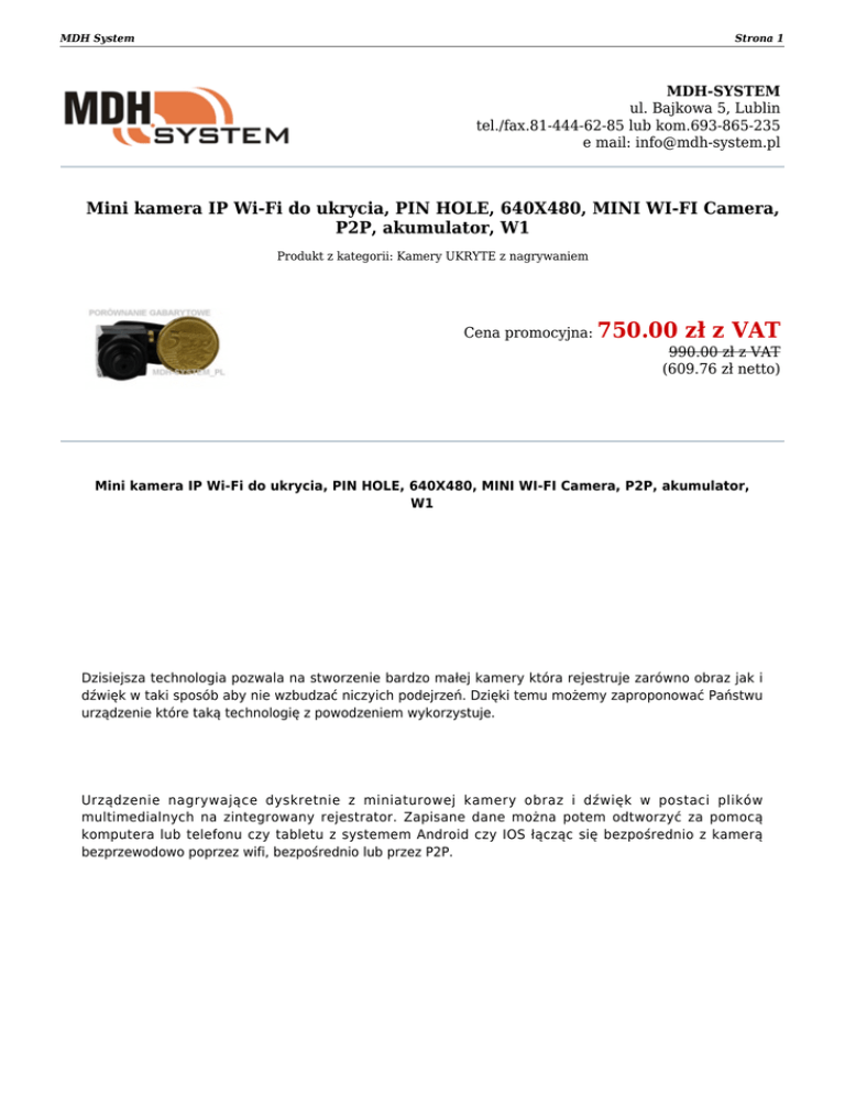 MDH System Strona 1 MDH-SYSTEM ul. Bajkowa 5, Lublin tel./fax.81-444-62-85 lub kom.693-865-235 e mail: [email protected] Mini kamera IP Wi-Fi do ukrycia, PIN HOLE, 640X480, MINI WI-FI Camera, P2P, akumulator, W1 Produkt z kategorii: Kamery UKRYTE z nagrywaniem Cena promocyjna: 750.00 zł z VAT 990.00 zł z VAT (609.76 zł netto) Mini kamera IP Wi-Fi do ukrycia, PIN HOLE, 640X480, MINI WI-FI Camera, P2P, akumulator, W1 Dzisiejsza technologia pozwala na stworzenie bardzo małej kamery która rejestruje zarówno obraz jak i dźwięk w taki sposób aby nie wzbudzać niczyich podejrzeń. Dzięki temu możemy zaproponować Państwu urządzenie które taką technologię z powodzeniem wykorzystuje. Urządzenie nagrywające dyskretnie z miniaturowej kamery obraz i dźwięk w postaci plików multimedialnych na zintegrowany rejestrator. Zapisane dane można potem odtworzyć za pomocą komputera lub telefonu czy tabletu z systemem Android czy IOS łącząc się bezpośrednio z kamerą bezprzewodowo poprzez wifi, bezpośrednio lub przez P2P. MDH System Strona 2 Kamera została tak skonstruowana aby można ją było umieścić lub zabudować w dowolnym miejscu . Głowica kamery jest umieszczona na przewodzie o długości ok 180 cm podłączona do modułu rejestartora. Taka konstrukcja ułatwia montaż kamery praktycznie w każdym mniejscu co przy konstrukcji jednomodułowej nie byłoby już takie proste. Pakiet akumulatorów po pełnym naładowaniu pozwala na pracę do 60 minut. Obraz przekazywany przez tą kamerę można odbierać dzięki połączeniu wifi praktycznie w każdym miejscu na ziemi gdzie jest dostęp do internetu. Kamerę można połączyć ze smartfonem z ustawioną funkcją hotspotu lub mobilnym routerem GSM co powoduje że można się z nią swobodnie przemieszczać, a przekazywany przez nią obraz i dźwięk można oglądać np. na innym smartfonie czy tablecie w zupełnie innym miejscu niezależnie od odległości. Jedyny warunek to udostępnienie połączenia w technologii LTE ( przy innych połączeniach np.3G, HSPA sprzęt może nie dzialac poprawnie) Kolejną zaletą tej kamery jest banalnie prosta konfiguracja połączenia wifi . Kamera po włączeniu emituje własny sygnał wifi z którym wystarczy połączyć laptop czy np smartfon na którym następnie po wgraniu odpowiedniej darmowej aplikacji będzie widoczny obraz z kamery. MDH System Strona 3 Urządzenie można umieścić wszędzie tam gdzie potrzebny jest dyskretny podgląd i zapis audio-video bez angażowania w to dużych środków finansowych i gdzie instalacja klasycznego monitoringu nie wchodzi w grę. Dzięki niewielkim rozmiarom urządzenie można zainstalować wszędzie tam gdzie ma być dokonane nagranie zwracając je obiektywem kamery w kierunku obszaru spodziewanego zdarzenia które chcemy zarejestrować lub podglądać i podsłuchiwać „na żywo”. Powstałe w ten sposób nagranie można następnie zarchiwizować na dysku twardym dowolnego komputera zgrywając bezpośrednio z karty pamięci. Dla ułatwienia lokalizacji w czasie, urządzenie zapisuje na nagraniu datę i godzinę co pozwala na ustalenie chronologii nagranych zdarzeń. Zapisane w pamięci umieszczonej w urządzeniu pliki zawierające materiał filmowy z nagrania są kompresowane tak by można było przy zachowaniu dobrej jakości optymalnie wykorzystać przestrzeń nośnika tej pamięci. Specyfikacja : - Rozdzielczość wideo - 640x480 - Bezprzewodowa komunikacja WIFI - Detekcja ruchu MDH System - Format wideo - AVI - Zdalna obsługa urządzenia przy pomocy komputera lub telefonu - Podgląd obrazu z dowolnego miejsca - Funkcja alarmu - Kąt widzenia obiektywu kamery ok 50 stopni - Wbudowany mikrofon - Pamięć wbudowana - brak - Obsługa kart pamięci - MicroSD o pojemności do 32GB ( w komplecie 4 GB) - Możliwość wyświetlenia daty i godziny na zdjęciach i nagraniach - Wbudowany akumulator litowo-jonowy o wysokiej wydajności - Nieograniczony czas pracy - po podpięciu do stałego zasilania Strona 4 MDH System Strona 5 - Wygodne, eleganckie, funkcjonalne - Ładowanie - USB W zestawie: - Kamera szpiegowska wifi - Kabelek USB - Ładowarka - Instrukcja w j. polskim - Oryginalne opakowanie Zapraszamy do naszego sklepu internetowego www.mdh-system.pl MDH System Strona 6 Dokument wygenerowany 2017-03-04 o godzinie 06:53