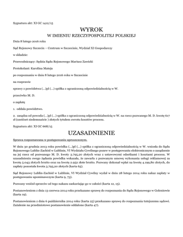 Sygnatura akt: XI GC 1412/15 WYROK W IMIENIU RZECZYPOSPOLITEJ POLSKIEJ Dnia 8 lutego 2016 roku Sąd Rejonowy Szczecin – Centrum w Szczecinie, Wydział XI Gospodarczy w składzie: Przewodniczący: Sędzia Sądu Rejonowego Mariusz Zawicki Protokolant: Karolina Mateja po rozpoznaniu w dniu 8 lutego 2016 roku w Szczecinie na rozprawie sprawy z powództwa (...)pl (...) spółka z ograniczoną odpowiedzialnością w W. przeciwko M. D. o zapłatę 1. oddala powództwo. 2. zasądza od powoda (...)pl (...) spółka z ograniczoną odpowiedzialnością w W. na rzecz pozwanego M. D. kwotę 617 zł (sześćset siedemnaście ) złotych tytułem zwrotu kosztów procesu. Sygnatura akt: XI GC 668/15 UZASADNIENIE Sprawa rozpoznawana w postępowaniu uproszczonym. W dniu 30 grudnia 2013 roku powódka (...)pl (...) spółka z ograniczoną odpowiedzialnością w W. wniosła do Sądu Rejonowego Lublin-Zachód w Lublinie, VI Wydziału Cywilnego pozew w postępowaniu elektronicznym o zasądzenie na jej rzecz od pozwanego M. D. kwoty 3.795,20 złotych wraz z ustawowymi odsetkami i kosztami procesu. W uzasadnieniu swego żądania powódka wskazała, że zawarła z pozwanym umowę wykonania usługi reklamowej za kwotę 5.043 złotych brutto oraz na kwotę 2.952 złote brutto. Pozwany dokonał wpłat na kwotę 4.199,80 złotych, do zapłaty pozostała kwota 3.795,20 złotych (karta 65). Sąd Rejonowy Lublin-Zachód w Lublinie, VI Wydział Cywilny wydał w dniu 28 lutego 2014 roku nakaz zapłaty w postępowaniu upominawczym (karta 9, 73). Pozwany wniósł sprzeciw od tego nakazu zaskarżając go w całości (karta 12, 15). Postanowieniem z dnia 13 czerwca 2014 roku przekazano sprawę do rozpoznania do Sądu Rejonowego w Goleniowie (karta 19). Postanowieniem z dnia 6 października 2014 roku (karta 25) przekazano sprawę do rozpoznania tutejszemu sądowi. Zażalenie na przedmiotowe postanowienie oddalono (karta 47). Uzupełniając braki pozwu w trybie art. 50537 § 1 k.p.c. powód podtrzymał żądanie (karta 96) wniósł o zasądzenie kwoty 3.795,20 złotych z odsetkami ustawowymi od dnia 20 grudnia 2013 roku do dnia zapłaty. Żądanie uzasadniono faktem zawarcia umowy i brakiem zapłaty ze strony pozwanego. Pozwany zlecił powodowi wykonanie usługi reklamowej za kwotę 5.043 złotych, oraz stronę internetową za kwotę 2.952 złotych. Powód wykonał umowę, wystawiając 9 faktur, pozwany nie zapłacił faktur na łączną kwotę 3.277,95 złotych. W odpowiedzi na pozew (karta 147, karta 163) pozwany wniósł o oddalenie powództwa i zasądzenie kosztów procesu. Pozwany wskazał, że zapłacił kwoty wynikające z obu umów na okoliczność czego przedstawił dowody zapłaty. Pozwany wskazał również, że on umowy nie zawierał, jedynie jego żona, zaś powód nie wykazał sposobu wyliczenia należności wynikającej z pozwu. Na rozprawie (karta 179) w dniu 8 lutego 2016 roku powód nie zmienił stanowiska w sprawie. Sąd ustalił następujący stan faktyczny: (...)pl (...) spółka z ograniczoną odpowiedzialnością w W. zawarła z J. D. umowy z dnia 22 maja 2012 roku w przedmiocie stworzenia i publikacji strony internetowej dotyczącej działalności gospodarczej oraz druga umowa z dnia 17 sierpnia 2012 roku w przedmiocie świadczenia usług reklamowych w postaci przeprowadzania kampanii linków sponsorowanych w wyszukiwarce google. Obie umowy zostały zawarte przez telefon. Niesporne a ponadto dowód: - zapis rozmowy na płycie CD, karta 100; - umowa, karta 101; - załączniki do umowy, karta 103-104; - karta 107 zrzut z ekranu; - umowa, karta 108; - załączniki do umowy, karta 110 -111; - wydruk e-mail, karta 120 -121; Tytułem zapłaty za usługi (...) dokonała przelewów na konto spółki (...).pl (...) dokonał przelewów na niżej określone kwoty w następujących datach: 1. 1.033,20 złotych w dniu 4 lipca 2012 roku; 2. 500 złotych w dniu 23 sierpnia 2012 roku; 3. 988,30 złotych w dniu 10 września 2012 roku; 4. 765,05 złotych w dniu 12 października 2012 roku; 5. 159,90 złotych w dniu 21 listopada 2012 roku 6. 338,74 złotych w dniu 21 listopada 2012 roku; 7. 159 złotych w dniu 14 grudnia 2012 roku; 8. 1.277,95 złotych w dniu 14 grudnia 2012 roku; 9. 1.000 złotych; 10. 352,84 złotych w dniu 4 stycznia 2013 roku; 11. 159,90 złotych w dniu 30 stycznia 2013 roku; 12. 353,01 złotych w dniu 30 stycznia 2-013 roku; 13. 159 złotych w dniu 20 lutego 2013 roku; 14. 160 złotych w dniu 4 września 2013 roku. Niesporne a ponadto dowód: - przelewy, karta 151 – 157; (...)pl (...) spółka z ograniczoną odpowiedzialnością w W. wytworzyła dokumenty – faktury oraz zestawienia i wezwanie do zapłaty. Dowód: - dokumenty, karta 102, 105, 106, 109, 112, 119,122, 124, 126, 128, 130, 132, 134, 135. Sąd zważył, co następuje: Roszczenie powódki jest bezzasadne. W treści uzasadnienia pozwu powódka wskazuje, że strony zawarły umowy w przedmiocie stworzenia i publikacji strony internetowej dotyczącej jego działalności oraz druga umowa z dnia 17 sierpnia 2012 roku w przedmiocie świadczenia usług reklamowych w postaci przeprowadzania kampanii linków sponsorowanych w wyszukiwarce google. Niniejsza okoliczność nie była sporna. W ocenie Sądu podstawę prawną powództwa stanowi art. 627 kodeksu cywilnego i następcę (umowa o dzieło). Pozwany kwestionuje fakt zawarcia przedmiotowej umowy, wskazując, że umowę zawarła jego żona. Okoliczność ta jest niesporna. Z uwagi na fakt, że pozwanym był M. D., niniejszą okoliczność podniósł w odpowiedzi na pozew, powództwo podlegało oddaleniu. Ponadto, stosownie do zasadnych zarzutów strony pozwanej strona powodowa nie wskazała sposobu wyliczenia należności objętej pozwem, stąd sąd miał wątpliwość przy ustaleniu w jaki sposób powstała ta kwota, jaką kwotę J. D. zobowiązała się uiszczać na rzecz powoda. Na niniejszą okoliczność przedstawiono wydruki z komputera zawierające pewne sformułowania oraz pewne liczby. 