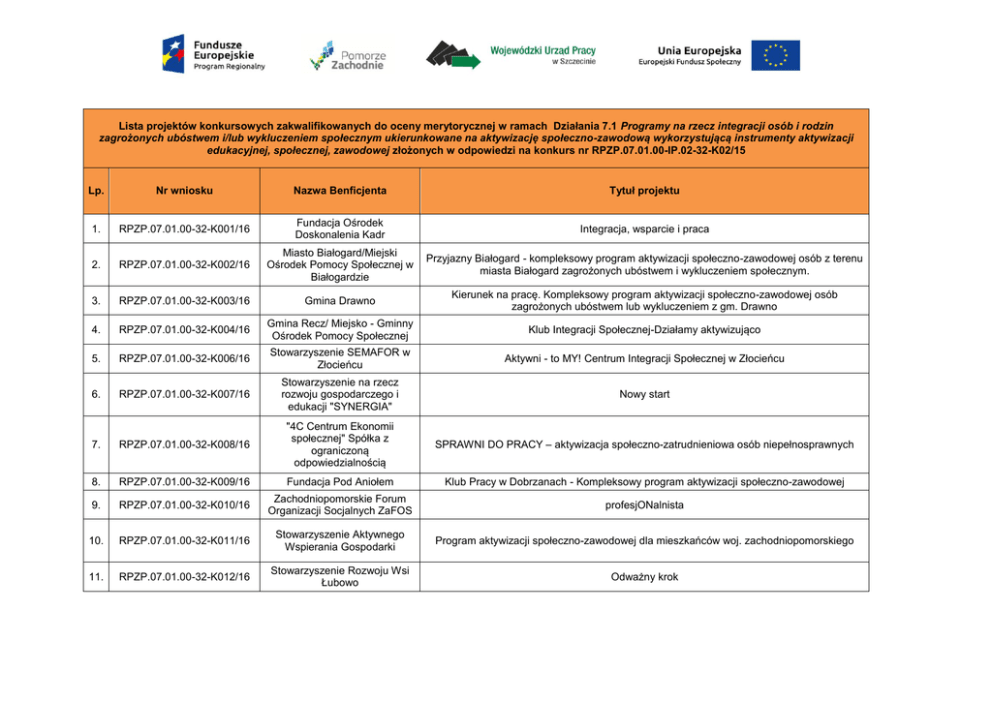 Lista projektów konkursowych zakwalifikowanych do oceny merytorycznej w ramach Działania 7.1 Programy na rzecz integracji osób i rodzin zagrożonych ubóstwem i/lub wykluczeniem społecznym ukierunkowane na aktywizację społeczno-zawodową wykorzystującą instrumenty aktywizacji edukacyjnej, społecznej, zawodowej złożonych w odpowiedzi na konkurs nr RPZP.07.01.00-IP.02-32-K02/15 Lp. Nr wniosku Nazwa Benficjenta Tytuł projektu 1. RPZP.07.01.00-32-K001/16 Fundacja Ośrodek Doskonalenia Kadr Integracja, wsparcie i praca 2. RPZP.07.01.00-32-K002/16 Miasto Białogard/Miejski Ośrodek Pomocy Społecznej w Białogardzie Przyjazny Białogard - kompleksowy program aktywizacji społeczno-zawodowej osób z terenu miasta Białogard zagrożonych ubóstwem i wykluczeniem społecznym. 3. RPZP.07.01.00-32-K003/16 Gmina Drawno Kierunek na pracę. Kompleksowy program aktywizacji społeczno-zawodowej osób zagrożonych ubóstwem lub wykluczeniem z gm. Drawno 4. RPZP.07.01.00-32-K004/16 Gmina Recz/ Miejsko - Gminny Ośrodek Pomocy Społecznej Klub Integracji Społecznej-Działamy aktywizująco 5. RPZP.07.01.00-32-K006/16 Stowarzyszenie SEMAFOR w Złocieńcu Aktywni - to MY! Centrum Integracji Społecznej w Złocieńcu 6. RPZP.07.01.00-32-K007/16 Stowarzyszenie na rzecz rozwoju gospodarczego i edukacji "SYNERGIA" Nowy start 7. RPZP.07.01.00-32-K008/16 "4C Centrum Ekonomii społecznej" Spółka z ograniczoną odpowiedzialnością SPRAWNI DO PRACY – aktywizacja społeczno-zatrudnieniowa osób niepełnosprawnych 8. RPZP.07.01.00-32-K009/16 Fundacja Pod Aniołem Klub Pracy w Dobrzanach - Kompleksowy program aktywizacji społeczno-zawodowej 9. RPZP.07.01.00-32-K010/16 Zachodniopomorskie Forum Organizacji Socjalnych ZaFOS profesjONalnista 10. RPZP.07.01.00-32-K011/16 Stowarzyszenie Aktywnego Wspierania Gospodarki Program aktywizacji społeczno-zawodowej dla mieszkańców woj. zachodniopomorskiego 11. RPZP.07.01.00-32-K012/16 Stowarzyszenie Rozwoju Wsi Łubowo Odważny krok RPZP.07.01.00-32-K013/16 Polskie Stowarzyszenie na Rzecz Osób z Upośledzeniem Umysłowym Koło w Kamieniu Pomorskim My też pracujemy II 13. RPZP.07.01.00-32-K014/16 Fundacja Na Rzecz Wspierania Integracji i Aktywności Społeczności Lokalnych "Każdy z nas coś umie" Zaradność, wspólne dobro- Centrum Integracji Społecznej jako instrument zapobiegania wykluczeniu społecznemu. Dofinansowanie funkcjonowania Centrum Integracji Społecznej utworzonego na terenie Gminy Postomino. 14. RPZP.07.01.00-32-K015/16 Stowarzyszenie Aktywność bez barier Powrót do aktywności 15. RPZP.07.01.00-32-K016/16 Fundacja "Rozwój-Integracja" Kompleksowy program aktywizacji społeczno-zawodowej w Centrum Integracji Społecznej w Rogozinie szansą na aktywność i uzyskanie zatrudnienia dla osób dotkniętych ubóstwem i/lub zagrożeniem społecznym 16. RPZP.07.01.00-32-K017/16 Fundacja Inicjowania rozwoju społecznego - oddział w województwie zachodniopomorskim ,,Aktywni razem!" 17. RPZP.07.01.00-32-K018/16 Fundacja Oświatowa Europejskie Centrum Edukacyjne CENTRUM WSPARCIA SPOŁECZNEGO-SZANSĄ NA ASYMILACJĘ I INTEGRACJĘ SPOŁECZNO-ZAWODOWĄ OSÓB BEZDOMNYCH I ZAGROŻONYCH WYKLUCZENIEM MIESZKANIOWYM 18. RPZP.07.01.00-32-K019/16 Stowarzyszenie Pomocy "Przytulisko" w Białogardzie Bilet do pracy - aktywizacja społeczno-zawodowa w Centrum Integracji Społecznej w Białogardzie osób zagrożonych ubóstwem i wykluczeniem społecznym z terenu powiatu białogardzkiego. 19. RPZP.07.01.00-32-K020/16 Fundacja Nowy Horyzont Aktywna integracja w powiecie wałeckim 20. RPZP.07.01.00-32-K021/16 Fundacja Aktywnej Rehabilitacja "FAR" Aktywizacja społeczna i zawodowa drogą do niezależności osób z niepełnosprawnością z województwa zachodniopomorskiego. 21. RPZP.07.01.00-32-K022/16 Towarzystwo Wspierania Inicjatyw KulturalnoSpołecznych "TWIKS" Razem możemy więcej - program aktywizacji społecznej i zawodowej 22. RPZP.07.01.00-32-K023/16 Galicyjska Fundacja "Wsparcie, Integracja, Rozwój" Krok do samodzielności - aktywna integracja osób niepełnosprawnych. 23. RPZP.07.01.00-32-K024/16 Polskie Stowarzyszenie na Rzecz Osób z Upośledzeniem Umysłowym Koło w Szczecinie Ku samodzielności. Aktywizacja społeczna i zawodowa osób ze znaczną, umiarkowaną niepełnosprawnością intelektualną oraz ich rodzin w ramach usług Warsztatu Terapii Zajęciowe 12. 24. RPZP.07.01.00-32-K025/16 Stowarzyszenie "Współistnienie" "Aktywni i kompetentni". 25. RPZP.07.01.00-32-K026/16 Gmina Połczyn-Zdrój Nowy zawód, nowa praca - kompleksowy program wsparcia dla osób zagrożonych ubóstwem i/lub wykluczeniem społecznym z gminy Połczyn-Zdrój 26. RPZP.07.01.00-32-K027/16 Lubelski Ośrodek Samopomocy Czas na nową szansę ! 27. RPZP.07.01.00-32-K028/16 Stowarzyszenie na Rzecz Powiatu Sławieńskiego Praca gwarantuje jutro