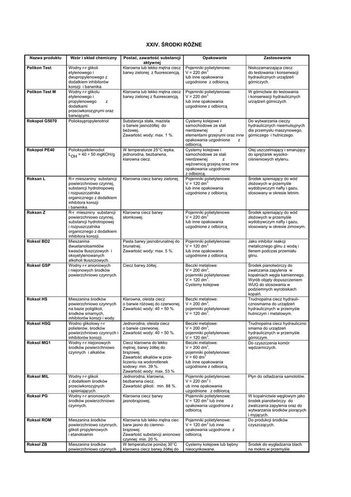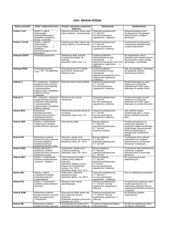 XXIV. ŚRODKI RÓŻNE Nazwa produktu Polikon Test Polikon Test M Rokopol G5070 Wzór i skład chemiczny Wodny r-r glikoli etylenowego i dwupropylenowego z dodatkiem inhibitorów korozji i barwnika. Wodny r-r glikolu etylenowego i propylenowego z dodatkami przeciwkorozyjnymi oraz barwiącymi. Polioksypropylenotriol Postać, zawartość substancji aktywnej Klarowna lub lekko mętna ciecz barwy zielonej z fluorescencją. Opakowanie Zastosowanie Pojemniki polietylenowe: V = 220 dm3 lub inne opakowania uzgodnione z odbiorcą Niskozamarzająca ciecz do testowania i konserwacji hydraulicznych urządzeń górniczych. Klarowna lub lekko mętna ciecz barwy zielonej z fluorescencją. Pojemniki polietylenowe: V = 220 dm3 lub inne opakowania uzgodnione z odbiorcą W górnictwie do testowania i konserwacji hydraulicznych urządzeń górniczych. Substancja stała, mazista o barwie jasnożółtej do beżowej. Zawartość wody: max. 1 %. Cysterny kolejowe i samochodowe ze stali nierdzewnej z elementami grzejnymi oraz inne opakowania uzgodnione z odbiorcą. Cysterny kolejowe i samochodowe ze stali nierdzewnej z wężownicą grzejną oraz inne opakowania uzgodnione z odbiorcą. Pojemniki polietylenowe: V = 120 dm3 lub inne opakowania uzgodnione z odbiorcą Do wytwarzania cieczy hydraulicznych nieemulsyjnych dla przemysłu maszynowego, górniczego i hutniczego. Środek spieniający do wód złożowych w przemyśle wydobywczym nafty i gazu, stosowany w okresie letnim. Klarowna ciecz barwy słomkowej. Pojemniki polietylenowe V = 220 dm3 lub inne opakowania uzgodnione z odbiorcą Środek spieniający do wód złożowych w przemyśle wydobywczym nafty i gazu, stosowany w okresie zimowym. Pasta barwy jasnobrunatnej do brunatnej. Zawartość wody: max. 5 %. Pojemniki polietylenowe: V = 120 dm3 lub inne opakowania uzgodnione z odbiorcą Jako inhibitor reakcji metalicznego glinu z wodą i tlenem podczas przemiału glinu. Środek pianotwórczy do zwalczania zapylenia w kopalniach węgla kamiennego. Wyrób objęty dopuszczeniem WUG do stosowania w podziemnych wyrobiskach kopalń. Trudnopalna ciecz hydraulicznosmarna do urządzeń hydraulicznych w przemyśle hutniczym i metalowym. Rokopol PE40 Polioksyalkilenodiol LOH = 40 ÷ 50 mgKOH/g W temperaturze 25°C lepka, jednorodna, bezbarwna, klarowna ciecz. Roksan L R-r mieszaniny substancji powierzchniowo czynnej, substancji hydrotropowej i rozpuszczalnika organicznego z dodatkiem inhibitora korozji i barwnika. R-r mieszniny substancji powierzchniowo czynnej, substancji hydrotropowej i rozpuszczalnika organicznego z dodatkiem inhibitora korozji. Mieszanina dwuetanoloamidów kwasów tłuszczowych i oksyetylenowanych alkoholi tłuszczowych. Wodny r-r anioniowych i niejonowych środków powierzchniowo czynnych. Klarowna ciecz barwy zielonej. Ciecz barwy żółtej. Beczki metalowe: V = 200 dm3, pojemniki polietylenowe: V = 120 dm3. Cysterny kolejowe Mieszanina środków powierzchniowo czynnych na bazie poliglikoli, środków smarnych, inhibitorów korozji i wody. Wodno glikolowy r-r polieterów, środków powierzchniowo czynnych i inhibitorów korozji. Wodny r-r niejonowych środków powierzchniowo czynnych i alkaliów. Klarowna, oleista ciecz o barwie różowej do czerwonej. Zawartość wody: 40 ÷ 50 %. Beczki metalowe: V = 200 dm3, pojemniki polietylenowe: V = 120 dm3. Jednorodna, oleista ciecz o barwie czerwonej. Zawartość wody: 40 ÷ 50 %. Beczki metalowe: V = 200 dm3, pojemniki polietylenowe: V = 120 dm3. Beczki metalowe: V = 200 dm3, pojemniki polietylenowe: V = 60 dm3 lub inne opakowania uzgodnione z odbiorcą. Trudnopalna ciecz hydrauliczno smarna do urządzeń hydraulicznych w przemyśle górniczym. Do czyszczenia komór wędzarniczych. Pojemniki polietylenowe: V = 220 dm3 l ub inne opakowania uzgodnione z odbiorcą Pojemniki polietylenowe: V = 120 dm3 lub inne opakowania uzgodnione z odbiorcą Płyn do odladzania samolotów. Roksan Z Roksol BD2 Roksol GSP Roksol HS Roksol HSG Roksol MG1 Roksol MIL Roksol PG Wodny r-r glikoli z dodatkiem środków przeciwkorozyjnych i spieniających. Wodny r-r anionowych środków powierzchniowo czynnych. Roksol ROM Mieszanina środków powierzchniowo czynnych, glikoli propylenowych i etanoloamin Roksol ZB Mieszanina środków powierzchniowo czynnych Ciecz klarowna do lekko mętnej, barwy żółtej do brązowej. Zawartość alkaliów w przeliczeniu na wodorotlenek sodowy: min. 39 %. Zawartość wody: max. 53 % Jednorodna, klarowna, bezbarwna ciecz. Zawartość glikoli: min. 88 %. Klarowna ciecz barwy jasnobrązowej. Klarowna lub lekko mętna ciec barw jasno do ciemnobrązowej. Zawartość substancji anionowo czynnej: min. 20 %. W temperaturze poniżej 30°C klarowna ciecz barwy żółtej do Pojemniki polietylenowe: V = 120 dm3 lub inne opakowania uzgodnione z odbiorcą Cysterny kolejowe lub bębny nieocynkowane. Olej uszczelniający i smarujący do sprężarek wysokociśnieniowych etylenu. W kopalnictwie węglowym jako środek pianotwórczy do zwalczania zapylenia oraz do wytwarzania środków piorących i myjących. Do produkcji środków czyszczących. Środek do wygładzania blach na mokro w przemyśle i inhibitorów korozji. Nazwa produktu Wzór i skład chemiczny Rotanina O Wodny r-r soli sodowych polikondensatów formaldehydowych sulfonowanego fenolu. Roteor Wodno alkoholowy r-r związków powierzchniowo czynnych, substancji hydrotropowej, inhibitora korozji i stabilizatora piany. Wodny r-r kwasu ksylenosulfonowego i glikolu etylenowego. Utwardzacz UKOW jasnobrązowej. Zawartość suchej masy: 28 ÷ 38 %. Postać, zawartość substancji aktywnej Ciecz barwy wiśniowej o konsystencji syropu dobrze rozpuszczalna w wodzie. Zawartość suchej substancji: min. 45 %. Ciecz jednorodna barwy od niebieskiej do zielonej. Ciecz barwy brązowej do ciemno brązowej metalurgicznym. Opakowanie Zastosowanie Pojemniki polietylenowe: V = 60 ÷ 120 dm3. W przemyśle odlewniczym do przygotowania form odlewniczych. Cysterny stalowe ze stali kwas