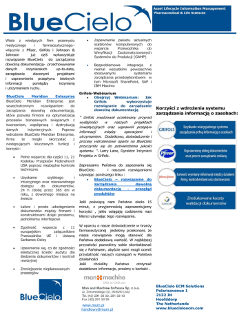 Wiele z wiodących firm przemysłu medycznego i farmaceutycznego– włącznie z Pfizer, Grifols i Johnson & Johnson już dziś wykorzystuje rozwiązanie BlueCielo do zarządzania dowolną dokumentacją- przechowywanie danych inżynierskich up-to-date, zarządzanie zleconymi projektami i usprawnienie przepływu istotnych informacji pomiędzy inżynierią i utrzymaniem ruchu. BlueCielo Meridian Enterprise BlueCielo Meridian Enterprise jest wszechstronnym rozwiązaniem do zarządzania dowolną dokumentacją, które pozwala firmom na optymalizację procesów biznesowych związanych z tworzeniem, współpracą i dystrybucją danych inżynieryjnych. Poprzez wdrożenie BlueCielo Meridian Enterprise, firmy te mogły skorzystać z następujących kluczowych funkcji i korzyści: Pełne wsparcie dla części 11, 21 Kodeksu Przepisów Federalnych USA poprzez niezbędne kontrole techniczne Uzyskanie szybkiego i intuicyjnego oraz niezawodnego dostępu do dokumentów, 24 h /dobę przez 365 dni w roku, z dowolnego miejsca na świecie Łatwe i proste udostępnianie dokumentów między firmami i konstruktorami dzięki prostemu, jednolitemu interfejsowi Zgodność wsparcia z 11 europejskim załącznikiem Przewodnika UE i Ustawą Sarbanes-Oxley Upewnienie się, co do zgodności elastycznej ścieżki audytu dla śledzenia dokumentów i kontroli rewizyjnej Zmniejszenie nieplanowanych przestojów Zapewnienie pakietu aktualnych szablonów komputerowych do wsparcia Przewodnika do Weryfikacji Zautomatyzowanych Systemów do Produkcji (GAMP) Bezproblemowa integracja z niemal wszystkimi powszechnie stosowanymi systemami zarządzania przedsiębiorstwem w tym Microsoft SharePoint, SAP i IBM Maximo Grifols-Webinarium Obejrzyj Webinarium: Jak Grifols wykorzystuje rozwiązanie do zarządzanie dowolną dokumentacją “ Grifols zrealizował oczekiwany przyrost wydajności w naszych projektach inwestycyjnych oraz usprawnił przepływ informacji między operacjami i utrzymaniem. Dodatkowo, doświadczenie i procesy wdrożeniowe oparte na BlueCielo przyczyniły się do potwierdzenia jakości systemu. "- Larry Lane, Dyrektor Inżynierii Projektu w Grifols. Korzyści z wdrożenia systemu zarządzania informacją o zasobach: Zapraszamy Państwa do zapoznania się BlueCielo i naszymi rozwiązaniami używając poniższego linku : BlueCielo – rozwiązanie do zarządzania dowolną dokumentacją przegląd produktów Jeśli poświęcą nam Państwo około 15 minut, z przyjemnością zaprezentujemy korzyści , jakie osiągają codziennie nasi klienci używając tego rozwiązania. W oparciu o nasze doświadczenie w branży farmaceutycznej jesteśmy przekonani, że nasze rozwiązania mogą stanowić dla Państwa dodatkową wartość. W najbliższej przyszłości pozwolimy sobie skontaktować się z Państwem, abyście sami mogli ocenić przydatność naszych rozwiązań w Państwa działalności Jeśli chcieliby Państwo otrzymać dodatkowe informacje, prosimy o kontakt . www.mum.pl [email protected] BlueCielo ECM Solutions Polarisavenue 1 2132 JH Hoofddorp The Netherlands www.bluecieloecm.com
