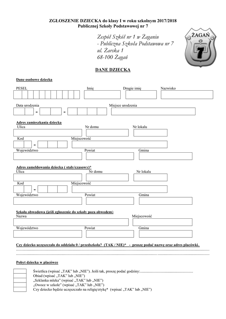 ZGŁOSZENIE DZIECKA do klasy I w roku szkolnym 2017/2018 Publicznej Szkoły Podstawowej nr 7 Zespół Szkół nr 1 w Żaganiu - Publiczna Szkoła Podstawowa nr 7 ul. Żarska 1 68-100 Żagań DANE DZIECKA Dane osobowe dziecka PESEL Imię Data urodzenia Adres zamieszkania dziecka Ulica Kod Drugie imię Nazwisko Miejsce urodzenia Nr domu Nr lokalu Miejscowość Województwo Powiat Adres zameldowania dziecka ( stały/czasowy)* Ulica Nr domu Kod Gmina Nr lokalu Miejscowość Województwo Powiat Szkoła obwodowa (jeśli zgłoszenie do szkoły poza obwodem) Nazwa Województwo Powiat Gmina Miejscowość Gmina Czy dziecko uczęszczało do oddziału 0 / przedszkola? (TAK / NIE)* - proszę podać nazwę oraz adres placówki.. ............................................................................................................................................................................................................ ..................................................................................................................................................... ....................................................... Pobyt dziecka w placówce Świetlica (wpisać „TAK” lub „NIE”). Jeśli tak, proszę podać godziny:........................................................ Obiad (wpisać „TAK” lub „NIE”) „Szklanka mleka” (wpisać „TAK” lub „NIE”) „Owoce w szkole” (wpisać „TAK” lub „NIE”) Czy dziecko będzie uczęszczało na religię/etykę* (wpisać „TAK” lub „NIE”) DANE RODZICÓW / PRAWNYCH OPIEKUNÓW Dane matki / prawnej opiekunki dziecka Imię Dane ojca / prawnego opiekuna dziecka Nazwisko Imię Telefon kontaktowy Telefon kontaktowy Adres zamieszkania matki / opiekunki Ulica Nr domu Kod Nazwisko Nr lokalu Miejscowość Adres zamieszkania ojca / opiekuna Ulica Nr domu Nr lokalu Kod Miejscowość - - Adres zameldowania matki / opiekunki Ulica Nr domu Kod Nr lokalu Miejscowość Adres zameldowania ojca / opiekuna Ulica Nr do mu Nr lokalu Kod Miejscowość - - Zakład pracy matki / opiekunki Zakład pracy ojca / opiekuna Nazwa i adres zakładu pracy, telefon, czas pracy Nazwa i adres zakładu pracy, telefon, czas pracy Dodatkowe informacje o dziecku 1. Zainteresowania.................................................................................................................................................................. ................................................................................................................................................................................................. ………………………………………………………………………………………………………………………….…… 2.Czy dziecko posiada: - Opinia Poradni Psychologiczno – Pedagogicznej? TAK/NIE - Orzeczenie o niepełnosprawności? TAK/NIE - Orzeczenie o potrzebie indywidualnego nauczania ? TAK/NIE - Orzeczenie o potrzebie kształcenia specjalnego? TAK /NIE *niepotrzebne skreślić (w przypadku posiadania w/w dokumentów należy dołączyć kopię w załączeniu) Informacja Na podst. ustawy o ochronie danych osobowych informuję, że ZS1- PSP 7 w Żaganiu zbiera i przetwarza dane osobowe dziecka i członków jego rodziny w zakresie dydaktyczno – wychowawczo – opiekuńczej działalności szkoły. Przysługuje Pani/u wgląd do swoich danych oraz uzupełniania, uaktualniania czy sprostowania w razie stwierdzenia, że dane są niekompletne, nieaktualne lub nieprawdziwe. Administrator danych osobowych dołoży wszelkich starań, aby dane były zbierane, przetwarzane i chronione zgodnie z prawem. Przetwarzanie danych odbywać się będzie zgodnie z ustawą o ochronie danych osobowych (Dz. U. z 2002 r., Nr 101, poz. 926 z późniejszymi zmianami). Oświadczenie Oświadczam, że dane przedłożone w niniejszym podaniu są zgodne ze stanem faktycznym. Zobowiązuję się do niezwłocznego poinformowania sekretariatu szkoły oraz wychowawcy o każdej zmianie danych osobowych własnych oraz dziecka. Zapoznałam/em się z powyższą informacją. Wyrażam zgodę na zbieranie i przetwarzanie danych osobowych mojego dziecka i członków mojej rodziny w zakresie dydaktyczno – wychowawczo – opiekuńczej działalności ZS1- PSP 7 w Żaganiu. Wyrażam zgodę na publikację zdjęć mojego dziecka na stronie internetowej oraz w mediach. Podpis rodziców / opiekunów prawnych Data zgłoszenia: ……………………………………………………..