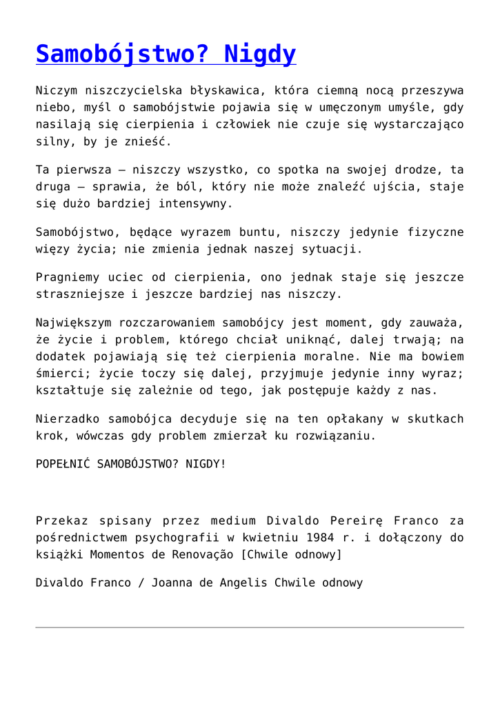 Samobójstwo? Nigdy Niczym niszczycielska błyskawica, która ciemną nocą przeszywa niebo, myśl o samobójstwie pojawia się w umęczonym umyśle, gdy nasilają się cierpienia i człowiek nie czuje się wystarczająco silny, by je znieść. Ta pierwsza – niszczy wszystko, co spotka na swojej drodze, ta druga – sprawia, że ból, który nie może znaleźć ujścia, staje się dużo bardziej intensywny. Samobójstwo, będące wyrazem buntu, niszczy jedynie fizyczne więzy życia; nie zmienia jednak naszej sytuacji. Pragniemy uciec od cierpienia, ono jednak staje się jeszcze straszniejsze i jeszcze bardziej nas niszczy. Największym rozczarowaniem samobójcy jest moment, gdy zauważa, że życie i problem, którego chciał uniknąć, dalej trwają; na dodatek pojawiają się też cierpienia moralne. Nie ma bowiem śmierci; życie toczy się dalej, przyjmuje jedynie inny wyraz; kształtuje się zależnie od tego, jak postępuje każdy z nas. Nierzadko samobójca decyduje się na ten opłakany w skutkach krok, wówczas gdy problem zmierzał ku rozwiązaniu. POPEŁNIĆ SAMOBÓJSTWO? NIGDY! Przekaz spisany przez medium Divaldo Pereirę Franco za pośrednictwem psychografii w kwietniu 1984 r. i dołączony do książki Momentos de Renovação [Chwile odnowy] Divaldo Franco / Joanna de Angelis Chwile odnowy Historia samobójcy z Hawru (Niebo i Piekło) Allan Kardec Niebo i piekło François-Simon Louvet (Z Hawru). Komunikat z seansu spirytystycznego w Hawrze, 12 lutego 1863 roku: ; „Czy będziecie litościwi dla nędznika, który cierpi od dawna tak okrutne tortury? Och! pustka… przestrzeń… spadam, spadam, na pomoc! Mój Boże, miałem tak nędzne życie!… Byłem biednym diabłem; na stare lata często cierpiałem z głodu; dlatego zacząłem pić i wstydziłem się wszystkiego, wszystkiego się brzydziłem… Chciałem umrzeć i rzuciłem się… Och! Mój Boże! Co za chwila!… Po cóż chcieć to kończyć, skoro byłem tak blisko kresu? Módlcie się! Abym nie widział ciągle tej pustki pode mną… Rozbiję się o te kamienie!… Błagam was, wy, znający nieszczęście tych, których już tutaj nie ma; zwracam się do was, którzy mnie nie znacie, bo cierpię tak… Po co wam dowody? Cierpię, czy to nie wystarczy? Gdybym tak był głodny, zamiast tak strasznie cierpieć, lecz był dla was niewidzialny, nie zawahalibyście się i dalibyście mi kawałek chleba. Proszę was, módlcie się za mnie… Nie mogę zostać już długo… Zapytajcie któregoś z tych szczęśliwych, którzy są tutaj, a dowiecie się, kim byłem. Módlcie się za mnie”. FRANÇOIS-SIMON LOUVET Opiekun medium. „Ten, kto rozmawiał z tobą, moje dziecko, to biedny nieszczęśnik, który na Ziemi przechodził próbę nędzy, ale miał jej już dość; zabrakło mu odwagi i biedak zamiast spoglądać w górę, jak powinien to czynić, popadł w pijaństwo; doszedł kresu rozpaczy i zakończył swą smutną próbę rzucając się z wieży Franciszka Pierwszego, 22 lipca 1857 roku. Proszę mieć litość dla jego biednej duszy, która nie uczyniła kroku naprzód, a jednak tyle dowiedziała się o przyszłym życiu, by teraz cierpieć i pragnąć nowej próby. Módlcie się, aby Bóg obdarzył go tą łaską, a zrobicie dobry uczynek”. W trakcie poszukiwań, w Dzienniku Hawru z 23 lipca 1857 roku trafiono na artykuł następującej treści: „Wczoraj o czwartej spacerującymi po molo boleśnie wstrząsnął okropny wypadek: pewien człowiek wychylił się z wieży i rozbił się o bruk. Był to stary robotnik holujący łodzie, którego pijackie skłonności przywiodły do samobójstwa. Nazywał się François-Victor-Simon Louvet. Jego ciało zostało przetransportowane do jednej z jego córek, przy ulicy de la Corderie; miał sześćdziesiąt siedem lat”. Ów człowiek zmarł niespełna sześć lat temu, a wciąż widzi, jak spada z wieży i ma się rozbić na kamieniach; przeraża go widok przed sobą i bliski upadek… a wszystko od sześciu lat! Jak długo to potrwa? Tego nie wie i ta niepewność zwiększa jego męczarnie. Czyż to nie gorsze od piekła pełnego płomieni? Czy ktoś mówił o takich karach? A może je wymyślił? Nie; opisują je osoby, które same ich doświadczają, podobnie jak inni opisują swoje radości. Często robią to spontanicznie, gdy się o nich nie myśli, a to wyklucza, że można być w tym względzie ofiarą własnej wyobraźni. Terapia solidarności Posłuszna zaleceniom, by nie wnikać w dramat dzwoniącego, kobieta spytała ze spokojem: – Wierzy pani, że mogę się na coś przydać? Rozmówczyni zareagowała pełna goryczy: – Nikt nie może mi pomóc, a nawet tego nie chcę. Nienawidzę świata i wszystkich ludzi. Jestem nieszczęśliwa i mam zamiar zakończyć ten bezsensowny żywot. Gdy nie usłyszała, żadnej odpowiedzi, mówiła dalej: – Jestem bogata. Mieszkam w pięknym domu, w najlepszej dzielnicy tego miasta. Mam dwójkę dzieci: syna i córkę; obydwoje mają rodziny, dzieci. Mam czwórkę wnuków. Należę do śmietanki towarzyskiej, uczęszczam do Klubu. W moim domu mam zainstalowane dwie linie telefoniczne. Jednak zawsze, gdy któryś z aparatów dzwoni i podnoszę słuchawkę, to tylko pomyłka. Podsumowując: nikt się mną nie interesuje! Gdy kończą się formalne spotkania, nikt nie jest już moim przyjacielem. – Więc – przerwała jej kobieta, wyczuwając okazję do pomocy – może pozwoli pani, że od czasu do czasu do pani zadzwonię? – W jakim celu? – Potrzebuję przyjaciółki. Zapadła cisza, którą po chwili przerwały słowa: – Ale pani mnie nie zna – odpowiedziała rozmówczyni, nieco bardziej spokojna. – To nie jest istotne. Poznam panią później. Proszę mi podać swój numer. – Nie mam zwyczaju przekazywać go nieznajomym. – Więc w jaki sposób chce pani, by ktoś do pani zadzwonił, skoro pani tego unika? Po chwili wahania rozmówczyni podyktowała jednak swój numer i podała swoje imię. Dw