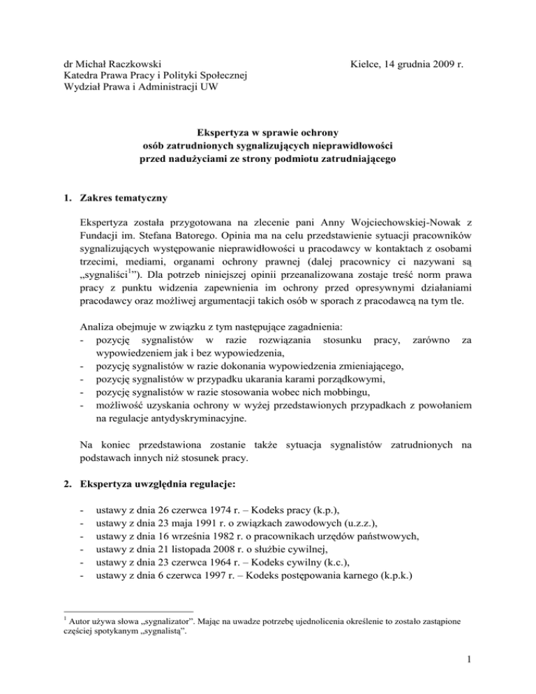 dr Michał Raczkowski Katedra Prawa Pracy i Polityki Społecznej Wydział Prawa i Administracji UW Kielce, 14 grudnia 2009 r. Ekspertyza w sprawie ochrony osób zatrudnionych sygnalizujących nieprawidłowości przed nadużyciami ze strony podmiotu zatrudniającego 1. Zakres tematyczny Ekspertyza została przygotowana na zlecenie pani Anny Wojciechowskiej-Nowak z Fundacji im. Stefana Batorego. Opinia ma na celu przedstawienie sytuacji pracowników sygnalizujących występowanie nieprawidłowości u pracodawcy w kontaktach z osobami trzecimi, mediami, organami ochrony prawnej (dalej pracownicy ci nazywani są „sygnaliści1”). Dla potrzeb niniejszej opinii przeanalizowana zostaje treść norm prawa pracy z punktu widzenia zapewnienia im ochrony przed opresywnymi działaniami pracodawcy oraz możliwej argumentacji takich osób w sporach z pracodawcą na tym tle. Analiza obejmuje w związku z tym następujące zagadnienia: - pozycję sygnalistów w razie rozwiązania stosunku pracy, zarówno za wypowiedzeniem jak i bez wypowiedzenia, - pozycję sygnalistów w razie dokonania wypowiedzenia zmieniającego, - pozycję sygnalistów w przypadku ukarania karami porządkowymi, - pozycję sygnalistów w razie stosowania wobec nich mobbingu, - możliwość uzyskania ochrony w wyżej przedstawionych przypadkach z powołaniem na regulacje antydyskryminacyjne. Na koniec przedstawiona zostanie także sytuacja sygnalistów zatrudnionych na podstawach innych niż stosunek pracy. 2. Ekspertyza uwzględnia regulacje: - ustawy z dnia 26 czerwca 1974 r. – Kodeks pracy (k.p.), ustawy z dnia 23 maja 1991 r. o związkach zawodowych (u.z.z.), ustawy z dnia 16 września 1982 r. o pracownikach urzędów państwowych, ustawy z dnia 21 listopada 2008 r. o służbie cywilnej, ustawy z dnia 23 czerwca 1964 r. – Kodeks cywilny (k.c.), ustawy z dnia 6 czerwca 1997 r. – Kodeks postępowania karnego (k.p.k.) 1 Autor używa słowa „sygnalizator”. Mając na uwadze potrzebę ujednolicenia określenie to zostało zastąpione częściej spotykanym „sygnalistą”. 1 oraz wypowiedzi nauki prawa i orzecznictwa dotyczących tych aktów. W zakresie orzecznictwa nie powołuję miejsc publikacji wyroków z uwagi na ich powszechną dostępność w elektronicznych programach prawniczych. Jedynie w przypadkach, w których wyrok nie był publikowany, zaznaczam tę okoliczność. 3. Zawiadomienie o nieprawidłowościach jako obowiązek pracowniczy Przepisy prawa pracy bezpośrednio nie regulują problemu sygnalizowania przez pracownika występujących nieprawidłowości jako obowiązku lub uprawnienia pracownika. Istniejące normy ogólne pozwalają jednak przyjąć, że zawiadamianie o nieprawidłowościach stanowi obowiązek pracownika. Zgodnie z art. 100 § 2 pkt 4 k.p. pracownik ma obowiązek dbać o dobro pracodawcy, chronić jego mienie i zachować w tajemnicy informacje, które mogłyby narazić pracodawcę na szkodę. Warto zwrócić uwagę, że obowiązek ten dotyczy dbania o dobro pracodawcy a nie osób zarządzających zakładem pracy w rozumieniu art. 31 k.p. Innymi słowy chodzi o dobro podmiotu zatrudniającego (np. urzędu, spółki) a nie osób, które nim zarządzają (dyrektora, prezesa, członka zarządu itp.). Obowiązek wynikający z art. 100 § 2 pkt 4 k.p. obejmuje z drugiej strony zachowanie w tajemnicy informacji, które mogłyby narazić pracodawcę na szkodę. Wyznacza to drugi aspekt sygnalizacji, stanowiąc ograniczenia podmiotowe i przedmiotowe sygnalizacji. Przede wszystkim pracownik nie może dowolnie wybierać kręgu osób, które zawiadamia o nieprawidłowościach, a powinien to czynić jedynie pod adresem organów ochrony prawnej (policja, prokuratura, organy kontroli – NIK, kontrola skarbowa) ewentualnie instytucji działających w interesie publicznym (media). Powinien także zachować właściwą formę sygnalizacji, adekwatną do jego stanu wiedzy (podejrzenie wadliwości nie powinno przybierać formy zawiadomienia o pewnym naruszeniu) oraz we właściwym ujęciu językowym (unikanie sformułowań zbyt dosadnych lub krzywdzących, inwektyw itp.). Z pewnością także nie może pracownik informować o nieistniejących naruszeniach, takie działanie stanowiłoby nie tyle realizację obowiązku dbałości o dobro pracodawcy, ile wręcz jego naruszenie. Bez wątpienia jednak informowanie przez pracownika o nieprawidłowościach może ściągnąć na niego niechęć współpracowników lub przełożonych, dążących do uniknięcia odpowiedzialności. W takiej sytuacji dość oczywiste, choć nieusprawiedliwione, może być dążenie do pozbycia się niewygodnego pracownika przez rozwiązanie z nim stosunku pracy. 4. Rozwiązanie stosunku pracy z sygnalistą Prawo pracy przewiduje liczne sposoby rozwiązania stosunku pracy, poczynając od formy dwustronnej – porozumienia stron do wielu form, w których rozwiązanie to następuje na skutek jednostronnego oświadczenia woli. Pracodawca dysponuje możliwością rozwiązania stosunku pracy za wypowiedzeniem oraz bez wypowiedzenia (natychmiastowo) – z winy pracownika (art. 52 k.p.) i bez jego winy (art. 53 k.p.). Spośród tych form w kontekście niniejszej analizy wykluczyć należy rozważania na temat 2 rozwiązania stosunku pracy bez wypowiedzenia bez winy pracownika (art. 53 k.p.). Przesłanki dokonania tej czynności (generalnie mówiąc długotrwała, usprawiedliwiona nieobecność pracownika w pracy, np. z powodu choroby) nie pozostają w związku z faktem sygnalizacji. Na drugim miejscu wymienić należy te czynności rozwiązujące, które dla swej skuteczności nie wymagają istnienia określonej przyczyny. Należą do nich porozumienie rozwiązujące oraz wypowiedzenie w przypadku gdy stosunek pracy wynika z W przypadku wypowiedzenia umowy na umowy zawartej na czas określony. W tych czas określony fakt sygnalizacji nie ma co przypadkach fakt sygnalizacji nie ma więc do zasady znaczenia i nie może być co do zasady znaczenia