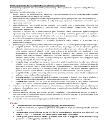 Informacje dotyczące dokonania prawidłowego zgłoszenia wierzytelności W niniejszym postępowaniu mają zastosowanie przepisy ustawy - Prawo upadłościowe i naprawcze według aktualnego stanu prawnego. Zgłoszenie wierzytelności powinno zawierać: 1. imiona i nazwiska lub pełną nazwę firmy wierzyciela (w przypadku spółek cywilnych imiona i nazwiska wszystkich wspólników spółki cywilnej będącej wierzycielem), 2. miejsce zamieszkania (w przypadku osób fizycznych i wspólników spółek cywilnych) lub adres siedziby wierzyciela, 3. udokumentowanie stosownymi dokumentami, iż osoby podpisujące zgłoszenie wierzytelności upoważnione są do reprezentacji wierzyciela, 4. zindywidualizowanie wierzytelności poprzez wskazanie wierzytelności wraz z należnościami ubocznymi (np. odsetkami oraz kosztami postępowania rozpoznawczego, zabezpieczającego, egzekucyjnego) oraz wartości wierzytelności niepieniężnej, 5. załączenie w oryginale lub w uwierzytelnionym przez notariusza odpisie dokumentów usprawiedliwiających zgłoszenie, przy czym uwierzytelnionym odpisem nie jest kserokopia dokumentu poświadczona za zgodność z oryginałem przez radcę prawnego lub adwokata chyba , że jest on pełnomocnikiem wierzyciela na podstawie prawidłowo udzielonego mu pełnomocnictwa dołączonego do zgłoszenia, 6. wymienienie dowodów wierzytelności (w przypadku dokumentów należy załączyć je w oryginale lub w uwierzytelnionym odpisie), 7. podanie kategorii, do której wierzytelność ma być zaliczona zgodnie z art. 342 Prawa upadłościowego i naprawczego a) kategoria pierwsza - koszty postępowania upadłościowego, przypadające za czas po ogłoszeniu upadłości należności alimentacyjne oraz renty za wywołanie choroby, niezdolności do pracy, kalectwa lub śmierci oraz z tytułu zamiany uprawnień objętych treścią prawa dożywocia na dożywotnią rentę, należności z tytułu bezpodstawnego wzbogacenia masy upadłości, należności z zawartych przez upadłego przed ogłoszeniem upadłości umów, których wykonania zażądał syndyk, należności powstałe z czynności syndyka albo zarządcy oraz należności, które powstały z czynności upadłego dokonanych po ogłoszeniu upadłości, niewymagających zgody nadzorcy sadowego lub dokonanych za jego zgoda; b) kategoria druga - przypadające za czas przed ogłoszeniem upadłości należności ze stosunku pracy, należności rolników z tytułu umów o dostarczenie produktów z własnego gospodarstwa rolnego, należności alimentacyjne oraz renty za wywołanie choroby, niezdolności do pracy, kalectwa lub śmierci i renty z tytułu zamiany uprawnień objętych treścią prawa dożywocia na dożywotnią rentę, przypadające za dwa ostatnie lata przed ogłoszeniem upadłości należności z tytułu składek na ubezpieczenia społeczne, wraz z odsetkami i kosztami egzekucji; c) kategoria trzecia - podatki i inne daniny publiczne oraz pozostałe należności z tytułu składek na ubezpieczenia społeczne, wraz z odsetkami i kosztami egzekucji; d) kategoria czwarta - inne należności, jeżeli nie podlegają zaspokojeniu w kategorii piątej, wraz z odsetkami za ostatni rok przed data ogłoszenia upadłości, z odszkodowaniem umownym, kosztami procesu i egzekucji; e) kategoria piąta - odsetki, które nie nalezą do wyższych kategorii w kolejności, w jakiej podlega zaspokojeniu kapitał, a także sadowe i administracyjne kary grzywny oraz należności z tytułu darowizn i zapisów. 8. wskazanie, czy istnieje zabezpieczenie związane z wierzytelnością, a jeżeli tak to należy wymienić zabezpieczenia związane z wierzytelnością wraz z ewentualną informacją o ograniczeniu odpowiedzialności upadłego dłużnika do określonej wartości, 9. dokonanie na piśmie zgłoszenia wierzytelności w dwóch egzemplarzach ( oba stanowiących oryginały zgłoszenia ) i załączenie oprócz w/w dokumentów uzasadniających zgłoszenie stanowiących załączniki w wyżej określonej formie ich odpisów ( w formie kserokopii ), 10. w przypadku wierzyciela zamieszkałego za granicą podanie adresu dla doręczeń w Polsce. UWAGA: Zgłoszeniu podlegają wierzytelności powstałe przed datą ogłoszenia upadłości. W interesie wierzyciela jest wykazanie zgłoszonych wierzytelności, w tym prawidłowego sposobu naliczenia odsetek. Jeżeli upadłość została ogłoszona w dniu 20.11.2015 r. to odsetki należy naliczyć od dnia 19.11.2015 r. do dnia 20.11.2014 r. – kategoria 4 oraz odsetki do dnia 19.11.2014 r. – kategoria 5. Należy podać sposób naliczenia odsetek, tj. wskazać salda, daty, w przypadku odsetek umownych stopy procentowe i podstawę prawną ich naliczenia.