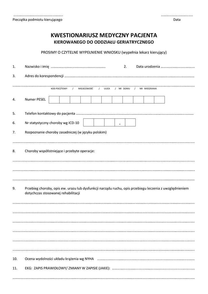 ……………………………..………………… Pieczątka podmiotu kierującego ……………….…………….. Data KWESTIONARIUSZ MEDYCZNY PACJENTA KIEROWANEGO DO ODDZIAŁU GERIATRYCZNEGO PROSIMY O CZYTELNE WYPEŁNIENIE WNIOSKU (wypełnia lekarz kierujący) 1. Nazwisko i imię …………………………………………………….. 2. Data urodzenia ……….…………………….... 3. Adres do korespondencji ………………………………………………………………………………………………………………………………… ………………………………………………………………………………………..…………………………………………………………………………………………… KOD POCZTOWY / MIEJSCOWOŚĆ / ULICA / NR DOMU / NR MIESZKANIA 4. Numer PESEL 5. Telefon kontaktowy do pacjenta ……………………………………………………………………………………………………………………. 6. Nr statystyczny choroby wg ICD-10 7. Rozpoznanie choroby zasadniczej (w języku polskim) . …………………………………………………………………………………………………………………………………………………………………………………….. 8. Choroby współistniejące i przebyte operacje: …………..………………………………………………………………………………………………………………………………………………………………………… …………..………………………………………………………………………………………………………………………………………………………………………... …………..………………………………………………………………………………………………………………………………………………………………………… 9. Przebieg choroby, opis ew. urazu lub dysfunkcji narządu ruchu, opis przebiegu leczenia z uwzględnieniem dotychczas stosowanej rehabilitacji ………………………………………………………….........…………………………………………………………………………………………………………………. …………………………………………………………………………………………………………………………………………………………………………………….. …………………………………………………………………………………………………………………………………………………………………………………….. …………………………………………………………………………………………………………………………………………………………………………………….. …………………………………………………………………………………………………………………………………………………………………………………….. …………………………………………………………………………………………………………………………………………………………………………………….. 10. Ocena wydolności układu krążenia wg NYHA ………………………………………………..……………………………………………… 11. EKG: ZAPIS PRAWIDŁOWY/ ZMIANY W ZAPISIE (JAKIE): …………………………….…………………................................... …………………………………………………………………………………………………………………………………………………………………………………….. 12. Ciśnienie tętnicze: / 12. Cukrzyca: TAK / NIE 13. Ocena stanu psychicznego: a) czy pacjent rozumie i wykonuje polecenia : TAK / NIE b) czy pobiera aktualnie leki uspokajające, przeciwdepresyjne: TAK / NIE c) jakie ………………………………………………………………………..………….…….……………………………………………………………………. 14. Rurka tracheotomijna: TAK / NIE ……………………………………………………………………………………………………………….. 15. Cewnik moczowy: TAK / NIE …………………………………………………………………………………………………………..………….. 16. Odleżyny: NIE / TAK ……………………….. – umiejscowienie (opis)……………………………………………….…………………... …………………………………………….……………………………………………………………………………………………………………………………………… 17. Ocena samodzielności w czynnościach życia codziennego: a) samodzielne mycie się: c) samodzielne jedzenie: e) nietrzymanie stolca: g) samodzielne chodzenie: TAK TAK TAK TAK / / / / NIE NIE NIE NIE b) samodzielne ubieranie się: d) nietrzymanie moczu: f) samodzielne siadanie w łóżku: h) zaopatrzenie ortopedyczne: TAK TAK TAK TAK / / / / NIE NIE NIE NIE jakie? …………………………………………………………………………………………………………………………………………………………………………… 18. Ocena natężenia bólu w skali od 1 do 10: ………………………………….…………………………………………………………………. 19. Czy pacjent wymaga całodobowej opieki: TAK / NIE 20. Sugerowany tryb przyjęcia: STABILNY / PILNY 21. Aktualnie stosowane leki, uczulenia: ………………………………………………………………………………………………
