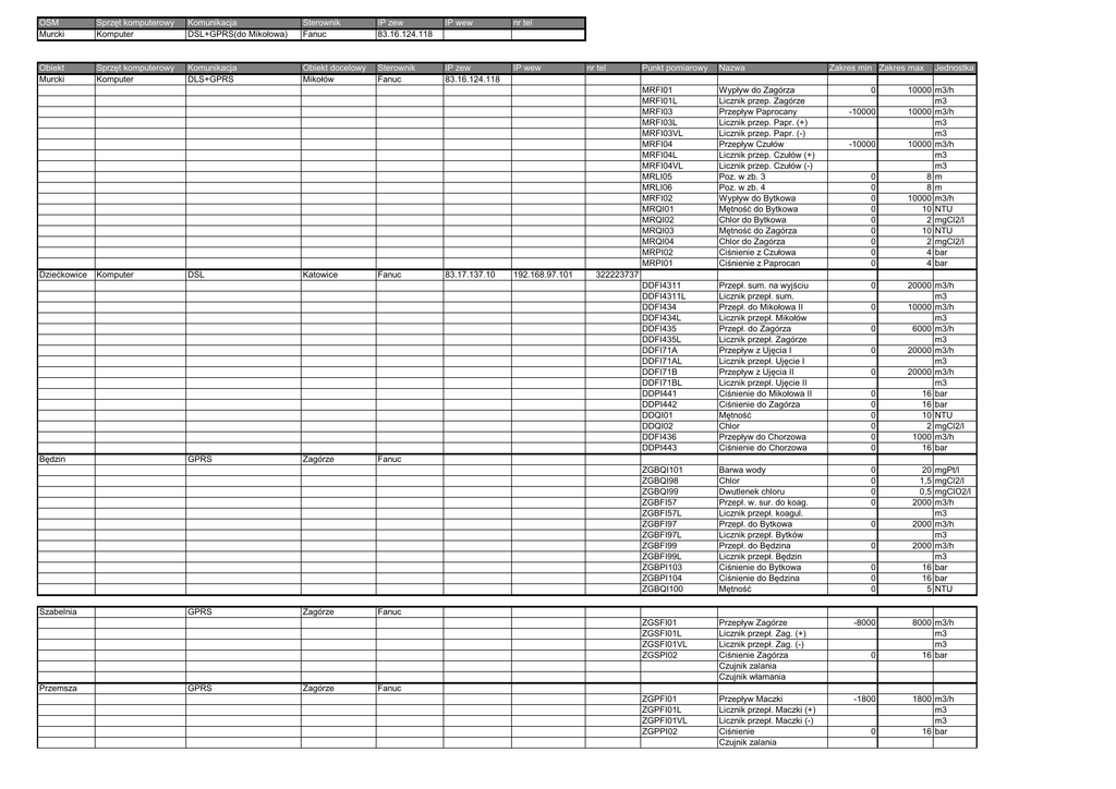 OSM Murcki Sprzęt komputerowy Komputer Komunikacja DSL+GPRS(do Mikołowa) Sterownik Fanuc IP zew 83.16.124.118 IP wew nr tel Obiekt Murcki Sprzęt komputerowy Komputer Komunikacja DLS+GPRS Obiekt docelowy Mikołów Sterownik Fanuc IP zew 83.16.124.118 IP wew Dziećkowice Będzin Szabelnia Przemsza Komputer DSL GPRS GPRS GPRS Katowice Zagórze Zagórze Zagórze Fanuc 83.17.137.10 192.168.97.101 nr tel Punkt pomiarowy Nazwa Zakres min Zakres max MRFI01 MRFI01L MRFI03 MRFI03L MRFI03VL MRFI04 MRFI04L MRFI04VL MRLI05 MRLI06 MRFI02 MRQI01 MRQI02 MRQI03 MRQI04 MRPI02 MRPI01 Wypływ do Zagórza Licznik przep. Zagórze Przepływ Paprocany Licznik przep. Papr. (+) Licznik przep. Papr. (-) Przepływ Czułów Licznik przep. Czułów (+) Licznik przep. Czułów (-) Poz. w zb. 3 Poz. w zb. 4 Wypływ do Bytkowa Mętność do Bytkowa Chlor do Bytkowa Mętność do Zagórza Chlor do Zagórza Ciśnienie z Czułowa Ciśnienie z Paprocan DDFI4311 DDFI4311L DDFI434 DDFI434L DDFI435 DDFI435L DDFI71A DDFI71AL DDFI71B DDFI71BL DDPI441 DDPI442 DDQI01 DDQI02 DDFI436 DDPI443 Przepł. sum. na wyjściu Licznik przepł. sum. Przepł. do Mikołowa II Licznik przepł. Mikołów Przepł. do Zagórza Licznik przepł. Zagórze Przepływ z Ujęcia I Licznik przepł. Ujęcie I Przepływ z Ujęcia II Licznik przepł. Ujęcie II Ciśnienie do Mikołowa II Ciśnienie do Zagórza Mętność Chlor Przepływ do Chorzowa Ciśnienie do Chorzowa ZGBQI101 ZGBQI98 ZGBQI99 ZGBFI57 ZGBFI57L ZGBFI97 ZGBFI97L ZGBFI99 ZGBFI99L ZGBPI103 ZGBPI104 ZGBQI100 Barwa wody Chlor Dwutlenek chloru Przepł. w. sur. do koag. Licznik przepł. koagul. Przepł. do Bytkowa Licznik przepł. Bytków Przepł. do Będzina Licznik przepł. Będzin Ciśnienie do Bytkowa Ciśnienie do Będzina Mętność ZGSFI01 ZGSFI01L ZGSFI01VL ZGSPI02 Przepływ Zagórze Licznik przepł. Zag. (+) Licznik przepł. Zag. (-) Ciśnienie Zagórza Czujnik zalania Czujnik włamania -8000 ZGPFI01 ZGPFI01L ZGPFI01VL ZGPPI02 Przepływ Maczki Licznik przepł. Maczki (+) Licznik przepł. Maczki (-) Ciśnienie Czujnik zalania -1800 0 -10000 -10000 0 0 0 0 0 0 0 0 0 Jednostka 10000 m3/h m3 10000 m3/h m3 m3 10000 m3/h m3 m3 8m 8m 10000 m3/h 10 NTU 2 mgCl2/l 10 NTU 2 mgCl2/l 4 bar 4 bar 322223737 0 0 0 0 0 0 0 0 0 0 0 20000 m3/h m3 10000 m3/h m3 6000 m3/h m3 20000 m3/h m3 20000 m3/h m3 16 bar 16 bar 10 NTU 2 mgCl2/l 1000 m3/h 16 bar Fanuc 0 0 0 0 20 1,5 0,5 2000 0 2000 0 2000 0 0 0 16 16 5 mgPt/l mgCl2/l mgClO2/l m3/h m3 m3/h m3 m3/h m3 bar bar NTU Fanuc 0 8000 m3/h m3 m3 16 bar Fanuc 0 1800 m3/h m3 m3 16 bar Czujnik włamania