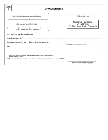 WK UPOWAśNIENIE 1 ................................................................................................... Imię i nazwisko lub nazwa upowaŜniającego Miejscowość i data Adres zamieszkania lub siedziba Starostwo Powiatowe w Radomsku Wydział Komunikacji i Transportu PESEL lub REGON*/data urodzenia* UpowaŜnia się Pana (Panią) zamieszkałego(ą) legitymującego(ą) się dokumentem toŜsamości (rodzaj dokumentu, seria i numer) do: *Numer REGON podaje się, gdy upowaŜniającym jest przedsiębiorca zamieszczony w KRS. ** Datę urodzenia wpisują tylko cudzoziemcy, którzy nie mają ustalonego numeru PESEL. Czytelny podpis upowaŜniającego ADNOTACJE URZĘDOWE UpowaŜnienie przyjęto w dniu ............................................. Ilość dokumentów załączonych do upowaŜnienia – ............... szt. Podpis i pieczątka pracownika urzędu