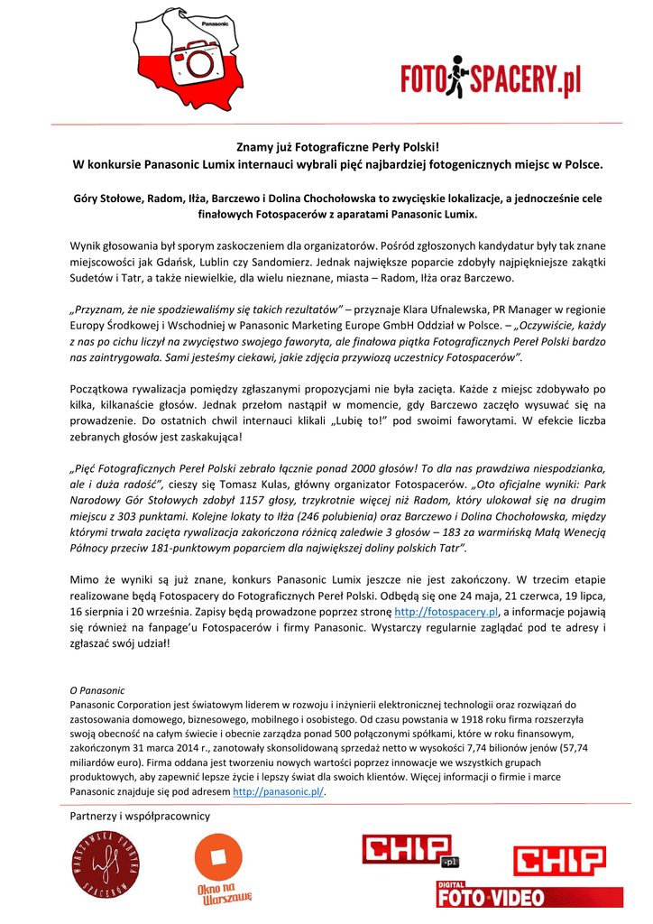 Znamy już Fotograficzne Perły Polski! W konkursie Panasonic Lumix internauci wybrali pięć najbardziej fotogenicznych miejsc w Polsce. Góry Stołowe, Radom, Iłża, Barczewo i Dolina Chochołowska to zwycięskie lokalizacje, a jednocześnie cele finałowych Fotospacerów z aparatami Panasonic Lumix. Wynik głosowania był sporym zaskoczeniem dla organizatorów. Pośród zgłoszonych kandydatur były tak znane miejscowości jak Gdańsk, Lublin czy Sandomierz. Jednak największe poparcie zdobyły najpiękniejsze zakątki Sudetów i Tatr, a także niewielkie, dla wielu nieznane, miasta – Radom, Iłża oraz Barczewo. „Przyznam, że nie spodziewaliśmy się takich rezultatów” – przyznaje Klara Ufnalewska, PR Manager w regionie Europy Środkowej i Wschodniej w Panasonic Marketing Europe GmbH Oddział w Polsce. – „Oczywiście, każdy z nas po cichu liczył na zwycięstwo swojego faworyta, ale finałowa piątka Fotograficznych Pereł Polski bardzo nas zaintrygowała. Sami jesteśmy ciekawi, jakie zdjęcia przywiozą uczestnicy Fotospacerów”. Początkowa rywalizacja pomiędzy zgłaszanymi propozycjami nie była zacięta. Każde z miejsc zdobywało po kilka, kilkanaście głosów. Jednak przełom nastąpił w momencie, gdy Barczewo zaczęło wysuwać się na prowadzenie. Do ostatnich chwil internauci klikali „Lubię to!” pod swoimi faworytami. W efekcie liczba zebranych głosów jest zaskakująca! „Pięć Fotograficznych Pereł Polski zebrało łącznie ponad 2000 głosów! To dla nas prawdziwa niespodzianka, ale i duża radość”, cieszy się Tomasz Kulas, główny organizator Fotospacerów. „Oto oficjalne wyniki: Park Narodowy Gór Stołowych zdobył 1157 głosy, trzykrotnie więcej niż Radom, który ulokował się na drugim miejscu z 303 punktami. Kolejne lokaty to Iłża (246 polubienia) oraz Barczewo i Dolina Chochołowska, między którymi trwała zacięta rywalizacja zakończona różnicą zaledwie 3 głosów – 183 za warmińską Małą Wenecją Północy przeciw 181‐punktowym poparciem dla największej doliny polskich Tatr”. Mimo że wyniki są już znane, konkurs Panasonic Lumix jeszcze nie jest zakończony. W trzecim etapie realizowane będą Fotospacery do Fotograficznych Pereł Polski. Odbędą się one 24 maja, 21 czerwca, 19 lipca, 16 sierpnia i 20 września. Zapisy będą prowadzone poprzez stronę http://fotospacery.pl, a informacje pojawią się również na fanpage’u Fotospacerów i firmy Panasonic. Wystarczy regularnie zaglądać pod te adresy i zgłaszać swój udział! O Panasonic Panasonic Corporation jest światowym liderem w rozwoju i inżynierii elektronicznej technologii oraz rozwiązań do zastosowania domowego, biznesowego, mobilnego i osobistego. Od czasu powstania w 1918 roku firma rozszerzyła swoją obecność na całym świecie i obecnie zarządza ponad 500 połączonymi spółkami, które w roku finansowym, zakończonym 31 marca 2014 r., zanotowały skonsolidowaną sprzedaż netto w wysokości 7,74 bilionów jenów (57,74 miliardów euro). Firma oddana jest tworzeniu nowych wartości poprzez innowacje we wszystkich grupach produktowych, aby zapewnić lepsze życie i lepszy świat dla swoich klientów. Więcej informacji o firmie i marce Panasonic znajduje się pod adresem http://panasonic.pl/. Partnerzy i współpracownicy Panasonic Polska – znajdź nas online! http://www.facebook.com/panasonicpolska http://www.youtube.com/PanasonicPolska http://www.panasonic.pl http://www.lumixgexperience.pl/ O Fotospacery.pl Fotospacery.pl to wspólne dzieło grupy zapaleńców – miłośników zwiedzania i pasjonatów fotografii. W ramach Fotospacerów i innych kreowanych wydarzeń przekazują oni zarówno wiedzę o oglądanych miejscach i zabytkach, jak i uczą konkretnych technik fotograficznych. Przede wszystkim jednak dzielą się pasją do fotografowania i spacerowania z aparatem w dłoniach! Kontakt do firmy Panasonic: Klara Ufnalewska Panasonic Marketing Europe GmbH Email: [email protected] Milena Świątek Hill + Knowlton Strategies Email: [email protected] Kontakt do Fotospacery.pl Karina Sękowska e‐mail: [email protected] tel: 531 500 705 Joanna Manarczyk Hill + Knowlton Strategies Email: [email protected] Tomasz Kulas e‐mail: [email protected] Partnerzy i współpracownicy