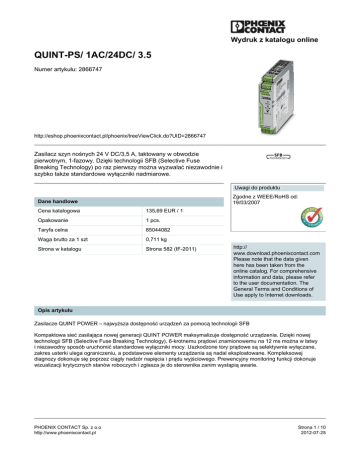 Wydruk z katalogu online QUINT-PS/ 1AC/24DC/ 3.5 Numer artykułu: 2866747 http://eshop.phoenixcontact.pl/phoenix/treeViewClick.do?UID=2866747 Zasilacz szyn nośnych 24 V DC/3,5 A, taktowany w obwodzie pierwotnym, 1-fazowy. Dzięki technologii SFB (Selective Fuse Breaking Technology) po raz pierwszy można wyzwalać niezawodnie i szybko także standardowe wyłączniki nadmiarowe. Uwagi do produktu Zgodne z WEEE/RoHS od: 19/03/2007 Dane handlowe Cena katalogowa 135,69 EUR / 1 Opakowanie 1 pcs. Taryfa celna 85044082 Waga brutto za 1 szt 0,711 kg Strona w katalogu Strona 582 (IF-2011) http:// www.download.phoenixcontact.com Please note that the data given here has been taken from the online catalog. For comprehensive information and data, please refer to the user documentation. The General Terms and Conditions of Use apply to Internet downloads. Opis artykułu Zasilacze QUINT POWER – najwyższa dostępność urządzeń za pomocą technologii SFB Kompaktowa sieć zasilająca nowej generacji QUINT POWER maksymalizuje dostępność urządzenia. Dzięki nowej technologii SFB (Selective Fuse Breaking Technology), 6-krotnemu prądowi znamionowemu na 12 ms można w łatwy i niezawodny sposób uruchomić standardowe wyłączniki mocy. Uszkodzone tory prądowe są selektywnie wyłączane, zakres usterki ulega ograniczeniu, a podstawowe elementy urządzenia są nadal eksploatowane. Kompleksowej diagnozy dokonuje się poprzez ciągły nadzór napięcia i prądu wyjściowego. Prewencyjny monitoring funkcji dokonuje wizualizacji krytycznych stanów roboczych i zgłasza je do sterownika zanim wystąpią awarie. PHOENIX CONTACT Sp. z o.o http://www.phoenixcontact.pl Strona 1 / 10 2012-07-25 QUINT-PS/ 1AC/24DC/ 3.5 Numer artykułu: 2866747 http://eshop.phoenixcontact.pl/phoenix/treeViewClick.do?UID=2866747 Dane techniczne Dane wejściowe znamionowe napięcie wejścia 100 V AC ... 240 V AC zakres napięcia wejściowego AC 85 V AC ... 264 V AC zakres napięcia wejściowego DC 90 V DC ... 350 V DC krótkotrwałe napięcie wejściowe 300 V AC Zakres częstotliwości AC 45 Hz ... 65 Hz Zakres częstotliwości DC 0 Hz Pobór prądu ok. 1,4 A (120 V AC) ok. 0,8 A (230 V AC) udar przy załączaniu < 20 A (standard) Czas podtrz. przy zaniku zasil. sieciowego > 20 ms (120 V AC) > 80 ms (230 V AC) bezpiecznik na wejściu 5 A (zwłoczny, wewnętrzny) Dopuszczalne zabezpieczenie wstępne B6 B10 B16 Tekst dodatkowy AC: 1 x przełącznik LS - zalecane zabezpieczenie wstępne zabezpieczenie Ochrona przed przepięciami przejściowymi układ ochronny / element konstrukcyjny Warystor Dane wyjściowe napięcie wyjścia znamionowe 24 V DC ±1 % zakres nastaw napięcia wyjściowego 18 V DC ... 29,5 V DC (> 24 V moc stała) prąd wyjścia 3,5 A (-25 °C ... 60 °C, UOUT = 24 V DC) 4 A (z POWER BOOST, -25°C ... 40 °C stałe, UOUT = 24 V DC) 15 A (z technologią SFB, 12 ms) 4 A (UIn ≥ 100 V AC) Redukcja 60 °C ... 70 °C (2,5 %/K) możliwość łączenia równoległego tak, w celu redundancji i zwiększenia mocy możliwość łączenia szeregowego Tak Uchyby regulacji < 1 % (Statyczna zmiana obciążania 10 % ... 90 %) < 2 % (Dynamiczna zmiana obciążania 10 % ... 90 %) < 0,1 % (Zmiana napięcia wejściowego ±10 %) tętnienie resztkowe PHOENIX CONTACT Sp. z o.o http://www.phoenixcontact.pl SS (przy wartościach znamionowych) Strona 2 / 10 2012-07-25 QUINT-PS/ 1AC/24DC/ 3.5 Numer artykułu: 2866747 http://eshop.phoenixcontact.pl/phoenix/treeViewClick.do?UID=2866747 Maksymalna moc strat, bieg jałowy 3,5 W Maksymalna moc strat, obciążenie znamionowe 11 W Dane ogólne Szerokość 32 mm wysokość 130 mm Głębokość 125 mm Szerokość przy montażu alternatywnym 122 mm Wysokość przy montażu alternatywnym 130 mm Głębokość przy montażu alternatywnym 35 mm waga netto 0,5 kg wskaźnik napięcia roboczego Dioda LED zielona sprawność > 88 % (przy 230 V AC i wartościach znamionowych) napięcie izolacji wejście / wyjście 4 kV AC (Próba typu) 2 kV AC (Próba wyrobu) Stopień ochrony IP20 Klasa ochrony I MTBF (IEC 61709, SN 29500) > 500000 h (wg IEC 61709) Temperatura otoczenia (praca) -25 °C ... 70 °C (> 60 °C, zmniejszenie obciążalności) temperatura otoczenia (składowanie/transport) -40 °C ... 85 °C maks. dop. wilgotność powietrza (praca) ≤ 95 % (przy 25 °C, bez obroszenia) Pozycja zabudowy szyna montażowa pozioma NS 35, EN 60715 Informacja montażowa ustawiane w rzędzie: poziomo 5 mm, obok aktywnych części 15 mm, pionowo 5 cm kompatybilność elektromagnetyczna Zgodność z Dyrektywą EMC 2004/108/EWG Odporność na zakłócenia EN 61000-6-2:2005 Dyrektywa dot. urządzeń niskiego nap. Zgodność z dyrektywą dot. urz. niskiego nap. 2006/95/WE normatywny osprzęt elektryczny maszyn EN 60204 normatywne bezpieczeństwo transformatorów IEC 61558-2-17 normatywne bezpieczeństwo elektryczne IEC 60950-1/VDE 0805 (SELV) certyfikacja stoczniowa Germanischer Lloyd (EMC 2), ABS, LR, RINA, NK, BV Normatywne wyposażenie urządzeń elektronicznych w elektroniczne środki techniczne EN 50178/VDE 0160 (PELV) normatywne niskie napięcie ochronne IEC 60950-1 (SELV) i EN 60204 (PELV) normatywna pewna separacja DIN VDE 0100-410 DIN VDE 0106-1010 normatywna ochrona przez porażeniem prądem PHOENIX CONTACT Sp. z o.o http://www.phoenixcontact.pl DIN 57100-410 Strona 3 / 10 2012-07-25 QUINT-PS/ 1AC/24DC/ 3.5 Numer artykułu: 2866747 http://eshop.phoenixcontact.pl/phoenix/treeViewClick.do?UID=2866747 normatywna ochrona przed prądem niebezpiecznym dla zdrowia, wymagania podstawowe w zakresie bezpiecznej separacji w elektrycznych środkach technicznych DIN VDE 0106-101 normatywne ograniczenie wyższych harmonicznych prądu sieci EN 61000-3-2 normatywne bezpieczeństwo urządzeń GS (sprawdzone bezpieczeństwo) Norma - dopuszczenie do stos. w medycynie IEC 60601 Dopuszczenie - wymogi przemysłu półprzewodnikowego w odniesieniu do spadków napięcia zasilania. SEMI F47-0706 Compliance Certificate certyfikat schemat CB ś