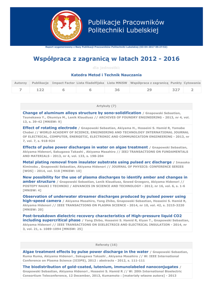 Raport wygenerowany z Bazy Publikacji Pracowników Politechniki Lubelskiej (03-04-2017 05:27:52) Współpraca z zagranicą w latach 2012 - 2016 dla jednostki: Katedra Metod i Technik Nauczania Autorzy Publikacje 7 122 Impact Factor Lista filadelfijska 6 6 Lista MNiSW Współpraca z zagranicą Punkty Cytowania 36 29 327 Artykuły (7) Change of aluminum alloys structure by sono-solidification / Gnapowski Sebastian, Tsunekawa Y., Okumiya M., Lenik Klaudiusz // ARCHIVES OF FOUNDRY ENGINEERING - 2013, nr 4, vol. 13, s. 39-42 [MNiSW: 9] Effect of rotating electrode / Gnapowski Sebastian, Akiyama H., Hosseini S. Hamid R, Yamabe Chobei // WORLD ACADEMY OF SCIENCE, ENGINEERING AND TECHNOLOGY INTERNATIONAL JOURNAL OF ELECTRICAL, COMPUTER, ENERGETIC, ELECTRONIC AND COMMUNICATION ENGINEERING - 2013, nr 7, vol. 7, s. 918-924 Effects of pulse power discharges in water on algae treatment / Gnapowski Sebastian, Akiyama Hidenori, Sakugawa Takashi , Akiyama Masahiro // IEEJ TRANSACTIONS ON FUNDAMENTALS AND MATERIALS - 2013, nr 4, vol. 133, s. 198-204 Metal plating removal from insulator substrate using pulsed arc discharge / Imasaka Kiminobu , Gnapowski Sebastian, Akiyama Hidenori // JOURNAL OF PHYSICS: CONFERENCE SERIES [WOS] - 2014, vol. 518 [MNiSW: 10] New possibility for the use of plasma discharges to identify amber and changes in amber structure / Gnapowski Sebastian, Lenik Klaudiusz, Szwed Grzegorz, Akiyama Hidenori // POSTEPY NAUKI I TECHNIKI / ADVANCES IN SCIENCE AND TECHNOLOGY - 2012, nr 16, vol. 6, s. 1-6 [MNiSW: 4] Observation of underwater streamer discharges produced by pulsed power using high-speed camera / Akiyama Masahiro, Yang Zhibo, Gnapowski Sebastian, Hosseini S. Hamid R, Akiyama Hidenori // IEEE TRANSACTIONS ON PLASMA SCIENCE - 2014, nr 10, vol. 42, s. 3215-3220 [MNiSW: 20] Post-breakdown dielectric recovery characteristics of High-pressure liquid CO2 including supercritical phase / Yang Zhibo, Hosseini S. Hamid R, Kiyan T., Gnapowski Sebastian, Akiyama Hidenori // IEEE TRANSACTIONS ON DIELECTRICS AND ELECTRICAL INSULATION - 2014, nr 3, vol. 21, s. 1089-1094 [MNiSW: 25] Referaty (16) Algae treatment effects by pulse power discharge in the water / Gnapowski Sebastian, Ruma Ruma, Akiyama Hidenori , Sakugawa Takashi , Akiyama Masahiro // W: IEEE International Conference on Plasma Science (ICOPS), 2012 : abstracts - 2012, s. 111-111 The biodistribution of gold-coated, lutenium, immunolabeled nanoconjugates / Gnapowski Sebastian, Akiyama Hidenori , Hosseini S. Hamid R // W: 20th International Bioelectric Consortium Teleconference, 12 December, 2013, Kumamoto : [materiały własne autora] - 2013 2 Change of amber structure by pulsed power discharge / Shigematsu Y., Gnapowski Sebastian, Akiyama H. // W: IEEE International Conference on Plasma Science (ICOPS), 2013 : abstracts - 2013, s. 1-1 Changing of amber structure by pulsed power discharge / Gnapowski Sebastian, Akiyama Hidenori , Shigematsu Yoshitaka // W: 9th International Bioelectrics Symposium : [program], september 5-8, 2012, Kumamoto - 2012 Delivery of drugs and genes using bioelectric approaches / Gnapowski Sebastian, Akiyama Hidenori , Hosseini S. Hamid R // W: 15th International Bioelectrics Consortium Teleconference, 2012 : [materiały własne autora] - 2012 Delivery of drugs and genes using bioelectric approaches / Gnapowski Sebastian, Akiyama Hidenori , Hosseini S. Hamid R // W: 16th International Bioelectrics Consortium Teleconference, 20th December, 2012, Kumamoto : [materiały własne autora] - 2012 Effect of rotating electrode / Gnapowski Sebastian, Akiyama Hidenori , Hosseini S. Hamid R, Yamabe Chobei // W: ICPPP 2013 : International Conference on Plasma Plasma Physics, 22-23 July, 2013, Oslo : [materiały własne autora] - 2013 Extraction of oil from microalgae which is expected as bio-fuel / Gnapowski Sebastian, Hagio Yuuki, Hori T., Yoshida D., Hosseini S. Hamid R, Akiyama Hidenori // W: 10th International Bioelectrics Symposium - BIOELECTRICS 2013, September 16-19, 2013, Karlsruhe - 2012 Extraction of oil from microalgae which is expected as bio-fuel / Gnapowski Sebastian, Hagio Yuuki, Hori T., Yoshida D., Hosseini S. Hamid R, Akiyama Hidenori // W: 66th Joint Conference of Electrical and Electroniccs Engineers in Kyushu, 24-25 September, 2013, Kumamoto : [materiały własne autora] - 2013 Latest developements / Akiyama Hidenori , Hosseini S. Hamid R // W: 21st International Bioelectrics Consortium Teleconference, 20 March, 2014, Kumamoto : [materiały własne autora] - 2014 Low temperature plasma production in water, supercritical fluid and air flow and its applications / Gnapowski Sebastian, Akiyama Hidenori, Inokuchi Makoto , Ishizawa Hidetoshi , Sakamoto Tatsuro , Furusato Tomohiro , Sakugawa Takashi , Katsuki Sunao , Akiyama Masahiro // W: IEEE International Conference on Plasma Science (ICOPS), 2012 : abstracts - 2012, s. 7-7 Metal plating removal from insulator substrate using pulsed arc discharge / Imasaka Kiminobu , Gnapowski Sebastian, Akiyama Hidenori // W: National Institute for Fusion Science Conference, 10-11 January, 2013, Nagoya : [materiały własne autora] - 2013 Modyfication amber structure by pulsed power plasma discharge / Gnapowski Sebastian, Akiyama Hidenori // W: Plasma Processing Science and Societal Grand Challenges, Gordon Research Conferences, 22-27 July, 2012, Smithfield : [materiały własne autora] - 2012 Modyfication amber structure by pulsed power plasma discharge / Gnapowski Sebastian, Shigematsu Yoshitaka , Akiyama Hidenori // W: Conference of Institute Electrical Engineering of Japan, 4-5 March, 2013, Nagoya : [materiały własne autora] - 2013 PPPS-2013: Increase in input power and change of streamer length during rotation of electrode / Gnapowski Sebastian, Akiyama Hidenori , Yamabe Chobei // W: IEEE International Conference on Plasma Science (ICOPS), 2013 : abstracts - 2013 Softening of vegetables by pulsed power / Akiyama Mariko, Gnapowski Sebastian, Shigematsu Yoshitaka , Aki