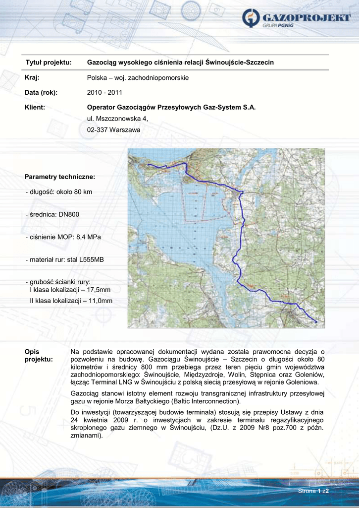 Tytuł projektu: Gazociąg wysokiego ciśnienia relacji Świnoujście-Szczecin Kraj: Polska – woj. zachodniopomorskie Data (rok): 2010 - 2011 Klient: Operator Gazociągów Przesyłowych Gaz-System S.A. ul. Mszczonowska 4, 02-337 Warszawa Parametry techniczne: - długość: około 80 km - średnica: DN800 - ciśnienie MOP: 8,4 MPa - materiał rur: stal L555MB - grubość ścianki rury: I klasa lokalizacji – 17,5mm II klasa lokalizacji – 11,0mm Opis projektu: Na podstawie opracowanej dokumentacji wydana została prawomocna decyzja o pozwoleniu na budowę. Gazociągu Świnoujście – Szczecin o długości około 80 kilometrów i średnicy 800 mm przebiega przez teren pięciu gmin województwa zachodniopomorskiego: Świnoujście, Międzyzdroje, Wolin, Stępnica oraz Goleniów, łącząc Terminal LNG w Świnoujściu z polską siecią przesyłową w rejonie Goleniowa. Gazociąg stanowi istotny element rozwoju transgranicznej infrastruktury przesyłowej gazu w rejonie Morza Bałtyckiego (Baltic Interconnection). Do inwestycji (towarzyszącej budowie terminala) stosują się przepisy Ustawy z dnia 24 kwietnia 2009 r. o inwestycjach w zakresie terminalu regazyfikacyjnego skroplonego gazu ziemnego w Świnoujściu, (Dz.U. z 2009 Nr8 poz.700 z późn. zmianami). Strona 1 z2 Świadczone usługi: Zakres prac projektowych obejmował: - uzyskanie decyzji o ustaleniu lokalizacji inwestycji w zakresie terminala regazyfikacyjnego skroplonego gazu ziemnego w Świnoujściu, - uzyskanie prawomocnej decyzji o pozwoleniu na budowę, - opracowanie dokumentacji wykonawczej wraz z częścią kosztorysową. Ochrona środowiska Zaprojektowano ułożenie gazociągu w wykopie na głębokości 1,2 m licząc od górnej płaszczyzny rury do poziomu gruntu. Przeszkody terenowe np. rzeki, drogi, linie kolejowe, zostaną pokonane przez wykorzystanie podczas budowy metod bezwykopowych np. przecisków oraz przewiertów sterowanych. Szerokość strefy kontrolowanej określono na 12 m (po 6 m na stronę od osi gazociągu). W większej części zaprojektowano ułożenie gazociągu wzdłuż gazociągów istniejących, mieszcząc się w ich strefie ochronnej. Wzdłuż gazociągu, na wydzielonym geodezyjnie i przejętym na majątek Skarbu Państwa terenie zaplanowano umieszczenie infrastruktury towarzyszącej: tj. zespoły zaporowoupustowe oraz stacje ochrony katodowej. Przed rozpoczęciem prac ziemnych wierzchnia warstwa gleby (humus) zostanie odłożona, a następnie wykorzystywana do rekultywacji terenu. Elementy wchodzące w skład budowanych obiektów będą poddane szczegółowym badaniom i próbom. Będą posiadały również wszelkie niezbędne certyfikaty i atesty. Zapewnione zostało spełnienie wymaganych przepisów i norm, dotyczących emisji zanieczyszczeń oraz hałasu. Na gazociągu zaplanowano montaż systemów automatyki oraz zabezpieczeń zgodny z wymogami przepisów polskich oraz unijnych. Strona 2 z2