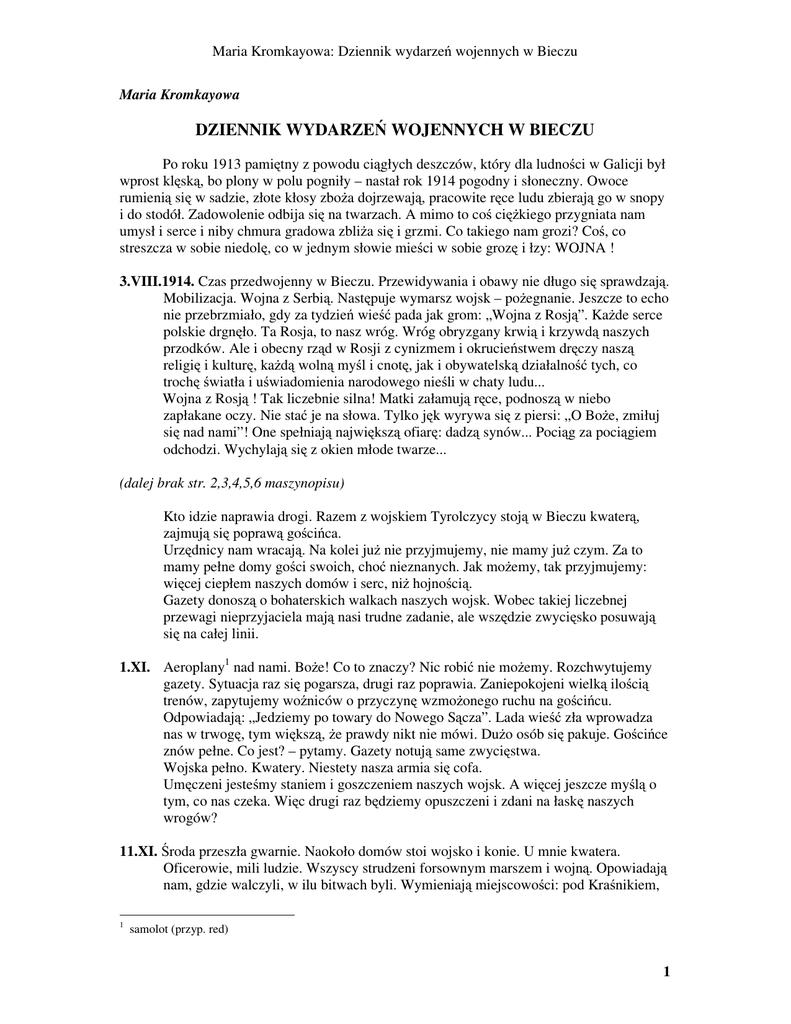 Maria Kromkayowa: Dziennik wydarze wojennych w Bieczu Maria Kromkayowa DZIENNIK WYDARZE WOJENNYCH W BIECZU Po roku 1913 pami tny z powodu ci głych deszczów, który dla ludno ci w Galicji był wprost kl sk , bo plony w polu pogniły – nastał rok 1914 pogodny i słoneczny. Owoce rumieni si w sadzie, złote kłosy zbo a dojrzewaj , pracowite r ce ludu zbieraj go w snopy i do stodół. Zadowolenie odbija si na twarzach. A mimo to co ci kiego przygniata nam umysł i serce i niby chmura gradowa zbli a si i grzmi. Co takiego nam grozi? Co , co streszcza w sobie niedol , co w jednym słowie mie ci w sobie groz i łzy: WOJNA ! 3.VIII.1914. Czas przedwojenny w Bieczu. Przewidywania i obawy nie długo si sprawdzaj . Mobilizacja. Wojna z Serbi . Nast puje wymarsz wojsk – po egnanie. Jeszcze to echo nie przebrzmiało, gdy za tydzie wie pada jak grom: „Wojna z Rosj ”. Ka de serce polskie drgn ło. Ta Rosja, to nasz wróg. Wróg obryzgany krwi i krzywd naszych przodków. Ale i obecny rz d w Rosji z cynizmem i okrucie stwem dr czy nasz religi i kultur , ka d woln my l i cnot , jak i obywatelsk działalno tych, co troch wiatła i u wiadomienia narodowego nie li w chaty ludu... Wojna z Rosj ! Tak liczebnie silna! Matki załamuj r ce, podnosz w niebo zapłakane oczy. Nie sta je na słowa. Tylko j k wyrywa si z piersi: „O Bo e, zmiłuj si nad nami”! One spełniaj najwi ksz ofiar : dadz synów... Poci g za poci giem odchodzi. Wychylaj si z okien młode twarze... (dalej brak str. 2,3,4,5,6 maszynopisu) Kto idzie naprawia drogi. Razem z wojskiem Tyrolczycy stoj w Bieczu kwater , zajmuj si popraw go ci ca. Urz dnicy nam wracaj . Na kolei ju nie przyjmujemy, nie mamy ju czym. Za to mamy pełne domy go ci swoich, cho nieznanych. Jak mo emy, tak przyjmujemy: wi cej ciepłem naszych domów i serc, ni hojno ci . Gazety donosz o bohaterskich walkach naszych wojsk. Wobec takiej liczebnej przewagi nieprzyjaciela maj nasi trudne zadanie, ale wsz dzie zwyci sko posuwaj si na całej linii. 1.XI. Aeroplany1 nad nami. Bo e! Co to znaczy? Nic robi nie mo emy. Rozchwytujemy gazety. Sytuacja raz si pogarsza, drugi raz poprawia. Zaniepokojeni wielk ilo ci trenów, zapytujemy wo niców o przyczyn wzmo onego ruchu na go ci cu. Odpowiadaj : „Jedziemy po towary do Nowego S cza”. Lada wie zła wprowadza nas w trwog , tym wi ksz , e prawdy nikt nie mówi. Du o osób si pakuje. Go ci ce znów pełne. Co jest? – pytamy. Gazety notuj same zwyci stwa. Wojska pełno. Kwatery. Niestety nasza armia si cofa. Um czeni jeste my staniem i goszczeniem naszych wojsk. A wi cej jeszcze my l o tym, co nas czeka. Wi c drugi raz b dziemy opuszczeni i zdani na łask naszych wrogów? 11.XI. roda przeszła gwarnie. Naokoło domów stoi wojsko i konie. U mnie kwatera. Oficerowie, mili ludzie. Wszyscy strudzeni forsownym marszem i wojn . Opowiadaj nam, gdzie walczyli, w ilu bitwach byli. Wymieniaj miejscowo ci: pod Kra nikiem, 1 samolot (przyp. red) 1 Maria Kromkayowa: Dziennik wydarze wojennych w Bieczu Komarowem, Jarosławiem, Samborem. Z całego grona oficerów zastali my my czterej. Łzy im błyszcz w oczach na wspomnienie towarzyszów. Odczuwamy serdecznie ich my li i poło enie. Staramy si umili im ka d chwil wypoczynku w domach. Nie mo emy si do nasłucha opowiadanych szczegółów z pola walki. Odje d aj . Do widzenia! Do widzenia! W południe s inni, a na wieczór przyjechało tak du o wojska, e ju nawet miejsca nie mamy. Wszyscy oficerowie przemili ludzie i wykształceni. Niektórzy z nich zajmuj wybitne stanowiska, maj doktoraty, a od czasu obecnej wojny s w wojsku. Ostatni, s na kwaterze, to piechota. Pułk lwowski. Maj rozkaz odjazdu o 5 godzinie rano. Po ich odje dzie widzimy, jak krzywd nam zrobili. Podczas gdy my z serdeczn go cinno ci podejmowali oficerów, ołnierze odbili kłódk od mego kurnika. liczne rasowe, wypierzone kokoszki wyhodowane takim staraniem i kosztem zabrali, zabili. Z oskubanych piór białych i popielatych zrobili mi piramid . Nie byłam ju u siebie i łzy jak groch spłyn ły mi z oczu. Wyszłam do pokoju, zabrali mi podarowany chleb (przez oficerów, którzy odjechali wieczór) a ze stołu zabrali i no e. Słu ba, co rzeczy oficerów i po ciel pakuje, du o nam rzeczy kradnie, ale ci ostatni to li ludzie. Rusini. Byłam cały dzie bez obiadu. W rod wieczorem odjechała kolej, poczta, znajomi. Cisza, czy na długo? Smutni jeste my. Sprz tamy w domu. Nie mamy ch ci ani mówi . Sobota 14.XI. Patrole konne moskiewskie przyjechały. Defiluj go ci cem, gromadz si na drodze. Z okna widz , e jad na Kukułówk „smotra ”2. Zaraz si tam rozgo cili. Potem szukaj dalej kwater. Niedziela 15.XI. Przyszła husaria gwardii. Id i id nieprzerwanie. Zalewaj nas jak lawa. Kwatera. Pułkownik ze swoim oficerem. Wysoki do gładki w obej ciu. Rozmówi si z nimi mo na. Rozumiej , co ja mówi . Rosjanie ci, co byli bli ej Polski lub w Warszawie wyra aj si dobrze, s nawet grzeczniejsi. Pułkownik mi opowiadał, e miał przyjaciela Polaka, tak e w randze pułkownika, ale zgin ł pod Lwowem. Gotuj w mojej kuchni. Na kolacj przyszedł do kwateruj cego u mnie pułkownika, pułkownik kozacki stoj cy kwater w s siedniej kamienicy. Ciemnowłosy, twarz ci gła, wyraz chmurny. Po kolacji przegl daj mapy Galicji. - Prosz pani – pytaj w pewnej chwili – daleko do Krakowa? Ile kilometrów? - Doprawdy nie wiem, je d kolej , a ko mi i lini powietrzn , co innego, przypuszczalnie – po namy le powiedziałam – 20 mil3. Panowie id na Kraków. - Tak, idziemy do Krakowa. - Panowie Krakowa nie dostan . - Czemu? - Bo b dzie silnie broniony. - Pani wie, jak nasze kanony bij . - By mo e, ale i nasi kanony maj . - Przeszli my cał wschodni Galicj i jeste my w Bieczu. Za 5 dni b dziemy pod Krakowem. Przyjechali my do Biecza na koniach i na koniach pojedziemy do Krakowa. - Zobaczymy – panowie Krakowa nie dostan . 2 z rosyjskiego = patrze (przyp. red.) Autorka w celu wprowadzenia rozmówców w bł d u ywa której z dawnych jednostek odleg