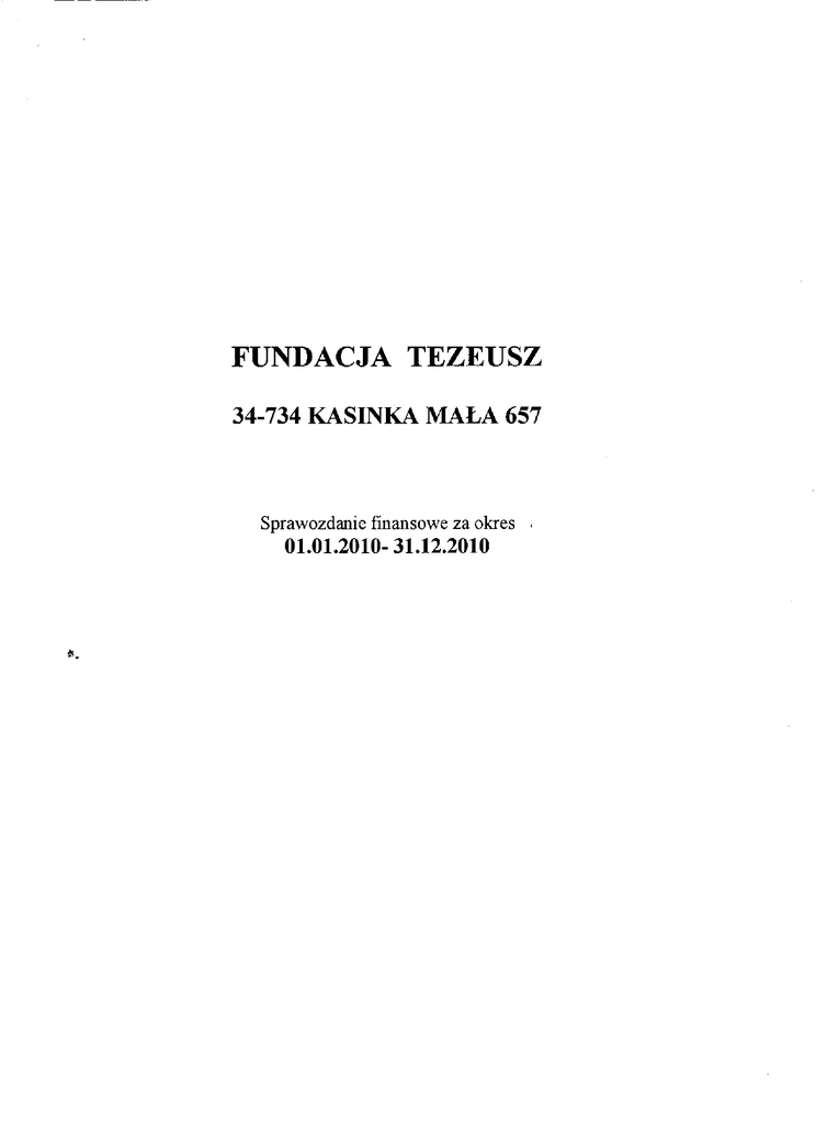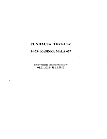 FUNDACJA TEZEUSZ 34-734 KASINKA MALA 657 Sprawozdanie finansowe za okres . 01.01.2010-31.12.2010 SPIS TRESCI: I. WST^P - OSWIADCZENTE ZARZ^DU II. BTLANS III. RACHUNEK WYNIKOW IV. INTORMACJA DODATKOWA OSWIADCZENIE ZARZ^DU Stosownie do artykulu 52 ustawy o rachunkowosci z dnia 29 wrzesnia 1994 roku oraz Rozporzadzenia Ministra Finansow z dnia 15 listopada 2001 roku w sprawie szczegolnych zasad rachunkowosci dla niektorych jednostek nieb^dacych spolkami handlowymi, nie prowadzacymi dzialalnosci gospodarczej z pozniejszymi zmianami, Zarzad Fundacji Tezeusz przedstawia sprawozdanie fmansowe na dzien 31.12.2010 roku, na ktore sklada sie: • Bilans sporzadzony na dzien 31.12.2010 r. • Rachunek wynikow za okres 01.01.2010- 31.12.2010 r. • Informacja dodatkowa Sprawozdanie fmansowe sporzadzone zostaio zgodnie z przedstawionymi zasadami ustawy o rachunkowosci oraz rzetelnie i jasno przedstawia sytuacj? majatkowa i finansowq oraz wynik fmansowy. Podpisy czJonkow Zarz^du Jotanta ijacek Wanago s.c. .'>l-':;-;6 Krakow, vs. Ojswiccenia 4-1/92c (iinip, naxwisko, stanowisko) (imi?, nazwisko, stanowisko) (imi?, nazwisko, stanowisko) (osoba odpowiedziana za prowadzenie ksiag rachunkowych) FUNDACJA TEZEUSZ 34-734 KASINKA MALA 657 NIP: 737-213-73-54 REGON: 120826282 BILANS AKTYWA 2010 PASYWA 2009 2010 A.AKTYWA TRWALE I.Wartosci niematerialne i prawne II.Rzeczowe aktywa trwate lll.Naleznosci diugoterminowe IV.Inwestycje dtugoterminowe V.Dtugoterminowe rozliczenia miedzyokresowe 6 749,99 15899,99 6 749,99 3 749,99 B.AKTYWA OBROTOWE I.Zapasy rzeczowych aktywow obrotowych II.Naleznosci krotkoterminowe lll.lnwestycje krotkoterminowe Lsrodki pieniezne 2.pozostaJe aktywa finansowe 3 634,07 21 318,17 0,00 0,00 C.KROTKOTERMINOWE ROZLICZENIA MIE.DZYOKRES. SUMA AKTYWOW 0,00 12150,00 0,00 0,00 0,00 0,00 0,00 0,00 1 070,47 20 892,51 2 563,60 425,66 2 563,60 425,66 0,00 0,00 0,00 0,00 10384,06 37218,16 Sporzadzita J.Wanago 02.03.2011 BIURO RACHUNKOWE Jolanta i JacekWanago s.c. 31-636 Krakow, os. Oslvicccnia 44/92c tcl./fax 12 / 649 19 3\7 050 239 N I P 678-27-25-877 REflON 357032348 2009 2010 A.FUNDUSZE WLASNE I.Funduszstatutowy II.Fundusz z aktualizacji wyceny Ill.Wynik finansowy netto za rok obrotowy 1.Nadwy±ka przychod6w nad koszt. 2.Nadwyzka kosztow nad przychod. miedzyokresowe 8041,59 11 000,00 0,00 -2 958,41 23986,15 11000,00 0,00 12986,15 0,00 -2 958,41 12986,15 0,00 B.ZOBOWIAZANIA 1 REZERWY NAZOBOWIAZANIA I.Zobow.diugoterminowe z tytulu kredytow i pozyczek 1 1.Zobowiazania krotkoterminowe i fundusze specjalne Ikredyty i poiyczki 2.innezobowi^zania 3. fundusze specjalne lll.Rezerwy na zobowiazania IV. Rozliczenia miedzyokresowe Irozl. miedzyokresowe przychod. 2.inne rozliczenia miedzyokresowe 2 342,47 13232,01 0,00 0,00 2 342,47 1 082,01 0,00 2 342,47 0,00 0,00 0,00 0,00 0,00 0,00 1 082,01 0,00 0,00 12150,00 0,00 12150,00 10 384,06 37218,16 SUMA PASYWOW FUNDACJA TEZEUSZ 34-734 KASINKA MALA 657 NIP: 737-213-73-54 REGON: 120826282 RACHUNEKWYNIKOW 2010 Poz. Wyszczegolnienie A. I. II. 1. 2. Przychody z dziatalnosci statutowej nieodptatnej wptaty na dziat. uzytku publicznego dotacje FIO przychody z dziatalnosci statutowej odptatnej pozostate przychody okreslone statutem- darowizny B. Koszty realizacji zadari statutowych w tym koszty realizacji proj FIO Wynik finansowy na dziatalnosci statutowej (A-B) C. 2009 35194,92 0,00 0,00 7 353,77 27841,15 2010 158571,62 351,80 91 874,00 40 145,82 26 200,00 46034,15 -10839,23 169096,31 106030,74 -10524,69 D. Koszty administracji Lzuzycie materiatow i energii 2.ustugi obce S.podatki i optaty 4.wynagrodzenia 5. ubezpieczenia spoteczne S.amortyzacja G.pozostale 24 676,90 6 344,29 18272,61 60,00 0,00 0,00 0,00 0,00 27 330,35 17891,69 4 653,96 295,50 0,00 0,00 4 258,20 231 ,00 E. F. G. H. Pozostate przychody operacyjne Pozostate koszty operacyjne Przychody finansowe Koszty finansowe 32 657,61 100,00 0,11 0,00 53 800,21 0,61 0,00 0,00 I. Wynik finansowy bruttto (C-D+E-F+G-H) -2 958,41 15944,56 J. Zyski i straty nadzwyczajne l.Zyski nadzwyczajne ll.Straty nadzwyczajne 0,00 0,00 0,00 0,00 0,00 0,00 K. Wynik finansowy na catoksztatcie dziatalnosci ogotem (I-J) Roznica zwie.kszja.ca koszty roku nastep. Roznica zwie_kszjgca przychody roku nastep. -2 958,41 15944,56 I. II. Sporzadzila J.Wanago 02.03.2011 jolanta i jac&kWanago s.c, 31-636 Krakow, ou. pswiecenia 44/92c td./fax 12 / 649 19 tf4, 607 050 239 NIL 1 678-27-25-877 RfeGON 357032.!-:-ii 2 958,41 12986,15 INFORMACJA DODATKOWA 1. Informacje por/ijdkowe Sprawozdanie finansowe Fundacji Tezeusz z siedziba_ w Kasince Malej 657 zostalo sporzadzone zgodnie z UstawEj, z dnia 29 wrzesnia 1994 roku o rachunkowosci oraz Rozporz^dzeniem Ministra Finansow z dnia 15 Hstopada 2001 roku w sprawie szczegolnych zasad rachunkowosci dlaniektorychjednosteknieb^dacych spolkami handlowymi. Przedmiotem dziatalnosci Fundacji jest: Dzialalnosc pozostalych organizacji czlonkowskich, gdzie indziej niesklasyfikowana. Klasyfikacja dzialalnosci wed tug PKD przedstawia si$ nast^pujaco: Dziatalnosc podstawowa: - DZIALALNOSC POZOSTALYCH ORGANIZACJI CZLONKOWSKICH, GDZIE INDZIEJ NIESKLASYFIKOWANA ujete wg PKD w dziale 9133.Z, - DZIALALNOSC PORTALI INTERNETOWYCH - 6312.Z Fundacja dokonala wpisu do Krajowego Rejestru Sadowego w Rejestrze Stowarzyszen, Innych Organizacji Spolecznych i Zawodowych, Fundacji Oraz Publicznych Zakladow Opieki Zdrowotnej orazRejestrzePrzedsi^biorcow wdniu 31.08.2009 roku pod numerem KRS 0000315831. Czas trwania Fundacji zgodnie ze statutem jest nieograniczony. 2. Prezentacja sprawozdan finansowych Fundacja prezentuje Sprawozdanie finansowe za rok obrotowy rozpoczynaj^cy sie 01.01.2010 roku i kohcz^cy sie 31.12.2010 roku. Sprawozdanie finansowe zostalo sporzadzone przy zalozeniu kontynuowania dzialalnosci przez Fundacje w daj^cej sie przewidziec przyszlosci, obejmujacej okres nie krotszy niz jeden rok od dnia bilansowego, w nie zmniejszonym istotnie zakresie. Nie istniej^ rowniez okolicznosci wskazuj^ce na zagrozenie kontynuowania dzialalnosci