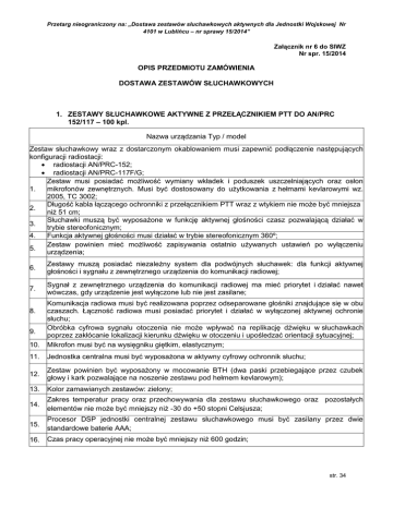 Przetarg nieograniczony na: „Dostawa zestawów słuchawkowych aktywnych dla Jednostki Wojskowej Nr 4101 w Lublińcu – nr sprawy 15/2014” Załącznik nr 6 do SIWZ Nr spr. 15/2014 OPIS PRZEDMIOTU ZAMÓWIENIA DOSTAWA ZESTAWÓW SŁUCHAWKOWYCH 1. ZESTAWY SŁUCHAWKOWE AKTYWNE Z PRZEŁĄCZNIKIEM PTT DO AN/PRC 152/117 – 100 kpl. Nazwa urządzania Typ / model Zestaw słuchawkowy wraz z dostarczonym okablowaniem musi zapewnić podłączenie następujących konfiguracji radiostacji: radiostacji AN/PRC-152; radiostacji AN/PRC-117F/G; Zestaw musi posiadać możliwość wymiany wkładek i poduszek uszczelniających oraz osłon 1. mikrofonów zewnętrznych. Musi być dostosowany do użytkowania z hełmami kevlarowymi wz. 2005, TC 3002; Długość kabla łączącego ochronniki z przełącznikiem PTT wraz z wtykiem nie może być mniejsza 2. niż 51 cm; Słuchawki muszą być wyposażone w funkcję aktywnej głośności czasz pozwalającą działać w 3. trybie stereofonicznym; 4. Funkcja aktywnej głośności musi działać w trybie stereofonicznym 360º; Zestaw powinien mieć możliwość zapisywania ostatnio używanych ustawień po wyłączeniu 5. urządzenia; 6. Zestawy muszą posiadać niezależny system dla podwójnych słuchawek: dla funkcji aktywnej głośności i sygnału z zewnętrznego urządzenia do komunikacji radiowej; 7. Sygnał z zewnętrznego urządzenia do komunikacji radiowej ma mieć priorytet i działać nawet wówczas, gdy urządzenie jest wyłączone lub nie jest zasilane; 10. Komunikacja radiowa musi być realizowana poprzez odseparowane głośniki znajdujące się w obu czaszach. Łączność radiowa musi posiadać priorytet i działać w wyłączonej aktywnej ochronie słuchu; Obróbka cyfrowa sygnału otoczenia nie może wpływać na replikację dźwięku w słuchawkach poprzez zakłócanie lokalizacji kierunku dźwięku w otoczeniu i upośledzać orientacji sytuacyjnej; Mikrofon musi być na wysięgniku giętkim, elastycznym; 11. Jednostka centralna musi być wyposażona w aktywny cyfrowy ochronnik słuchu; 12. Zestaw powinien być wyposażony w mocowanie BTH (dwa paski przebiegające przez czubek głowy i kark pozwalające na noszenie zestawu pod hełmem kevlarowym); 13. Kolor zamawianych zestawów: zielony; 14. Zakres temperatur pracy oraz przechowywania dla zestawu słuchawkowego oraz pozostałych elementów nie może być mniejszy niż -30 do +50 stopni Celsjusza; 15. Procesor DSP jednostki centralnej zestawu słuchawkowego musi być zasilany przez dwie standardowe baterie AAA; 16. Czas pracy operacyjnej nie może być mniejszy niż 600 godzin; 8. 9. str. 34 Przetarg nieograniczony na: „Dostawa zestawów słuchawkowych aktywnych dla Jednostki Wojskowej Nr 4101 w Lublińcu – nr sprawy 15/2014” 17. Zestaw słuchawkowy powinien być wyposażony w opcję powiadamiania o wyczerpywaniu się baterii na min 40 godzin przed ich całkowitym rozładowaniem; 18. Komunikacja radiowa nie może być uniemożliwiona lub pogorszona na wskutek wyczerpywania lub wyczerpania się baterii zasilających; 19. 20. 21. 22. 23. 24. W celu oszczędzania energii systemy DSP powinny wyłączać się po czterech godzinach od ostatniego użycia lub ruchu; Wszystkie złącza systemu muszą być zgodne z następującymi normami produkcji: MIL-C-26482G i MIL-C-39029D (jeżeli dotyczy), i norm wodoszczelności przewidzianych przez producenta radiostacji; Słuchawki powinny efektywnie przenosić częstotliwości w zakresie minimum 60-6000 Hz, przy jednoczesnym zapewnieniu pasywnego i aktywnego działania systemu INR na poziomie minimum 82dB (de-clicking i de-popping). Jednocześnie podczas działania w/w systemu dźwięki poniżej 82 dB nie mogą być wytłumiane; Słuchawki powinny zapewniać współczynnik NRR (tłumienia szumów) zgodnie z normami ANSI S3.19-1974, EN352-3 i Z94.2 CSA; Sterownik musi być odporny na trudne warunki użytkowania, temperatury, długotrwałe narażenie na promieniowanie UV i inne warunki typowe dla operacji wojskowych. Sterownik oraz zestaw słuchawkowy wraz z mikrofonem powinien spełniać normy MIL-STD-810C/D/E/F, MIL-STD-461E, oraz dodatkowo sterownik powinien posiadać klasę wodoszczelności IP67 (do metra głębokości przez 30 minut); Sterownik PTT musi posiadać mocowanie do systemu MOLLE/PALS za pomocą klipu z velcro przymocowanego do PTT od tyłu . Mocowanie klipu musi umożliwić ustawienie sterownika w dowolnej pozycji wokół osi 25. Sterownik musi zapewniać bezgłośną pracę podczas użytkowania (bez głośnego kliknięcia). 26. Sterownik musi posiadać ochronę przed przypadkowym wciśnięciem (pierścień ochronny, przycisk znajduje się w środku). 27. Musi posiadać wyjście do przełącznika PTT mocowanego na palcu (dla snajperów) Wykonawca zobowiązany jest do: 1. Udostępnienia Zamawiającemu, własnych i pozyskiwanych od poddostawców, aktualnych danych technicznych, niezbędnych do identyfikacji sprzętu i wszystkich innych pozycji zaopatrzenia obejmujących zadanie (np.: materiałów eksploatacyjnych itp.) – na żądanie Zamawiającego. 2. Udostępnienia Zamawiającemu aktualnych danych dotyczących nazwy i adresu siedziby poddostawców dla wszystkich pozycji realizowanego zadania w terminie do 30 dni od otrzymania wniosku od Zamawiającego. str. 35