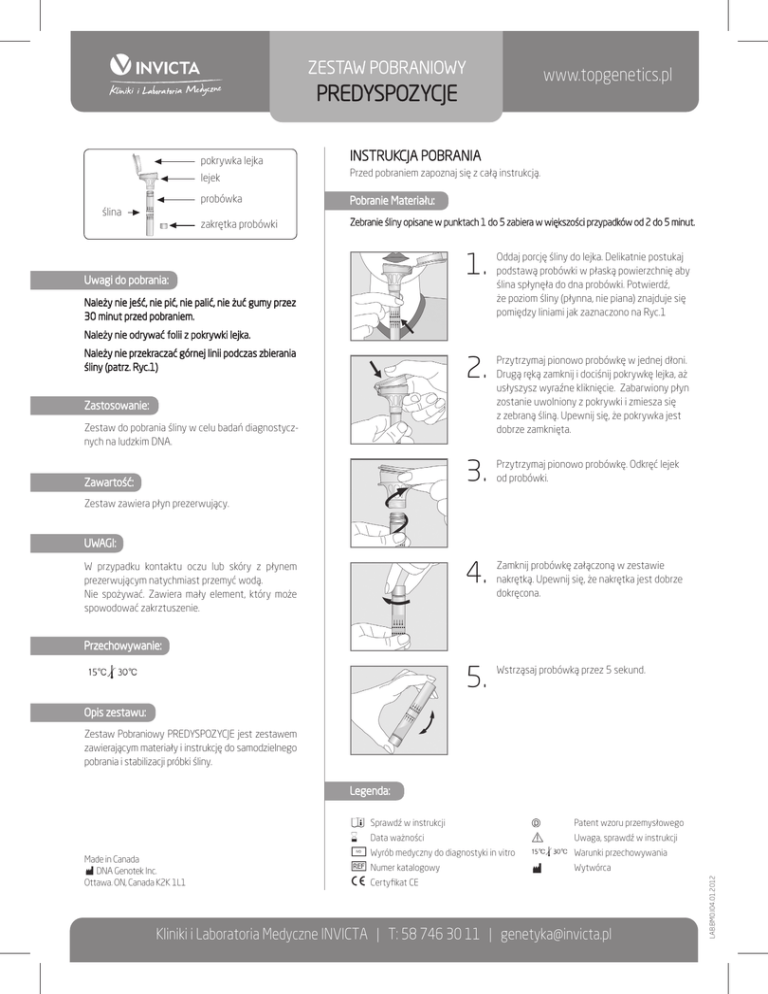 ZESTAW POBRANIOWY www.topgenetics.pl PREDYSPOZYCJE pokrywka lejka lejek probówka ślina zakrętka probówki INSTRUKCJA POBRANIA Przed pobraniem zapoznaj się z całą instrukcją. Pobranie Materiału: Procedure: Zebranie śliny opisane w punktach 1 do 5 zabiera w większości przypadków od 2 do 5 minut. Uwagi do pobrania: 1. Oddaj porcję śliny do lejka. Delikatnie postukaj podstawą probówki w płaską powierzchnię aby ślina spłynęła do dna probówki. Potwierdź, że poziom śliny (płynna, nie piana) znajduje się pomiędzy liniami jak zaznaczono na Ryc.1 2. Przytrzymaj pionowo probówkę w jednej dłoni. Drugą ręką zamknij i dociśnij pokrywkę lejka, aż usłyszysz wyraźne kliknięcie. Zabarwiony płyn zostanie uwolniony z pokrywki i zmiesza się z zebraną śliną. Upewnij się, że pokrywka jest dobrze zamknięta. 3. Przytrzymaj pionowo probówkę. Odkręć lejek od probówki. 4. Zamknij probówkę załączoną w zestawie nakrętką. Upewnij się, że nakrętka jest dobrze dokręcona. 5. Wstrząsaj probówką przez 5 sekund. Należy nie jeść, nie pić, nie palić, nie żuć gumy przez 30 minut przed pobraniem. Należy nie odrywać folii z pokrywki lejka. Należy nie przekraczać górnej linii podczas zbierania śliny (patrz. Ryc.1) Zastosowanie: Zestaw do pobrania śliny w celu badań diagnostycznych na ludzkim DNA. Zawartość: Zestaw zawiera płyn prezerwujący. UWAGI: W przypadku kontaktu oczu lub skóry z płynem prezerwującym natychmiast przemyć wodą. Nie spożywać. Zawiera mały element, który może spowodować zakrztuszenie. Przechowywanie: Opis zestawu: Zestaw Pobraniowy PREDYSPOZYCJE jest zestawem zawierającym materiały i instrukcję do samodzielnego pobrania i stabilizacji próbki śliny. Made in Canada DNA Genotek Inc. Ottawa. ON, Canada K2K 1L1 Sprawdź w instrukcji Patent wzoru przemysłowego Data ważności Uwaga, sprawdź w instrukcji Wyrób medyczny do diagnostyki in vitro Warunki przechowywania Numer katalogowy Wytwórca Certyfikat CE Kliniki i Laboratoria Medyczne INVICTA | T: 58 746 30 11 | [email protected] LAB.BMO.I04.01.2012 Legenda: