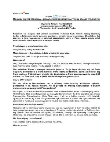 FUNDACJA Projekt 233/2007 OCALMY OD ZAPOMNIENIA – RELACJE REPRESJONOWANYCH W STANIE WOJENNYM Wywiad z Jerzym KANIEWSKIM przeprowadzony przez Marię Bal w Warszawie, dn. 21 grudnia 2007 roku Nazywam się Marynia Bal, jestem ankieterką Fundacji KOS. Celem naszej rozmowy będzie udokumentowanie pańskiej pamięci o okresie stanu wojennego. Chciałabym też zapytać o inne wydarzenia z pańskiej przeszłości, które w Pana ocenie mogły mieć znaczenie dla pańskiego życia w tamtym czasie. Prosiłabym o przedstawienie się. Nazywam się Jerzy KANIEWSKI. Może jeszcze tylko miejsce i data urodzenia poproszę. To jest 4.08.1948. W moje urodziny strzelają rakiety. Warszawa? Nie, Ostrowiec Świętokrzyski. Teraz już nie, ale jeszcze kilka lat temu Amerykanie robili tutaj festyny takie mocne. No tu gdzieś w okolicy. Nie mówiłam Panu o naszym badaniu jeszcze. To ja bym chciała się od Pana najpierw dowiedzieć o Pana historii, Pana domu rodzinnym, czym zajmowali się Pana rodzice. Później bym chciała się dowiedzieć o Pana zaangażowaniu przed 81 rokiem, co Pan robił, czy w jakiś młodzieżowych organizacjach.. Czy w ZMP byłem? No tak, albo w harcerstwie.. no a później takie troszkę luźniejsze pytania, generalnie o tej naszej historii. No to proszę mi trochę opowiedzieć o swoim domu, czym się zajmowali Pana rodzice? No to jest, jak napisała Pani o Ostrowcu. Jest to takie miasto, które powstało przy hucie. 150 lat temu ktoś się zdecydował się na wybudowanie huty. To było zagłębie tak zwane Staropolskie, Starachowice, Huta Skarżysko. I jak to w takim mieście, mój dziadek, ojciec pracował w tej hucie. Drugi dziadek był szewcem. Chociaż nie był szewcem, też pracował w hucie, ale jak go wywalili to musiał coś robić, i robił buty. Rodzice.. A mama czym się zajmowała? Rosjanie jak w pierwszą wojnę światową, jak się wycofywali z tych rejonów zabrali tą hutę prawie w całości, razem z robotnikami. Dziadek znalazł się gdzieś za Tallinem, tam się ożenił i tam się urodził mój ojciec. W mieście, którego nie wymówię. Matka jest z Ostrowca, bo oni później wrócili z tego Tallina. Dalej to byłem ja, siostra była pierwsza. Ma Pan więcej rodzeństwa? Tak, jeszcze jedna siostra i brat, czworo nas było. Młodsi, starsi? 1 Ja jestem drugi w kolejności, najstarsza jest siostra.. A jeszcze proszę mi powiedzieć, czym mama się zajmowała? Mama.. skończyła podstawówkę, później pracowała w sklepie, później w internacie. Była kucharką w tym internacie. Ojciec pracował w hucie, na walcowni. To tyle. A czy rodzice byli zaangażowani w jakąś działalność.. To znaczy zbyt zaangażowani nie byli, z jednym takim epizodem. Ojciec już, nie wiem w którymś tam 50 roku, ja tego dokładnie nie pamiętam, był jakimś tam sekretarzem partii. Nie w mieście, to była w hucie działalność. Ale to było przed 56 rokiem, kiedy była cała zmiana i wrócił spokojnie do walcownictwa, bo to mu lepiej szło. To nie wpłynęło na mnie za bardzo, bo ja jeszcze nie kontaktowałem tego za bardzo. Chociaż pamiętam, w 53 roku taką wielką gazetę z portretem Stalina jak umarł.. Rodzice przynieśli? Tak, bo to się wtedy kupowało Trybunę Ludu. Taką całą pierwszą stronę czarną pamiętam do tej pory. Przy hucie mieszkaliśmy na tyle blisko, że słyszeliśmy syreny. To stwarzało wrażenie. A w domu rozmawialiście Państwo o sytuacji politycznej, mówiło się o tym? Tak, tak. Ja Pani powiem, sprawy polityczne są w Polsce takie.. Ojciec był przez chwile zaangażowany, ale to trzeba było mieć specyficzne podejście i nie wiem, albo być cynicznym albo bardzo zaangażowanym, żeby znieść wtedy te komunistyczne metody. A on nie był ani tak ani tak, więc zrezygnował i dalej nie prowadził już żadnej działalności. Natomiast ze strony matki dziadek mój nie, ale jego bracia i moje babki, byli zaangażowanie w PPS, oni tam działali. Nawet później kiedyś tam, coś tam.. I w mojej rodzinie były takie dwa nurty, wcale nie prawicowe. To był ojciec taki tam no, powiedzmy należał do partii. I ze strony rodziny wspomnienia, bo tam należeli do POWu, tacy przedwojenni socjaliści, którzy inaczej na to patrzyli. I faktycznie to było widać po tych rodzinach. A były jakieś tarcia? Były, ale to nie była rodzina zaangażowana politycznie. Rodzice nie byli zaangażowani w politykę, nawet na 1go maja nie chodzili. Ale pojęcie o tym, co się dzieje w kraju miałem. Do tego w opozycji do tych rodzinnych tradycji ja troszeczkę inaczej to wszystko widziałem? A w jakim sensie? To chyba się wiąże z indywidualną postawą, tzn. ja byłem indywidualista. Pani pyta o organizacje, do żadnych się nie zapisałem, ja byłem indywidualista. Nie lubiłem takich skomasowanych akcji, robienia pod sznurek i mówienia haseł zgodnie z tym, co ktoś krzyczy. Pamiętam, że od zawsze tak było. Nie wiem, co na to wpłynęło. Na pewno nie rodzina, na pewno nie szkoła, w której ciągle zapisywali do jakiś organizacji. A czy uczestniczył Pan w jakiś wyjazdach z zuchami? Nie, no właśnie nie.. To znaczy, że nie tylko Pan się nie zapisywał, ale też nie uczestniczył? Nie uczestniczyłem. Ja uczestniczyłem w innych obozach. Ja od 3 klasy stratowałem zawsze w jakiś zawodach, ciągle miałem zawody. Poczynając od łucznictwa, którego 2 wcale się teraz nie widzi. Takie nietypowe. Później lekkoatletyka, też nietypowe. W piłkę nożną nie grałem.. to też nietypowo.. No tak, tak. Rzucałem oszczepem zamiast grać w piłkę nożną. A później, po studiach, żeby sobie coś poszukać grałem w badmintona, też nietypowo. Jeszcze u nas nie znano badmintona, jeszcze nie był wpisany do ligi, a ja już wtedy grałem prawie zawodowo. No i zaszliśmy widzi Pani w dygresję. I bardzo dobrze.. A proszę mi powiedzieć, chodził Pan do szkoły w Ostrowcu? Tak, do podstawowej, a później, zgodnie z tradycją rodzinną do technikum hutnicze