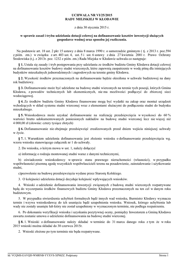 UCHWAŁA NR VI/25/2015 RADY MIEJSKIEJ W KŁODAWIE z dnia 30 stycznia 2015 r. w sprawie zasad i trybu udzielania dotacji celowej na dofinansowanie kosztów inwestycji służących gospodarce wodnej oraz sposobu jej rozliczania. Na podstawie art. 18 ust. 2 pkt 15 ustawy z dnia 8 marca 1990 r. o samorzadzie gminnym ( tj. z 2013 r. poz.594 z późn. zm.) w związku z art. 403 ust. 4, ust. 5 i ust. 6 ustawy z dnia 27 kwietnia 2001 r. Prawo Ochrony Środowiska (t.j. z 2013r. poz. 1232 z późn. zm.) Rada Miejska w Kłodawie uchwala co następuje: § 1. Ustala się zasady i tryb postępowania przy udzielaniu ze środków budżetu Gminy Kłodawa dotacji celowej na dofinansowanie kosztów budowy studni wierconych, które zapewnią zaopatrzenie w wodę pitną dla istniejących budynków mieszkalnych jednorodzinnych i zagrodowych na terenie gminy Kłodawa. § 2. Wysokość środków przeznaczonych na dofinansowanie będzie określona w uchwale budżetowej na dany rok budżetowy. § 3. Dofinansowanie może być udzielone na budowę studni wierconych na terenie tych posesji, których Gmina Kłodawa, z powodów technicznych lub ekonomicznych, nie ma mozliwości podłączyć do zbiorczej sieci wodociągowej. § 4. Ze środków budżetu Gminy Kłodawa finansowane mogą być wydatki na zakup oraz montaż urządzeń wchodzących w skład systemu studni wierconej wraz z elementami służacymi do podłączenia studni do budynku mieszkalnego. § 5. Wnioskodawca może uzyskać dofinansowanie na realizację przedsięwzięcia w wysokosci do 60 % wartości brutto udokumentowanych poniesionych nakładów na budowę studni wierconej lecz nie więcej niż 4 000,00 zł (słownie: cztery tysiące złotych) § 6. Dofianansowanie nie obejmuje przedsięwzięć zrealizowanych przed dniem wejścia niniejszej uchwały w życie. § 7. 1. Warunkiem udzielenia dofinansowania jest złożenie wniosku o dofinansowanie przedsięwzięcia wg. wzoru wniosku stanowiącego załącznik nr 1 do uchwały. 2. Do wniosku, o kórym mowa w ust. 1, należy dołączyć a) informację o rodzaju montowanej studni waraz z danymi technicznymi, b) oświadczenie wnioskodawcy w sprawie stanu prawnego nieruchomości (własności), w przypadku współwłasności pisemną zgodę wszystkich współwłascicieli terenu na posadowienie, zainstalowanie i użytkowanie studni, c)pozwolenie na budowę przedsięwzięcia wydane przez Starostę Kolskiego. 3. O kolejności udzielenia dotacji decyduje kolejność wpływających wniosków. 4. Wnioski o udzielenie dofinansowania inwestycji związanych z budową studni wierconych rozpatrywane będą do wyczerpania środków finansowych budżetu Gminy Kłodawa przeznaczonych na ten cel w danym roku budżetowym. 5. W przypadku stwierdzenia uchybień formalnych bądź innych wad wniosku, Burmistrz Kłodawy wyznacza termin i wzywa wnioskodawcę do ich usunięcia bądź uzupełnienia wniosku. Wniosek, którego uchybienia lub wady nie zostały usunięte lub który nie został uzupełniony w wyznaczonym terminie, nie podlega rozpatrzeniu. 6. Po dokonaniu weryfikacji wniosku i uzyskaniu pozytywnej oceny, pomiędzy Inwestorem a Gminą Kłodawa zawarta zostanie umowa o udzielenie dofinansowania na budowę studni wierconej. § 8. 1. Wnioski o dofinansowanie należy składać w terminie do 31 marca danego roku z tym że w roku 2015 wnioski można składać do 30 czerwca 2015r. 2. Wnioski złożone po tym terminie nie będa rozpatrywane. Id: VCQMS-EAVQD-WMRNB-YYXVS-XPMZZ. Podpisany Strona 1 § 9. 1. Po zrealizowaniu przedsięwzięcia, nie później jednak niż w terminie do 30 listopada roku budżetowego, w którym zawarto umowę o udzielenie dofinansowania, Inwestor składa sprawozdanie z wykonania przedsięwzięcia wg wzoru sprawozdania stanowiącego załącznik nr 2 do niniejszej uchwały. 2. Do sprawozdania, o którym mowa w ust. 1 Inwestor zobowiazany jest dołączyć: a) Analizę badania wody w zakresie fizykochemicznym i bakteriologicznym potwierdzającą przydatność wody do spożycia, b) Faktury potwierdzające poniesienie nakładów z dowodami zapłaty, c) Oświadczenie Wykonawcy, że roboty montażowe zostały wykonane w sposób gwarantujący prawidłową pracę urządzenia, d) Dokumentację geodezyjną - powykonawczą, e) Dokument świadczący o dokonaniu zgłoszenia Staroście Kolskiemu obudowy ujęcia wód podziemnych, e) Dokumenty potwierdzające, iż użyte materiały i zastosowane urządzenia są dopuszczone do stosowania w budownictwie. § 10. 1. Burmistrz Kłodawy bądź osoba przez niego upoważniona może dokonać kontroli realizacji zadania, na które udzielono pomocy finansowej. 2. Otrzymujący dotację zobowiązany jest udostępnić na każde żądanie Burmistrza Kłodawy, bądź osoby przez niego upoważnionej, wszelką dokumentację niezbędną do dokonania kontroli prawidłowości wykonania zadania. 3. Zakres kontroli obejmuje: 1) wykonanie zadania zgodnie z umową; 2) udokumentowanie realizowanego zadania; 3) przeznaczenie i wykorzystanie dotacji otrzymanej z budżetu Gminy Kłodawa. 4. Z czynności kontrolnych sporządza się protokół. 5. Na podstawie protokołu kontroli, w przypadku stwierdzenia niezgodności realizacji zadania z warunkami umowy, Burmistrz Kłodawy ma prawo do: 1) wezwania otrzymującego dotację do usunięcia stwierdzonych nieprawidłowości w wyznaczonym terminie; 2) rozwiązania umowy o dofinansowanie ze skutkiem natychmiastowym co jest jednoznaczne z koniecznością zwrotu otrzymanego dofinansowania z należnymi odsetkami naliczonymi od dnia przekazania środków. § 11. Wykonanie uchwały powierza się Burmistrzowi Kłodawy. § 12. Uchwała wchodzi w życie po upływie 14 dni od dnia ogłoszenia w Dzienniku Urzędowym Województwa Wielkopolskiego. Przewodniczacy Rady Miejskiej Grzegorz Siwiński Id: VCQMS-EAVQD-WMRNB-YYXVS-XPMZZ. Podpisany Strona 2 Załącznik nr 1 do Uchwały Nr VI/25/2015 Rady Miejskiej w Kłodawie z dnia 30 stycznia 2015r. WNIOSEK o udzielenie pomocy finanso
