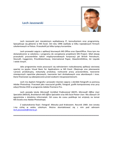 Lech Jaszowski Lech Jaszowski jest niezależnym wykładowcą IT, konsultantem oraz programistą. Specjalizuje się głównie w MS Excel. Od roku 1996 wykłada w kilku największych firmach szkoleniowych w Polsce. Przeszkolił już kilka tysięcy kursantów. Lech prowadzi zajęcia z aplikacji biurowych MS Office oraz OpenOffice. Poza tym ma doświadczenie w szkoleniu z programu do zarządzania projektami MS Project. Miał okazję przeszkolić pracowników takich międzynarodowych korporacji jak British Petroleum, Slovnaft, Capgemini, PriceWaterHouse, International Paper, GlaxoSmithKline, Air Liquide i wiele innych. Jako programista może poszczycić się wdrożeniem rozbudowanej aplikacji sieciowej opartej na języku Visual Basic for Applications w MS Excel. Obejmuje ona planowanie i proces produkcyjny, statystykę produkcji, rozliczanie pracy pracowników, tworzenie miesięcznych raportów płacowych, tworzenie kart dniówkowych oraz akordowych i inne. Dane finansowe są zabezpieczone przed osobami nieupoważnionymi. Lech ma dyplom fotografa i prowadzi również zajęcia z obróbki fotografii za pomocą Adobe Photoshop. Pracował jako nauczyciel grafiki, fotograf, grafik komputerowy oraz przy edycji filmów DVD w programie Adobe Premiere Pro. Lech posiada tytuły Microsoft Certified Professional (MCP), Microsoft Office User Specialist (MOUS), Brainbench MS Office Specialist oraz MS Excel Power User. Ma zdanych 19 egzaminów z dziedziny informatyki. Od czasu do czasu publikuje też artykuły na temat MS Excela oraz Adobe Photoshopa. Z wykształcenia fizyk i fotograf. Mieszka pod Krakowem. Rocznik 1969. Jest żonaty i ma córkę w wieku szkolnym. Można skontaktować się z nim pod adresem [email protected].