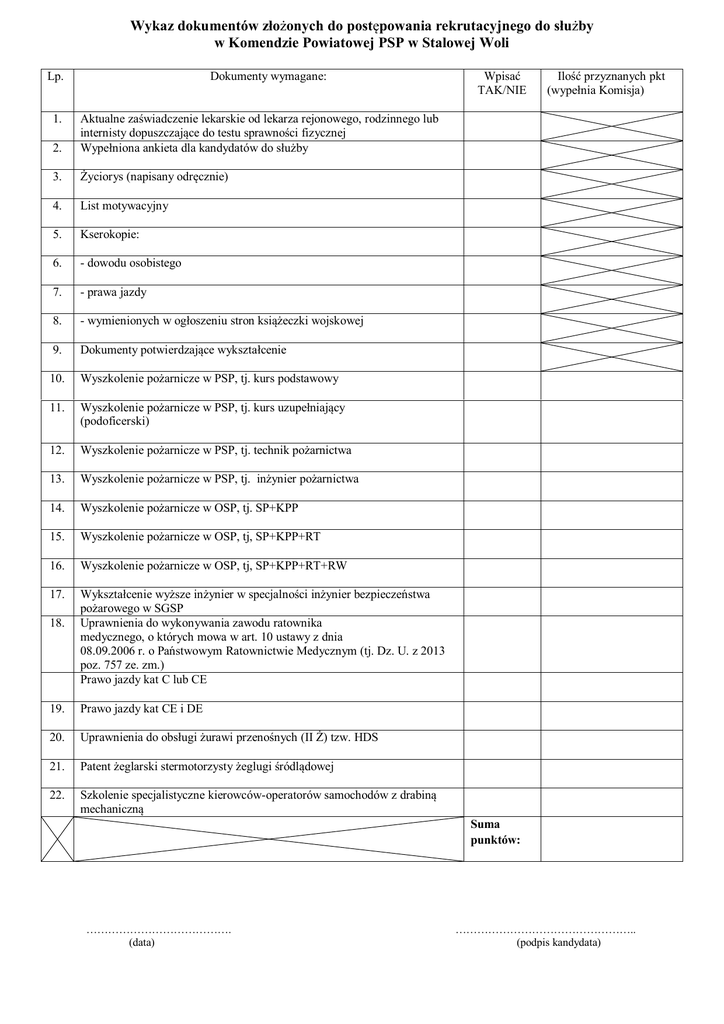 Wykaz dokumentów złożonych do postępowania rekrutacyjnego do służby w Komendzie Powiatowej PSP w Stalowej Woli Lp. 1. Dokumenty wymagane: 2. Aktualne zaświadczenie lekarskie od lekarza rejonowego, rodzinnego lub internisty dopuszczające do testu sprawności fizycznej Wypełniona ankieta dla kandydatów do służby 3. Życiorys (napisany odręcznie) 4. List motywacyjny 5. Kserokopie: 6. - dowodu osobistego 7. - prawa jazdy 8. - wymienionych w ogłoszeniu stron książeczki wojskowej 9. Dokumenty potwierdzające wykształcenie 10. Wyszkolenie pożarnicze w PSP, tj. kurs podstawowy 11. Wyszkolenie pożarnicze w PSP, tj. kurs uzupełniający (podoficerski) 12. Wyszkolenie pożarnicze w PSP, tj. technik pożarnictwa 13. Wyszkolenie pożarnicze w PSP, tj. inżynier pożarnictwa 14. Wyszkolenie pożarnicze w OSP, tj. SP+KPP 15. Wyszkolenie pożarnicze w OSP, tj, SP+KPP+RT 16. Wyszkolenie pożarnicze w OSP, tj, SP+KPP+RT+RW 17. Wykształcenie wyższe inżynier w specjalności inżynier bezpieczeństwa pożarowego w SGSP Uprawnienia do wykonywania zawodu ratownika medycznego, o których mowa w art. 10 ustawy z dnia 08.09.2006 r. o Państwowym Ratownictwie Medycznym (tj. Dz. U. z 2013 poz. 757 ze. zm.) Prawo jazdy kat C lub CE 18. 19. Prawo jazdy kat CE i DE 20. Uprawnienia do obsługi żurawi przenośnych (II Ż) tzw. HDS 21. Patent żeglarski stermotorzysty żeglugi śródlądowej 22. Szkolenie specjalistyczne kierowców-operatorów samochodów z drabiną mechaniczną Wpisać TAK/NIE Ilość przyznanych pkt (wypełnia Komisja) Suma punktów: …………………………………. (data) ………………………………………….. (podpis kandydata)