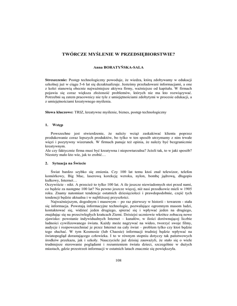 TWÓRCZE MYŚLENIE W PRZEDSIĘBIORSTWIE? Anna BORATYŃSKA-SALA Streszczenie: Postęp technologiczny powoduje, Ŝe wiedza, którą zdobywamy w edukacji szkolnej juŜ w ciągu 5-6 lat się dezaktualizuje. Jesteśmy przeładowani informacjami, a one z kolei stanowią obecnie najwaŜniejsze aktywa firmy, waŜniejsze od kapitału. W firmach pojawia się coraz większa złoŜoność problemów, których nie ma kto rozwiązywać. Potrzebni są zatem pracownicy nie tyle z umiejętnościami zdobytymi w procesie edukacji, a z umiejętnościami kreatywnego myślenia. Słowa kluczowe: TRIZ, kreatywne myślenie, biznes, postęp technologiczny 1. Wstęp Powszechne jest stwierdzenie, Ŝe naleŜy wciąŜ zaskakiwać klienta poprzez produkowanie coraz lepszych produktów, bo tylko w ten sposób utrzymamy z nim trwałe więzi i pozytywny wizerunek. W firmach panuje teŜ opinia, Ŝe naleŜy być bezgranicznie kreatywnym. Ale czy faktycznie firma musi być kreatywna i niepowtarzalna? JeŜeli tak, to w jaki sposób? Niestety mało kto wie, jak to zrobić… 2. Sytuacja na Świecie Świat bardzo szybko się zmienia. Czy 100 lat temu ktoś znał telewizor, telefon komórkowy, Big Mac, laserową korekcję wzroku, nylon, bombę jądrową, długopis kulkowy, Internet… Oczywiście - nikt. A przecieŜ to tylko 100 lat. A ile jeszcze niewiadomych stoi przed nami, co będzie za następne 100 lat? Na pewno jeszcze więcej, niŜ nasi przodkowie mieli w 1905 roku. Znamy natomiast tendencje ostatnich dziesięcioleci i prawdopodobnie, część tych tendencji będzie aktualna i w najbliŜszej przyszłości. NajwaŜniejszym, dogodnym i masowym – po raz pierwszy w historii - towarem - stała się informacja. Powstają informacyjne technologie, pozwalające ogromnym masom ludzi, kontaktować się, widzieć jeden drugiego, spierać się i wpływać jeden na drugiego, znajdując się na przeciwległych krańcach Ziemi. Dzisiejsi uczniowie wkrótce zobaczą nowe zjawisko: powstanie indywidualnych Internet – kanałów, w ilości dorównującej liczbie ludności cywilizowanego świata. KaŜdy moŜe nagrywać na wideo, tworzyć swoje filmy, audycje i rozpowszechniać je przez Internet na cały świat – problem tylko czy ktoś będzie tego słuchać. W tym Kosmosie (lub Chaosie) informacji trudniej będzie wpływać na światopogląd dorastającego człowieka. I to w równym stopniu dotyczy tak państwowych środków przekazu, jak i szkoły. Nauczyciele juŜ dzisiaj zauwaŜyli, Ŝe stało się o wiele trudniejsze sterowanie poglądami i rozumieniem świata dzieci, szczególnie w duŜych miastach, gdzie przestrzeń informacji w ostatnich latach znacznie się powiększyła. 108 2.1. Wzrost szybkości zmian w Ŝyciu ludzkości Produkty i pomysły szybko się rozpowszechniają i praktycznie nie powstrzymują je Ŝadne granice. Tak było z telefonem komórkowym, który potrzebował tylko 5 i pół roku, Ŝeby pojawiło od 10 do 100 mln abonentów. A szerokopasmowy dostęp do Internetu potrzebował juŜ tylko trzy i pół roku. Wcześniej wirus komputerowy rozwijał się w problem światowej skali w ciągu dwóch lat. A obecnie, Ŝeby zarazić wirusem, potrzeba średnio siedemnaście minut. Tendencja jest jasna: cykl Ŝycia idei i produktów mocno się skraca, skraca się czas badań rynkowych i wprowadzania produktu na rynek. Wcześniej w Audi nowy model opracowywano ponad sześćdziesiąt miesięcy, a teraz – nie więcej niŜ pięćdziesiąt. W innych branŜach proces ten jest jeszcze bardziej dynamiczny. W pewnej europejskiej firmie na wdroŜenie projektu wzorniczego i rozpoczęcie sprzedaŜy odzieŜy potrzebne są tylko trzy tygodnie. 2.2. Przeładowanie informacjami. Informacja waŜniejsza od kapitału W 2002 roku ludzkość otrzymywała informację, równą objętości 500 tysiącom Bibliotek Kongresu USA. Nadmierna ilość informacji prowadzi do wzrostu kosztów własnych produkcji – zebranie i przetworzenie informacji okazuje się bardzo drogie. Co roku w USA sprzedaje się prawa własności intelektualnej za ponad 30 mld dolarów. To więcej, niŜ koszt exportu nafty w Rosji. Jednocześnie wykształcenie stało się szybko dezaktualizującym się produktem. JuŜ teraz połowa wiedzy inŜyniera starzeje się w ciągu pięciu lat, a lekarza – w ciągu siedmiu. Jedyne, co stałe w Ŝyciu to zmiany. Biznes staje się ekstremalnym zajęciem, narastające tempo zmian Ŝąda nowych wyzwań w jego prowadzeniu. Tempo narastania informacji ilustruje dobrze znana „krzywa Levisa Memforda”. Polska wydaje rocznie w ostatnich latach ok. 30000 nowych tytułów ksiąŜek – oczywiście wszystkich gatunków i rodzajów. Człowiek, nawet czytający intensywnie; dwie ksiąŜki tygodniowo, przez całe aktywne intelektualnie Ŝycie jest w stanie przeczytać zaledwie ok. 7000 ksiąŜek. Ta sprzeczność wywołuje konkretne, negatywne skutki: − PoniewaŜ „nie da się objąć nieobjętego” – rodzi się kształcenie specjalistów, znawców wąskich dziedzin. − Specjaliści coraz trudniej porozumiewają się między sobą, poniewaŜ języki róŜnych specjalności róŜnią się od siebie. − Specjaliście coraz trudniej jest adaptować się do zmian, nawet w obrębie własnego zawodu. Szkoły wszystkich szczebli usiłują kontynuować dawne modele kształcenia i powiększają objętość materiału leksykalnego do opanowania przez uczniów. Jeden ze znawców zagadnień współczesnej edukacji powiedział: „absolwent współczesnej szkoły, naładowany wiedzą, jest jak faszerowana ryba: nie popłynie!” Do naszych czasów podniesienie wykształcenia osiąga się głównie metodą ekstensywną: zwiększeniem czasu nauczania. Współczesna pedagogika zna szereg metod intensyfikacji nauczania, ale nie rozwiązują one problemu w skali globalnej. Jest i wydaje się dostatecznie silna (ale jeszcze nie przepracowana technologicznie) idea: nauczać przede wszystkim nie konkretnej wiedzy, a sposobów szybkiego i efektywnego uczeni