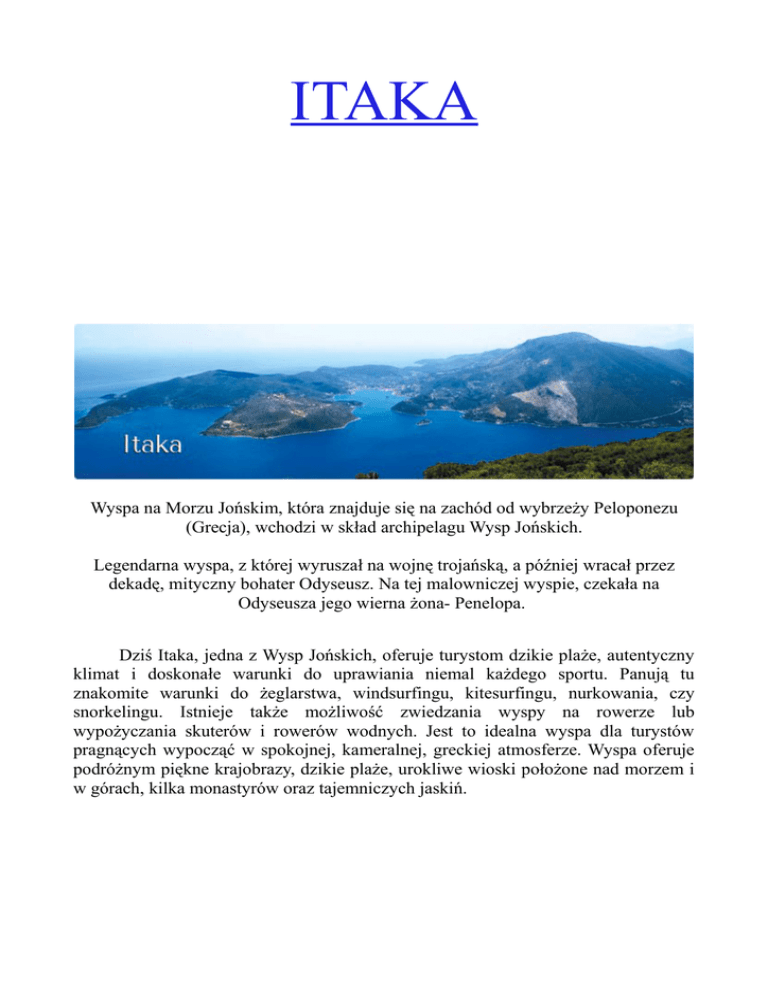 ITAKA Wyspa na Morzu Jońskim, która znajduje się na zachód od wybrzeży Peloponezu (Grecja), wchodzi w skład archipelagu Wysp Jońskich. Legendarna wyspa, z której wyruszał na wojnę trojańską, a później wracał przez dekadę, mityczny bohater Odyseusz. Na tej malowniczej wyspie, czekała na Odyseusza jego wierna żona- Penelopa. Dziś Itaka, jedna z Wysp Jońskich, oferuje turystom dzikie plaże, autentyczny klimat i doskonałe warunki do uprawiania niemal każdego sportu. Panują tu znakomite warunki do żeglarstwa, windsurfingu, kitesurfingu, nurkowania, czy snorkelingu. Istnieje także możliwość zwiedzania wyspy na rowerze lub wypożyczania skuterów i rowerów wodnych. Jest to idealna wyspa dla turystów pragnących wypocząć w spokojnej, kameralnej, greckiej atmosferze. Wyspa oferuje podróżnym piękne krajobrazy, dzikie plaże, urokliwe wioski położone nad morzem i w górach, kilka monastyrów oraz tajemniczych jaskiń. Atrakcje turystyczne: • Itaka słynie z malutkich zatoczek, zacisznych plaż, otoczonych zielonymi górami i krystalicznie czystymi, turkusowymi wodami. najsłynniejsze plaże na wyspie to: Sarakiniko, Dexa Minnímata, Yidaki, Aetos, Aspros Yialos Afáles, Kourvoólia. • Stavros – największa miejscowość w północnej części Itaki z pomnikiem i trasą powrotu Odyseusza do ojczyzny. Malownicze widoki, greckie tawerny i spokojna atmosfera gwarantują udany wypoczynek. • Muzeum Archeologiczne w stolicy Vathi. • Grota nimf – to tu Odyseusz miał ukryć skarby otrzymane od Alkinoosa, króla Feaków. • Kioni – największy kurort na wyspie, amfiteatralnie położony na zboczu wzgórza, słynie z pięknej architektury, najlepszych tawern i ładnej plaży. • Wioska Anogi z punktami widokowymi na piękną okolicę. • Starożytne Alkakomenes – miejsce związane z Odyseuszem. Atrakcje sportowe: • Sporty wodne takie jak: nurkowanie, snorkeling, kajaki na pięknych plażach Sarakiniko, Dexa Minnímata, Yidaki, Aetos, Aspros Yialos Afáles, Kourvoólia VATHI – Stolica wyspy. Malownicza miejscowość w zatoce z portem oraz licznymi lokalnymi sklepikami i tawernami. Z portu rozpościera się piękny widok na malutką wyspę Lazaretto z małą kapliczką. STAVROS – Położona ok. 16 km od Vathi, druga pod względem wielkości miejscowość na wyspie. W okolicy znajdują się dwa stanowiska archeologiczne: cytadela na wzgórzu Pelikata, niewielkie muzeum oraz Szkoła Homera. EKSOGI – Urocza, górska wioska z tradycyjną zabudową, z której rozpościerają się fantastyczne widoki na okoliczne wyspy Morza Jońskiego. ANOGI – Najwyżej położona i najstarsza wioska na wyspie. Oprócz pięknych widoków i starej zabudowy warto odwiedzić XV-wieczny kościół Zaśnięcia Matki Bożej z ciekawymi freskami. FRIKES – Mała malownicza wioska rybacka otoczona zielonymi wzgórzami, z pięknym portem pełnym łodzi rybackich, a w sezonie luksusowych jachtów. Łódką można stąd popłynąć na okoliczne plaże, a promem na Kefalonię lub Lefkadę. KIONI – Najbardziej turystyczna wioska, a jednocześnie jedno z najpiękniejszych miasteczek na Itace. Położone w malowniczej zatoce, ok. 24 km od Vathi, gwarantuje wspaniałe widoki.