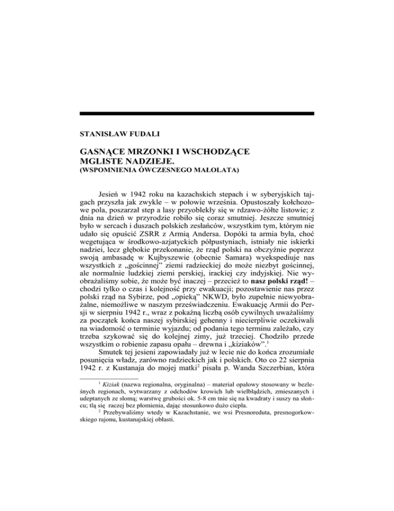 STANISŁAW FUDALI GASNĄCE MRZONKI I WSCHODZĄCE MGLISTE NADZIEJE. (WSPOMNIENIA ÓWCZESNEGO MAŁOLATA) Jesień w 1942 roku na kazachskich stepach i w syberyjskich tajgach przyszła jak zwykle – w połowie września. Opustoszały kołchozowe pola, poszarzał step a lasy przyoblekły się w rdzawo-żółte listowie; z dnia na dzień w przyrodzie robiło się coraz smutniej. Jeszcze smutniej było w sercach i duszach polskich zesłańców, wszystkim tym, którym nie udało się opuścić ZSRR z Armią Andersa. Dopóki ta armia była, choć wegetująca w środkowo-azjatyckich półpustyniach, istniały nie iskierki nadziei, lecz głębokie przekonanie, że rząd polski na obczyźnie poprzez swoją ambasadę w Kujbyszewie (obecnie Samara) wyekspediuje nas wszystkich z „gościnnej” ziemi radzieckiej do może niezbyt gościnnej, ale normalnie ludzkiej ziemi perskiej, irackiej czy indyjskiej. Nie wyobrażaliśmy sobie, że może być inaczej – przecież to nasz polski rząd! – chodzi tylko o czas i kolejność przy ewakuacji; pozostawienie nas przez polski rząd na Sybirze, pod „opieką” NKWD, było zupełnie niewyobrażalne, niemożliwe w naszym przeświadczeniu. Ewakuację Armii do Persji w sierpniu 1942 r., wraz z pokaźną liczbą osób cywilnych uważaliśmy za początek końca naszej sybirskiej gehenny i niecierpliwie oczekiwali na wiadomość o terminie wyjazdu; od podania tego terminu zależało, czy trzeba szykować się do kolejnej zimy, już trzeciej. Chodziło przede wszystkim o robienie zapasu opału – drewna i „kiziaków”.1 Smutek tej jesieni zapowiadały już w lecie nie do końca zrozumiałe posunięcia władz, zarówno radzieckich jak i polskich. Oto co 22 sierpnia 1942 r. z Kustanaja do mojej matki2 pisała p. Wanda Szczerbian, która 1 Kiziak (nazwa regionalna, oryginalna) – materiał opałowy stosowany w bezleśnych regionach, wytwarzany z odchodów krowich lub wielbłądzich, zmieszanych i udeptanych ze słomą; warstwę grubości ok. 5-8 cm tnie się na kwadraty i suszy na słońcu; tlą się raczej bez płomienia, dając stosunkowo dużo ciepła. 2 Przebywaliśmy wtedy w Kazachstanie, we wsi Presnoreduta, presnogorkowskiego rajonu, kustanajskiej obłasti. STANISŁAW FUDALI 64 odważyła się z presnogorkowskiego rajonu wyruszyć do kustanajskiej Delegatury ambasady polskiej w nadziei, że uda się jej wyjechać na południe, do środkowo-azjatyckich republik radzieckich: tu w Kustanaju żyje się tylko nerwami w ciągłej rozterce. […] Kochana Pani! Wiadomość jakoby zostały rozwiązane wszystkie Delegatury na terenie ZSRR i, że wszyscy Polacy mają iść do kołchozów jest fałszywa jak wiele innych wiadomości. Owszem, na rozporządzenie władz polskich zostało rozwiązanych kilka placówek polskich, ale Polaków nigdzie nie wysyłają ani zabierają do kołchozów. Odwrotnie, z Kustanaja co kilka dni wyjeżdża po kilka rodzin na południe, np. 20/VIII wyjechało 36 rodzin, z Kustanaja i poszczególnych posiołków. Ostatnio rejestrowano rodziny wojskowe i wiele innych równiceż na wyjazd. Z tą listą rodzin wyjechał do Jangi-Jul p. por. Szczepaniak, skąd przyśle trebowanie. […] Władze nasze zapewniają nas, że wszyscy pojedziemy „etapami” – inaczej nie mogą nas zabrać. Proszę też pisać prośbę do Dowódcy Sił Zbrojnych w Jangi-Jul z prośbą o przysłanie zapotrzebowania. Ja pisałam taką prośbę, którą złożyłam na ręce jednego z p. oficerów, który przyjechał po swoją rodzinę (sędzia z Brodów). Obiecał solennie, że mi to załatwi. […] My, a raczej ja siedzę tu jeszcze nie zameldowana; o ile nie wyjadę na południe, przeniosę się do pobliskiego kołchozu. Życie w Kustanaju bez pomocy Delegatury, bez stołówki, jest niemożliwe. Najgorsza bolączka to drzewo – 1 m. 1500 rub., litr mleka 30, a co najważniejsze, że w żadnym wypadku nie meldują. Rodziny wojsk. stałych pensji już otrzymywać nie będą – tylko pomoc doraźną. […] My tu w Kustanaju nie tracimy wiary, pewni, że już niedługo, a skończy się nasza niedola. … To ostatnie zacytowane zdanie tego listu nie było nawet pobożnym życzeniem, ani „ku pokrzepieniu serc”, ale banalnym samopocieszeniem, do którego absolutnie nikt nie przywiązywał najmniejszej uwagi, bo na skończenie naszej niedoli nie zanosiło się, co każdy z nas czuł, choć o przyczynach tego nie wiedział. A jeszcze niedawno, parę miesięcy temu, nastrój wśród zesłańców był zgoła inny, diametralnie przeciwny do obecnego. Przepojeni byliśmy nadzieją, i wiele na to wskazywało, że istnieje realna szansa pożegnania na zawsze nieprzyjaznej nam przyrody i wyraźnie nieprzychylnych władz, nie tylko nam, ale i swoim obywatelom. Zdawaliśmy sobie sprawę z tego, że o powrocie w rodzinne strony w obecnej wojennej sytuacji nie może być mowy, ale łudziliśmy się wydostać z ZSRR przez Persję, okupowaną wtedy przez Wk. Brytanię i ZSRR. W porze wiosennych roztopów, 19 kwietnia 1942 r., pisała p. Anda z Kabani 3 do mojej matki: […] dzisiaj pani Bobrowiczowa dostała list od syna, pisze, że my wszyscy wyjedziemy do Persji bez żadnego wyjątku. Pisze, że już by byli nas transportowali, gdyby nie mokro i te błota; czekają, jak tylko będzie tro3 rejonie. Nazwiska p. Andy nie znam, a Kabań – to nazwa wioski w presnogorkowskim Gasnące mrzonkii wschodzące mgliste nadzieje 65 chę sucho, to nas zaraz będą zabierać. […] Wydawało się wtedy, że lada moment, a nie będzie tutaj nas. Pod koniec września zamiast spodziewanego sygnału do wyjazdu zaczęły w stepy i tajgi przenikać przygnębiające wieści: Armia polska w ZSRR już nie istnieje, cywilna ludność z obozów przy Armii, ta, co z wojskiem nie wyszła,4 jest rozmieszczana po kirgizkich, uzbeckich i turkmeńskich kołchozach i sowchozach (mimo że przed miesiącem takim „plotkom” nie dawano wiary), obwodowe delegatury ambasady polskiej o wyjeździe niczego nie mó