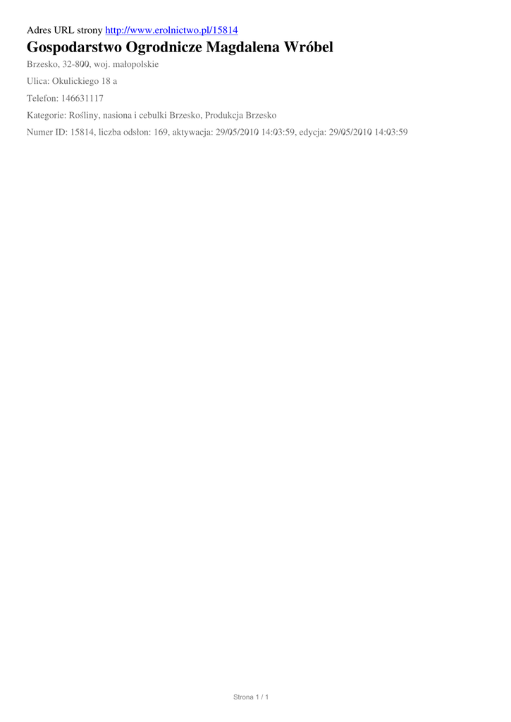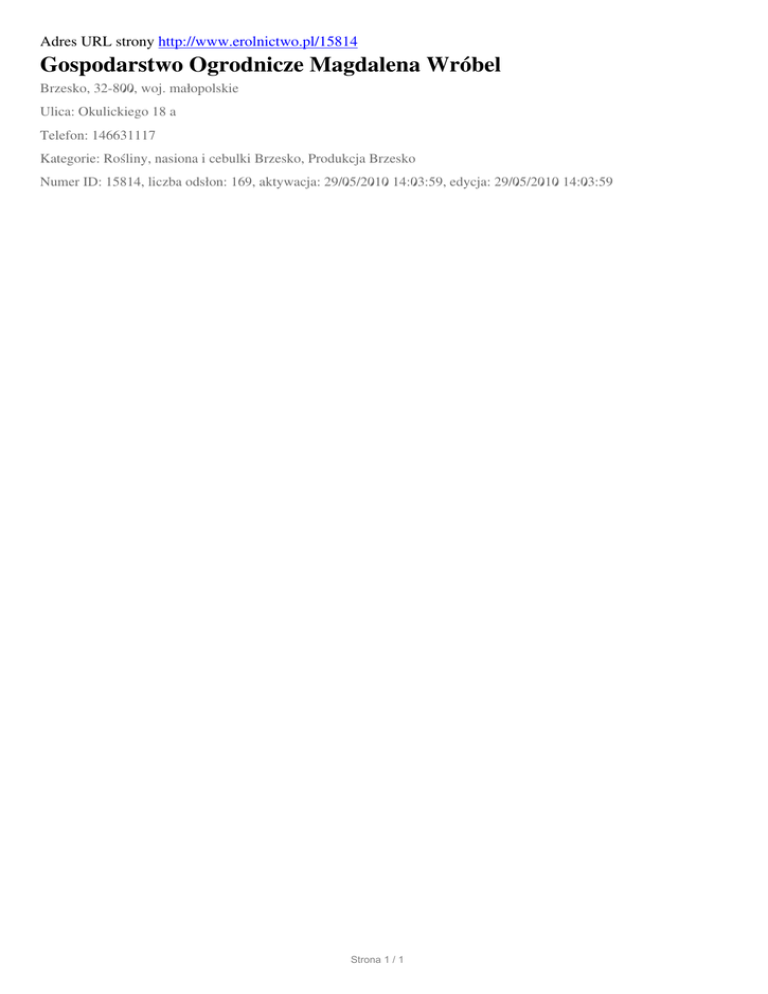 Adres URL strony http://www.erolnictwo.pl/15814 Gospodarstwo Ogrodnicze Magdalena Wróbel Brzesko, 32-800, woj. małopolskie Ulica: Okulickiego 18 a Telefon: 146631117 Kategorie: Rośliny, nasiona i cebulki Brzesko, Produkcja Brzesko Numer ID: 15814, liczba odsłon: 169, aktywacja: 29/05/2010 14:03:59, edycja: 29/05/2010 14:03:59 Strona 1 / 1
