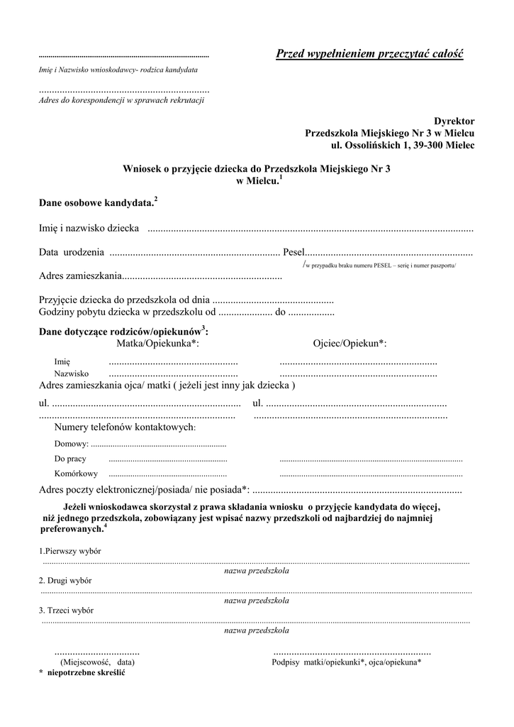 ........................................................................................ Przed wypełnieniem przeczytać całość Imię i Nazwisko wnioskodawcy- rodzica kandydata .................................................................. Adres do korespondencji w sprawach rekrutacji Dyrektor Przedszkola Miejskiego Nr 3 w Mielcu ul. Ossolińskich 1, 39-300 Mielec Wniosek o przyjęcie dziecka do Przedszkola Miejskiego Nr 3 w Mielcu.1 Dane osobowe kandydata.2 Imię i nazwisko dziecka .............................................................................................................................. Data urodzenia .................................................................. Pesel................................................................. /w przypadku braku numeru PESEL – serię i numer paszportu/ Adres zamieszkania.............................................................. Przyjęcie dziecka do przedszkola od dnia ............................................... Godziny pobytu dziecka w przedszkolu od ..................... do .................. Dane dotyczące rodziców/opiekunów3: Matka/Opiekunka*: Ojciec/Opiekun*: Imię Nazwisko .................................................. ............................................................. .................................................. ............................................................. Adres zamieszkania ojca/ matki ( jeżeli jest inny jak dziecka ) ul. ......................................................................... ............................................................................ Numery telefonów kontaktowych: ul. ...................................................................... ........................................................................... Domowy: ............................................................... Do pracy ....................................................... ..................................................................................... Komórkowy ....................................................... ..................................................................................... Adres poczty elektronicznej/posiada/ nie posiada*: ................................................................................. Jeżeli wnioskodawca skorzystał z prawa składania wniosku o przyjęcie kandydata do więcej, niż jednego przedszkola, zobowiązany jest wpisać nazwy przedszkoli od najbardziej do najmniej preferowanych.4 1.Pierwszy wybór ................................................................................................................................................................. ..................................... nazwa przedszkola 2. Drugi wybór ......................................................................................................................................................................................... ............... nazwa przedszkola 3. Trzeci wybór ....................................................................................................................................................................................................... nazwa przedszkola ................................. (Miejscowość, data) * niepotrzebne skreślić ............................................................. Podpisy matki/opiekunki*, ojca/opiekuna* Do wniosku dołącza się: (składane w oryginale, notarialnie poświadczonej kopii albo w postaci urzędowo poświadczonego odpisu lub wyciągu z dokumentu, lub w postaci kopii poświadczonej za zgodność z oryginałem przez rodzica kandydata). Kryteria konstytucyjne 1) oświadczenie o wielodzietności rodziny kandydata / 3 i więcej dzieci /, 2) orzeczenie o potrzebie kształcenia specjalnego wydane ze względu na niepełnosprawność, orzeczenie o niepełnosprawności lub stopniu o stopniu niepełnosprawności równoważne w rozumieniu przepisów ustawy z dnia 27 sierpnia 1997 r. o rehabilitacji zawodowej i społecznej oraz zatrudnianiu osób niepełnosprawnych ( Dz. U. z 2011 r. Nr127, poz.721, z późn. zm.) 3) prawomocny wyrok sądu rodzinnego orzekający rozwód lub separację lub akt zgonu oraz oświadczenie o samotnym wychowywaniu dziecka oraz niewychowywaniu żadnego dziecka wspólnie z jego rodzicem. 4) dokument poświadczający objęcie dziecka pieczą zastępczą zgodnie z ustawą z dnia 9 czerwca 2011 r. o wspieraniu rodziny i systemie pieczy zastępczej ( Dz. U. z 2013 r. poz.135, ze zm.) Kryteria społeczne 1) oświadczenie o zatrudnieniu/ nauce lub prowadzeniu gospodarstwa rolnego albo pozarolniczej działalności obojga rodziców lub samotnego rodzica, 2) oświadczenie rodzica o rodzeństwie uczęszczającym do przedszkola, najbliższej szkoły, 3) ZAP-3 z Urzędu Skarbowego / dotyczy nie zameldowanych w Mielcu / lub ksero I strony PIT. Przed wypełnieniem przeczytać całość ____________________________________________________________________________________________ 1 Zgodnie z art.20a ustawy o systemie oświaty, postępowanie rekrutacyjne jest prowadzone na wniosek rodzica kandydata. 2 Zgodnie z art20t ust.1 ustawy o systemie oświaty, wniosek zawiera dane obowiązkowe. 3 Zgodnie z art20c ust, 1 ustawy o systemie oświaty, do publicznego przedszkola przyjmuje się kandydata, którego rodzice/ prawni opiekunowie mieszkają na obszarze danej gminy tzn. wykazani są w rejestrze ewidencji ludności danej gminy ( zameldowani ) lub zamieszkują na terenie Gminy z zamiarem stałego pobytu i płacą podatki na rzecz Gminy Miejskiej Mielec. 4 Zgodnie z art.20za ust. 1 ustawy o systemie oświaty, wniosek o przyjęcie do publicznego przedszkola, może być złożony do nie więcej niż trzech wybranych przedszkoli. Zgodnie z art. 20t ust.1 pkt. 5 ustawy o systemie oświaty, wniosek zawiera wskazanie kolejnych wybranych przedszkoli, w porządku od najbardziej do najmniej preferowanych. To oznacza, że wnioskodawca jest zobow