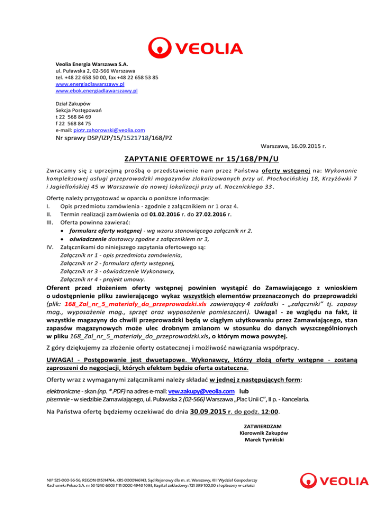 Veolia Energia Warszawa S.A. ul. Puławska 2, 02-566 Warszawa tel. +48 22 658 50 00, fax +48 22 658 53 85 www.energiadlawarszawy.pl www.ebok.energiadlawarszawy.pl Dział Zakupów Sekcja Postępowań t 22 568 84 69 f 22 568 84 75 e-mail: [email protected] Nr sprawy DSP/IZP/15/1521718/168/PZ Warszawa, 16.09.2015 r. ZAPYTANIE OFERTOWE nr 15/168/PN/U Zwracamy się z uprzejmą prośbą o przedstawienie nam przez Państwa oferty wstępnej na: Wykonanie kompleksowej usługi przeprowadzki magazynów zlokalizowanych przy ul. Płochocińskiej 18, Krzyżówki 7 i Jagiellońskiej 45 w Warszawie do nowej lokalizacji przy ul. Nocznickiego 33 . Ofertę należy przygotować w oparciu o poniższe informacje: I. Opis przedmiotu zamówienia - zgodnie z załącznikiem nr 1 oraz 4. II. Termin realizacji zamówienia od 01.02.2016 r. do 27.02.2016 r. III. Oferta powinna zawierać: formularz oferty wstępnej - wg wzoru stanowiącego załącznik nr 2. oświadczenie dostawcy zgodne z załącznikiem nr 3, IV. Załącznikami do niniejszego zapytania ofertowego są: Załącznik nr 1 - opis przedmiotu zamówienia, Załącznik nr 2 - formularz oferty wstępnej, Załącznik nr 3 - oświadczenie Wykonawcy, Załącznik nr 4 - projekt umowy. Oferent przed złożeniem oferty wstępnej powinien wystąpić do Zamawiającego z wnioskiem o udostępnienie pliku zawierającego wykaz wszystkich elementów przeznaczonych do przeprowadzki (plik: 168_Zal_nr_5_materiały_do_przeprowadzki.xls zawierający 4 zakładki - „załączniki” tj. zapasy mag., wyposażenie mag., sprzęt oraz wyposażenie pomieszczeń). Uwaga! - ze względu na fakt, iż wszystkie magazyny do chwili przeprowadzki będą w ciągłym użytkowaniu przez Zamawiającego, stan zapasów magazynowych może ulec drobnym zmianom w stosunku do danych wyszczególnionych w pliku 168_Zal_nr_5_materiały_do_przeprowadzki.xls, o którym mowa powyżej. Z góry dziękujemy za złożenie oferty ostatecznej i możliwość nawiązania współpracy. UWAGA! - Postępowanie jest dwuetapowe. Wykonawcy, którzy złożą oferty wstępne - zostaną zaproszeni do negocjacji, których efektem będzie oferta ostateczna. Oferty wraz z wymaganymi załącznikami należy składać w jednej z następujących form: elektroniczne - skan (np. *.PDF) na adres e-mail: [email protected] lub pisemnie - w siedzibie Zamawiającego, ul. Puławska 2 (02-566) Warszawa „Plac Unii C”, II p. - Kancelaria. Na Państwa ofertę będziemy oczekiwać do dnia 30.09.2015 r. do godz. 12:00. ZATWIERDZAM Kierownik Zakupów Marek Tymiński