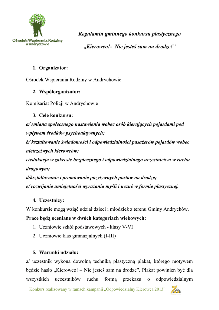Regulamin gminnego konkursu plastycznego „Kierowco!- Nie jesteś sam na drodze!” 1. Organizator: Ośrodek Wspierania Rodziny w Andrychowie 2. Współorganizator: Komisariat Policji w Andrychowie 3. Cele konkursu: a/ zmiana społecznego nastawienia wobec osób kierujących pojazdami pod wpływem środków psychoaktywnych; b/ kształtowanie świadomości i odpowiedzialności pasażerów pojazdów wobec nietrzeźwych kierowców; c/edukacja w zakresie bezpiecznego i odpowiedzialnego uczestnictwa w ruchu drogowym; d/kształtowanie i promowanie pozytywnych postaw na drodze; e/ rozwijanie umiejętności wyrażania myśli i uczuć w formie plastycznej. 4. Uczestnicy: W konkursie mogą wziąć udział dzieci i młodzież z terenu Gminy Andrychów. Prace będą oceniane w dwóch kategoriach wiekowych: 1. Uczniowie szkół podstawowych - klasy V-VI 2. Uczniowie klas gimnazjalnych (I-III) 5. Warunki udziału: a/ uczestnik wykona dowolną techniką plastyczną plakat, którego motywem będzie hasło „Kierowco! – Nie jesteś sam na drodze”. Plakat powinien być dla wszystkich uczestników ruchu formą przekazu o odpowiedzialnym Konkurs realizowany w ramach kampanii „Odpowiedzialny Kierowca 2013” 2 i bezpiecznym poruszaniu się na drodze, jazdą bez użycia substancji psychoaktywnych; b/ format pracy minimum A3; c/ prace nadesłane na konkurs muszą mieć dołączoną kartę zgłoszenia załącznik nr 1; d/ prace zniszczone lub zrolowane nie będą oceniane; f/ prace nie mogą być oprawione; g/ prace nadesłane na konkurs muszą być pracami własnymi, nigdzie wcześniej niepublikowanymi i nie przedstawianymi na innych konkursach. Złożenie pracy na konkurs jest jednoznaczne ze złożeniem deklaracji o tych faktach; h/ prace niezgodne z regulaminem nie będą oceniane; i/ w pracach nie mogą być używane nazwy żadnych napojów alkoholowych; j/ Organizator nie ponosi odpowiedzialności za prace, które nie dotarły do niego z przyczyn niezależnych, m.in. wskutek zaniedbań Poczty Polskiej lub firm kurierskich; k/ Organizator nie ponosi odpowiedzialności za podanie nieprawdziwych danych lub danych osób trzecich przez Uczestników. Podanie nieprawdziwych danych skutkuje odebraniem uczestnikowi prawa do nagrody; 6. Termin nadsyłania prac: Parce wykonane zgodnie z wymogami regulaminu należy przekazać lub przesłać w opakowaniu zapewniającym bezpieczne dotarcie przesyłki do dnia 29 listopada 2013 r. na adres: Ośrodek Wspierania Rodziny w Andrychowie, ul. Metalowców 10, 34-120 Andrychów. 7. Ocena prac: Komisja Konkursowa dokona oceny prac przyznając nagrody, wyróżnienia i kwalifikując prace na wystawę pokonkursową. Kryteriami oceny prac będą: zgodność doboru tematu pracy z celami konkursu, Konkurs realizowany w ramach kampanii „Odpowiedzialny Kierowca 2013” 3 oryginalność, dobór środków i techniki plastycznej, walory artystyczne: kompozycja, gama wykonania. Decyzje Komisji Konkursowej są ostateczne. kolorystyczna, technika 8. Nagrody: a/ Nagrody będą miały formę książkową oraz elementów odblaskowych. b/ Planuje się publikacje najlepszych prac na stronie internetowej Organizatora. c/ Opiekunowie nagrodzonych laureatów, otrzymają odpowiednie zaświadczenie. 9. Ogłoszenie wyników, wręczenie nagród laureatom: Laureaci zostaną powiadomieni telefonicznie o wynikach konkursu. Informacja dodatkowo zostanie zamieszczona na stronie organizatora. Wręczenie nagród nastąpi w grudniu 2013 roku. Uwagi: Biorąc udział w konkursie uczestnicy akceptują zasady konkursu zawarte w regulaminie. 10. Postanowienia końcowe: a/ regulamin konkursu jest dostępny na stronie internetowej www.owr.andrychow.pl; b/ Organizator zastrzega sobie prawo publikowania i reprodukowania prac bez wypłacania honorariów autorskich. Nagrodzone prace przechodzą na własność organizatora. Każdy biorący udział w konkursie, nadsyłając pracę konkursową, wyraża zgodę na wykorzystanie i przetwarzania danych osobowych w celach publikacji listy laureatów oraz podania autorstwa pracy konkursowej; c/ każdy biorący udział w konkursie akceptuje warunki niniejszego regulaminu. . Informacje o konkursie można uzyskać telefonicznie: 33 875 24 29 w godz. od 8:00 -15:00 Konkurs realizowany w ramach kampanii „Odpowiedzialny Kierowca 2013” 4 Załącznik nr 1 Karta zgłoszenia uczestnika do konkursu plastycznego „Kierowco!- Nie jesteś sam na drodze!” Imię i nazwisko autora: ………………………………………………………..………. Klasa (właściwe zaznaczyć X): V SP I Gimnazjum VI SP II Gimnazjum III Gimnazjum Adres do korespondencji:…………………………………….………………………… Szkoła, placówka………………………………………………………………….………. Opiekun artystyczny …………………………………………………………………….. Telefon (stacjonarny i komórkowy): ……………..…………………………………… Oświadczenia Rodzica/Opiekuna Prawnego 1. Wyrażam zgodę na przetwarzanie danych osobowych mojego dziecka zgodnie z ustawą z dnia 29.08.1997 r. o ochronie danych osobowych (Tekst jedn. Dz. U. Z 2002 r, Nr 101, poz. 926 z późn. zm.) przez Organizatora Konkursu dla celów związanych z przeprowadzeniem i rozstrzygnięciem Konkursu, w tym na ich opublikowanie w środkach masowego przekazu. 2. Zapoznałam/em się z Regulaminem Konkursu i akceptuję wszelkie zawarte w nim postanowienia. ............................................... Miejscowość , data ………………………………………………….. Czytelny podpis rodzica/opiekuna prawnego Konkurs realizowany w ramach kampanii „Odpowiedzialny Kierowca 2013”