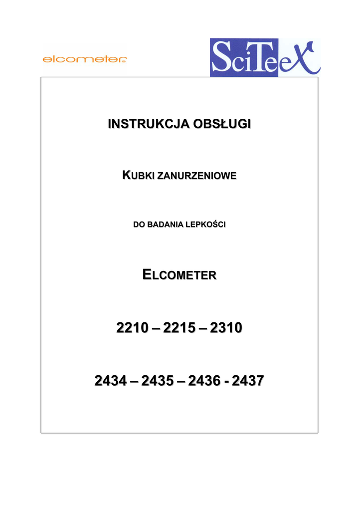 INSTRUKCJA OBSŁUGI KUBKI ZANURZENIOWE DO BADANIA LEPKOŚCI ELCOMETER 2210 – 2215 – 2310 2434 – 2435 – 2436 - 2437 SPIS TREŚCI 1 Wiadomości ogólne 2 2 Wykonywanie pomiarów 3 3 Przeliczanie lepkości 6 4 Przechowywanie 7 5 Obsługa 7 6 Akcesoria 7 7 Specyfikacja techniczna 7 8 Wyposażenie powiązane 8 9 Oleje do kalibracji – specyfikacja 8 10 Kubki zanurzeniowe - specyfikacja 9 SciTeeX Sp z o.o. 2 Kubki wypływowe - zanurzeniowe 1. WIADOMOŚCI OGÓLNE Zanurzeniowe kubki oferowane przez Elcometer są przyrządami prostymi w użyciu służącymi do szybkiego określania lepkości płynów. Kubek, trzymany za rękojeść jest zanurzany w płynie, którego lepkość chcemy zmierzyć. Po wyjęciu kubka z cieczy mierzony jest czas jej wypływu przez kalibrowany otwór w dnie kubka. Mierzona lepkość kinematyczna jest wyrażana w sekundach czasy wypływu i może być przeliczana na Centistokesy (cSt) Elcometer oferuje szeroki zakres kubków z różnymi średnicami kalibrowanych otworów, umożliwiającymi badanie lepkości w zakresie 2 cSt – 1840 cSt. 1.1. Zakres instrukcji Niniejsza instrukcja opisuje sposoby pomiarów wykonywane z następującymi modelami kubków zanurzeniowych Elcometer: • • • • Elcometer 2210: kubek Zahn Elcometer 2215: kubek Lory LCH Elcometer 2310: kubek Shell Elcometer 2434/5/6/7: kubek Frikmar 1.2. Normy Kubki zanurzeniowe Elcometer są wykonane zgodnie z wymogami wielu norm narodowych i międzynarodowych. Pełna lista norm i odpowiadających im kubków jest podana w p. 10: Kubki zanurzeniowe – specyfikacja. 1.3. Zakres dostawy • • • Kubek zanurzeniowy z rękojeścią Instrukcja obsługi Opakowanie 1.4. Uwaga Należy zachować szczególną ostrożność przy używaniu kubka. Uszkodzenie kalibrowanego otworu lub wewnętrznej powierzchni kubka może zniekształcić odczyty i spowodować konieczność jego wymiany. SciTeeX Sp z o.o. 3 Kubki wypływowe - zanurzeniowe 2. WYKONYWANIE POMIARÓW 2.1. • • • • 2.2. Przed rozpoczęciem. Wybrać kubek z czasem wypływu mieszczącym się w przedziale 30 – 100 s. Upewnić się, że uchwyt, kubek i otwór wypływowy są czyste i bez uszkodzeń Badany płyn musi być jednorodny oraz nie może zawierać żadnych pęcherzy Zmierzyć i zapisać temperaturę badanego płynu Sposób postępowania. 1. Zanurzyć całkowicie kubek w badanej cieczy i obrócić nim kilkakrotnie, aby zlikwidować ew. pęcherze mogące powstać na wewnętrznej ściance kubka (rys 1,A.) 2. Poruszyć delikatnie cieczą, aby zapewnić jednolitą temperaturę i gęstość. 3. Pozostawić kubek w badanej cieczy przez czas od 1 min do 5 min: W przypadku kubka typu Zahn (mała masa) wystarczy czas ok. 1 min w przypadku kubków o większej masie czas zanurzenia powinien wynosić ok. 5 min. 4. Podnieść kubek pionowo do góry ponad ciecz (Rys 1,B) i włączyć stoper w momencie, gdy górna krawędź kubka pojawi się ponad powierzchnią cieczy. 5. Obserwować strumień wypływającej przez kalibrowany otwór cieczy i wyłączyć stoper w momencie przerwania strugi. SciTeeX Sp z o.o. 4 Kubki wypływowe - zanurzeniowe W przypadku stosowania kubka zanurzeniowego Lory LCH (Elcometer 2215), stoper należy wyłączyć w momencie pojawienia się nad powierzchnią wypływającej z kubka cieczy, czubka iglicy. 2.3. Po zakończeniu testu. Wyczyścić miernik i całe oprzyrządowanie. Nie używać do czyszczenia drucianych szczotek, metalowych skrobaków ani innych metalicznych narzędzi w celu czyszczenia kubka Czyścić kubek i całe oprzyrządowanie stosując właściwe dla badanej cieczy rozpuszczalniki. Po wyczyszczeniu sprawdzić czy nie zostały resztki badanego materiału i czy kubek jest suchy. SciTeeX Sp z o.o. 5 Kubki wypływowe - zanurzeniowe 3. PRZELICZANIE LEPKOŚCI Lepkość kinematyczna jest określana przy pomocy kubków wypływach w sekundach czasy wypływu. Czas ten może być przeliczony na jednostki lepkości kinematycznej – Centitokesy (cSt). Aby dokonać w prosty sposób prawidłowego przeliczenia należy zastosować krążek przeliczeniowy: Elcometer 2400 – p. str. 8: „Wyposażenie powiązane” Inna metodą jest wykorzystanie wzoru: V = K (t–c) Gdzie: V = lepkość kinematyczna [cSt (mm2/s)] t = zmierzony czas wypływu [sek] K i c: wartości stałe z tabeli: Rodzaj kubka Zahn 1 a Zahn 2 a Zahn 3 a Zahn 4 a Zahn 5 a Shell 1 Shell 2 Shell 2 ½ Shell 3 Shell 3 ½ Shell 4 Shell 5 Shell 6 K 1,1. 3,5 11,7 14,8 23 0,226 0,576 0,925 1,51 2,17 3,45 6,5 16,2 c 29 14 7,5 5 0 13 5 3 2 1,5 1 1 0,5 Uwaga: • Wzór traktuje kubki jako liniowe, pomimo, że takie nie są. • Wzór jest słuszny dla czasów wypływu pomiędzy 20 – 80 sek b a. T.C. Patton : Paint Flow and Pigment Dispersion. Wydanie II: John Wiley&Sons, New York; 1979 – str 82 b. Kubek Zahn 1: wzór jest słuszny dla czasów w przedziale 35 – 80 sek. SciTeeX Sp z o.o. 6 Kubki wypływowe - zanurzeniowe 4. PRZECHOWYWANIE Podczas przerw w używaniu kubka należy zawsze przechowywać go w opakowaniu. 5. OBSŁUGA Kubki do badania lepkości produkcji Elcometer są przewidziane do wieloletniego używania w normalnych warunkach pracy i przechowywania. Regularne sprawdzanie kalibracji w czasie stosowania jest określane wymogami ujętymi w przepisach m.in. ISO 9000 lub innych normach. Aby sprawdzić stopień zużycia kubka należy przy pomocy oleju kalibracyjnego c sprawdzić czas wypływu. W przypadku stwierdzenia uszkodzenia, należy skontaktować się z firmą Elcometer lub jej przedstawicielem. 6. AKCESORIA Certyfikat kalibracji Certyfikat kalibracji jest dostarczany na żądanie podczas składania zamówienia. 7. SPECYFIKACJA TECHNICZNA Materiały Elcometer 2210 Zahn, 2215 Lory LCH i 2310 Shell: Stal nierdzewna Elcometer 2434 /5 /6 /7: Frikmar: Anodyzowane aluminium Opakowanie Kubki są dostarczane w opakowaniach w tworzywa sztucznego i dodatkowo chronione gąbką c. Patrz „Oleje do kalibracji – specyfikacja” str 8 SciTeeX Sp z o.o. 7 Kubki wypływow
