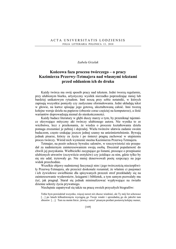 ACTA UNIVERSITATIS LODZIENSIS FOLIA LITTERARIA POLONICA 13, 2010 Izabela Grzelak Końcowa faza procesu twórczego – o pracy Kazimierza Przerwy-Tetmajera nad własnymi tekstami przed oddaniem ich do druku Każdy twórca ma swój sposób pracy nad tekstem. Jedni tworzą regularnie, przy ulubionym biurku, artystyczny wysiłek nierzadko poprzedzając mniej lub bardziej unikatowym rytuałem. Inni noszą przy sobie notatniki, w których zapisują wszystkie pomysły czy zasłyszane sformułowania. Jedni układają tekst w głowie, na kartce spisując jego gotową, ukształtowaną całość. Inni tworzą kolejne wersje dzieła na papierze (obecnie coraz częściej na komputerze), a ilość wariantów doprowadzają niemal do nieskończoności. Każdy badacz literatury w głębi duszy marzy o tym, by przeniknąć tajemnice okrywające mityczny akt twórczy ulubionego autora. Nie wynika to ze wścibstwa, lecz z przekonania, że wiedza o procesie kształtowania dzieła pomaga zrozumieć je pełniej i dojrzalej. Wielu twórców ułatwia zadanie swoim badaczom, często szukając jeszcze jednej szansy na unieśmiertelnienie. Bywają jednak pisarze, którzy za życia i po śmierci pragną zachować w utajnieniu proces twórczy. Wśród nich wymienić można Kazimierza Przerwę-Tetmajera. Tetmajer, na pozór ochoczy bywalec salonów, w rzeczywistości nie przepadał za nadmiernym zainteresowaniem swoją osobą. Doceniał popularność do chwili jej pozyskania. Wielbicielki zasypujące go listami, proszące o przepisanie ulubionych utworów (oczywiście erotyków) czy jeżdżące za nim, gdzie tylko by się nie udał, irytowały go. Nie mniej denerwowali poetę szepczący na jego widok przechodnie. Wszelkie objawy nadmiernej fascynacji nim i jego twórczością niecierpliwiły Przerwę-Tetmajera, ale przecież doskonale rozumiał, że właśnie ci pasjonaci i ich żywiołowe uwielbienie dla spisywanych przezeń strof przekładały się na zainteresowanie wydawnictw, księgarni i bibliotek, a tym samym pozwalały mu żyć, jak pragnął. Starał się jednak minimalizować wypływające na światło dzienne sekrety życia prywatnego. Niechętnie zapatrywał się także na pracę swoich przyszłych biografów: Tobie bym powiedział wszystko, więcej nawet niż chcesz wiedzieć, ale Ty mój list schowasz […] po latach kilkudziesięciu wyciągną go Twoje wnuki i sprzedadzą go do jakichś tam zbiorów […]. Tam na moim liście „krwią z serca” pisanym profani postawią kolejny numer, [169] 170 Izabela Grzelak wpiszą w katalog i będą dawali do czytania każdemu chętnemu dowiedzenia się czegoś o mnie-człowieku, o mnie-synu, o mnie-przyjacielu, o mnie-kochanku, o mnie-twórcy. A ja nie lubię, jak mi tak wdzierają się pod podszewkę i już teraz, jak mogę, zabezpieczam się przed przyszłym oglądaniem mnie pod światło. Nie, nic Ci nie napiszę, nigdy nie dojdzie nikt więcej ponad to, co ja chcę, by o mnie wiedziano1. Nie tylko świadomie komponował korespondencję, by jak najmniej powiedziała o życiu autora. Także celowo kreował się w niej, przeciwdziałając przyszłemu „wdzieraniu się pod podszewkę”. Taka zapobiegliwość może zastanawiać. Bo skąd Tetmajer miał pewność, że ktoś będzie chciał się o nim w przyszłości czegoś dowiedzieć? Niewątpliwie zainteresowanie, jakie wzbudzał u współczesnych, mogło nasuwać odpowiednie przypuszczenia. Nadto był przedstawicielem pokolenia, które oczarowane życiem wielu sławnych poprzedników eksplorowało sferę ich intymistyki. A jednak powstała w 1897 roku plotkarska biografia Słowackiego autorstwa Ferdynanda Hoesicka nie przypadła Przerwie-Tetmajerowi do gustu2. Może stanowisko poety byłoby inne, gdyby potrafił przewidzieć przyszłość: zarówno szybki kres własnej sławy, jak i wojnę, kiedy większość pozostałych po nim pamiątek i dokumentów spłonęła lub bezpowrotnie zaginęła. W rezultacie przetrwało niedużo materiałów, które mogłyby pomóc w scharakteryzowaniu procesu twórczego Tetmajera i jego pracy nad tekstem. Zachowało się niewiele rękopisów Tetmajera – Nowy Korbut wymienia tylko egzemplarz teatralny Sfinksa z poprawkami autora, szkic Objaśnienia do olbrzymiego obrazu „Tatry” (opisujący obraz Ludwika Bollera i Stanisława Janowskiego), Wizję okrętu i kilka wierszy3. Krystyna Jabłońska podaje, że „zachowały się jedynie […] rękopisy noweli Na marne oraz fragmenty powieści Gra fal i Walka”4. Te sprzeczne wzmianki wymagają gruntownego sprawdzenia. Z pewnością, wbrew informacjom Nowego Korbuta, zachował się manuskrypt opatrzony tytułem Na marne5. Zaraz za stroną tytułową znajduje się jednak inny tytuł, pod którym tekst jest znany, mianowicie Rzeźbiarz Merten. Ową nieścisłość można wyjaśnić następująco: Rzeźbiarz Merten to jakby podtytuł, o czym świadczy fakt, że na drugiej stronie rękopisu pojawia się on poniżej tytułu Na 1 List Kazimierza Przerwy-Tetmajera do Zofii Gabińskiej z 27 II 1902. Cyt. wg: Miałem kiedyś przyjaciół. Wspomnienia o Kazimierzu Tetmajerze, oprac. K. Jabłońska, Kraków 1972, s. 6. 2 Zob. K. P r z e r w a - T e t m a j e r, O życiu Juliusza Słowackiego [rec. Życia Juliusza Słowackiego na tle współczesnej epoki: biografii psychologicznej Ferdynanda Hoesicka], „Tygodnik Ilustrowany” 1898, nr 27, s. 525–528. 3 Zob. Literatura pozytywizmu i Młodej Polski: hasła osobowe T–Ż, uzupełnienia haseł osobowych t. 13–15. Nowy Korbut, t. 16, oprac. zespół pod kierownictwem Z. Szweykowskiego i J. Maciejewskiego, Warszawa 1980, s. 32, 33, 35–37, 41. 4 Miałem kiedyś przyjaciół…, s. 6. Zastanawiające, że K. Jabłońska nie wymieniła Wizji okrętu, skoro tekst ten znajduje się w zbiorach PAN w Krakowie pod wspólną sygnaturą (2480) z Na marne (Rzeźbiarzem Mertenem). 5 Identyczny tytuł nosiła debiutancka powieść Henryka Sienkiewicza. Końcowa faza procesu twórczego – o pracy Kaz